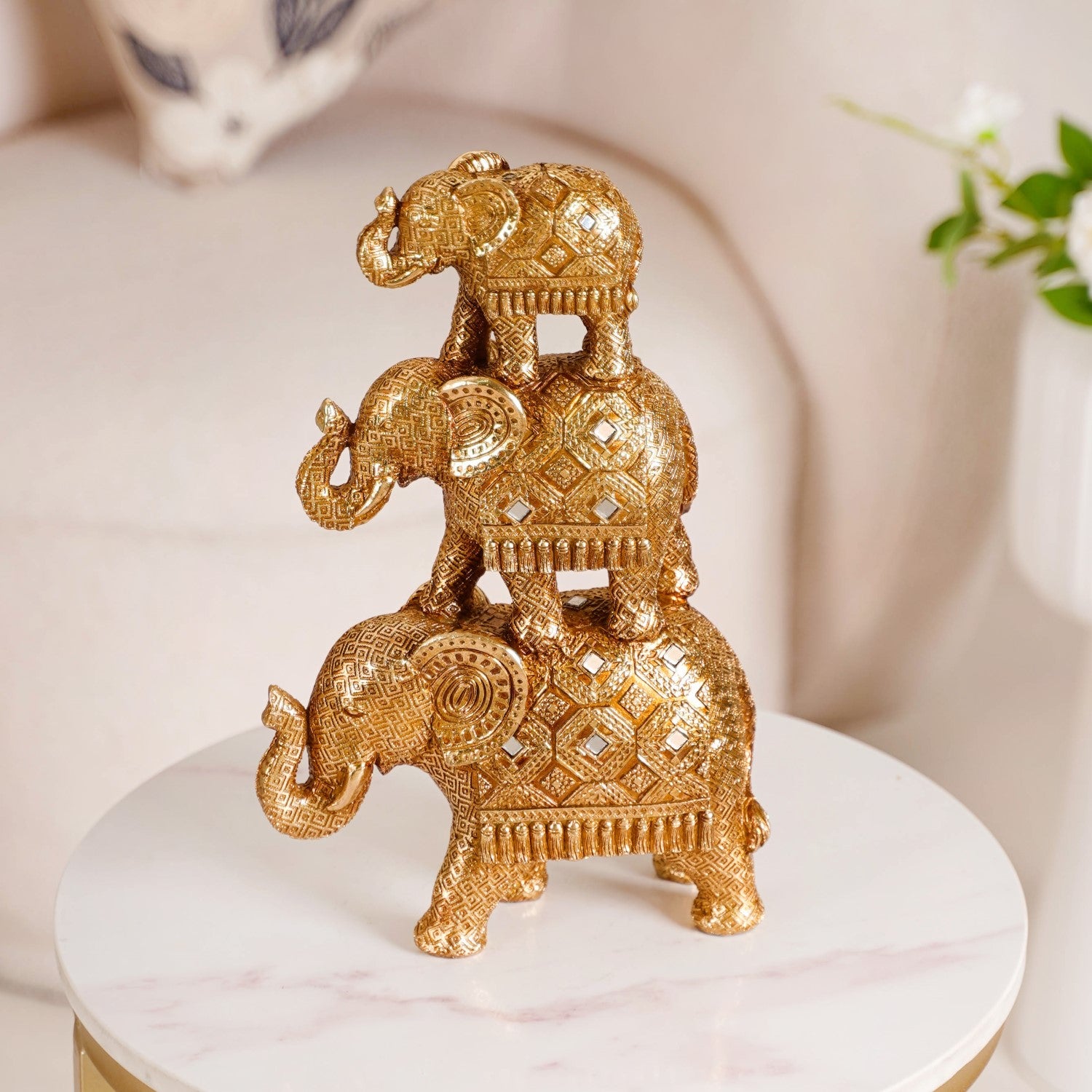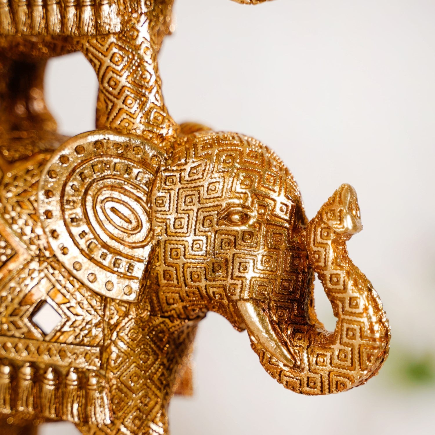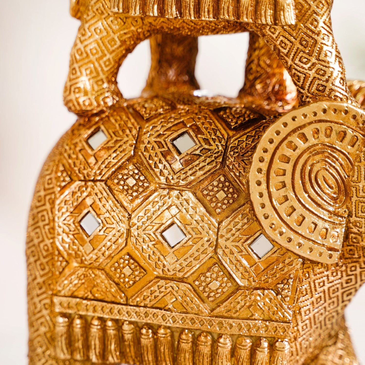 This showpiece is unique due to its majestic design featuring three regal elephants stacked gracefully atop one another. The radiant golden hue and intricate patola patterns, combined with mirrorwork detailing, make it a standout piece that exudes opulence and cultural artistry.
