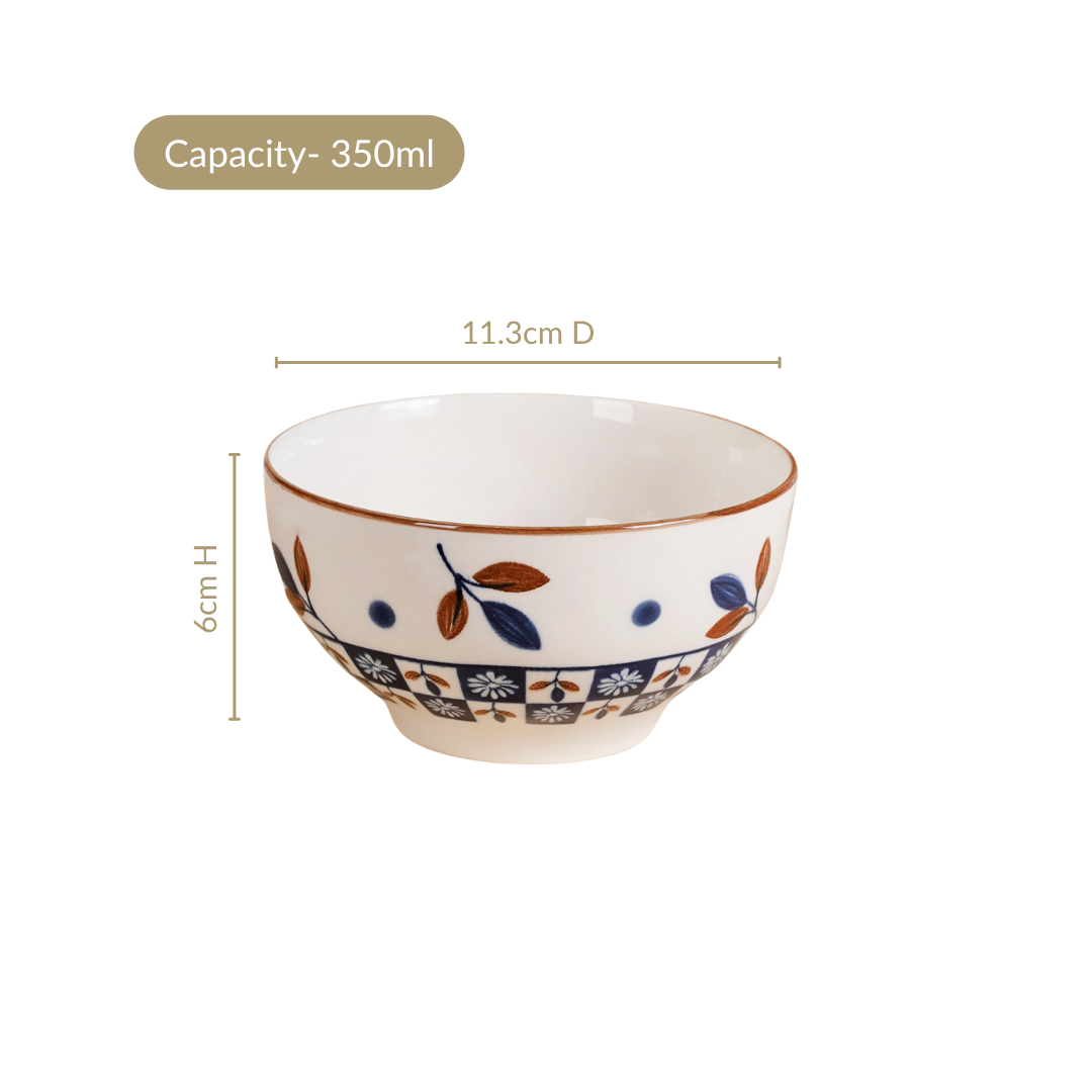 Design: Inspired by intricate geometric & floral designs, each bowl showcases a unique indigo pattern against a smooth white ceramic base. Crafted from premium ceramic, the bowls feature a fine glaze for lasting shine and durability. The subtle brown rim and base detailing add warmth, giving the set an artisanal appeal.