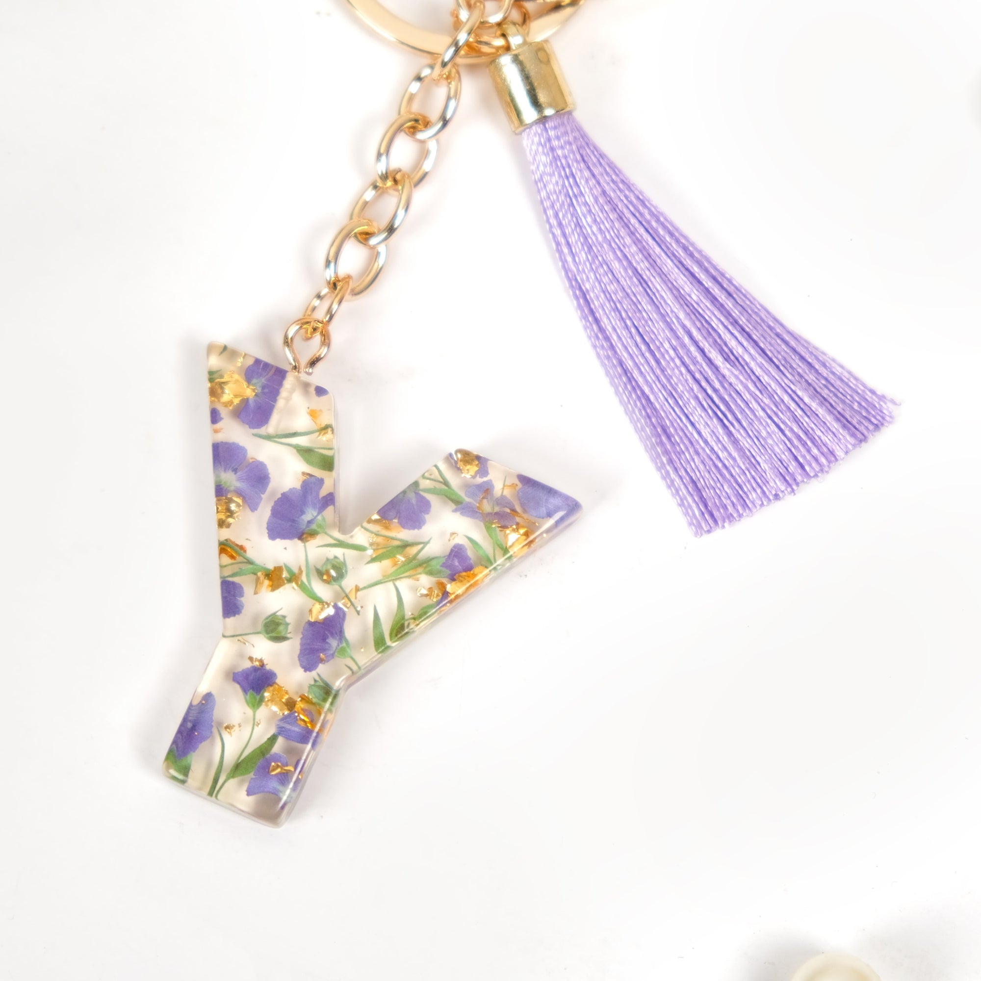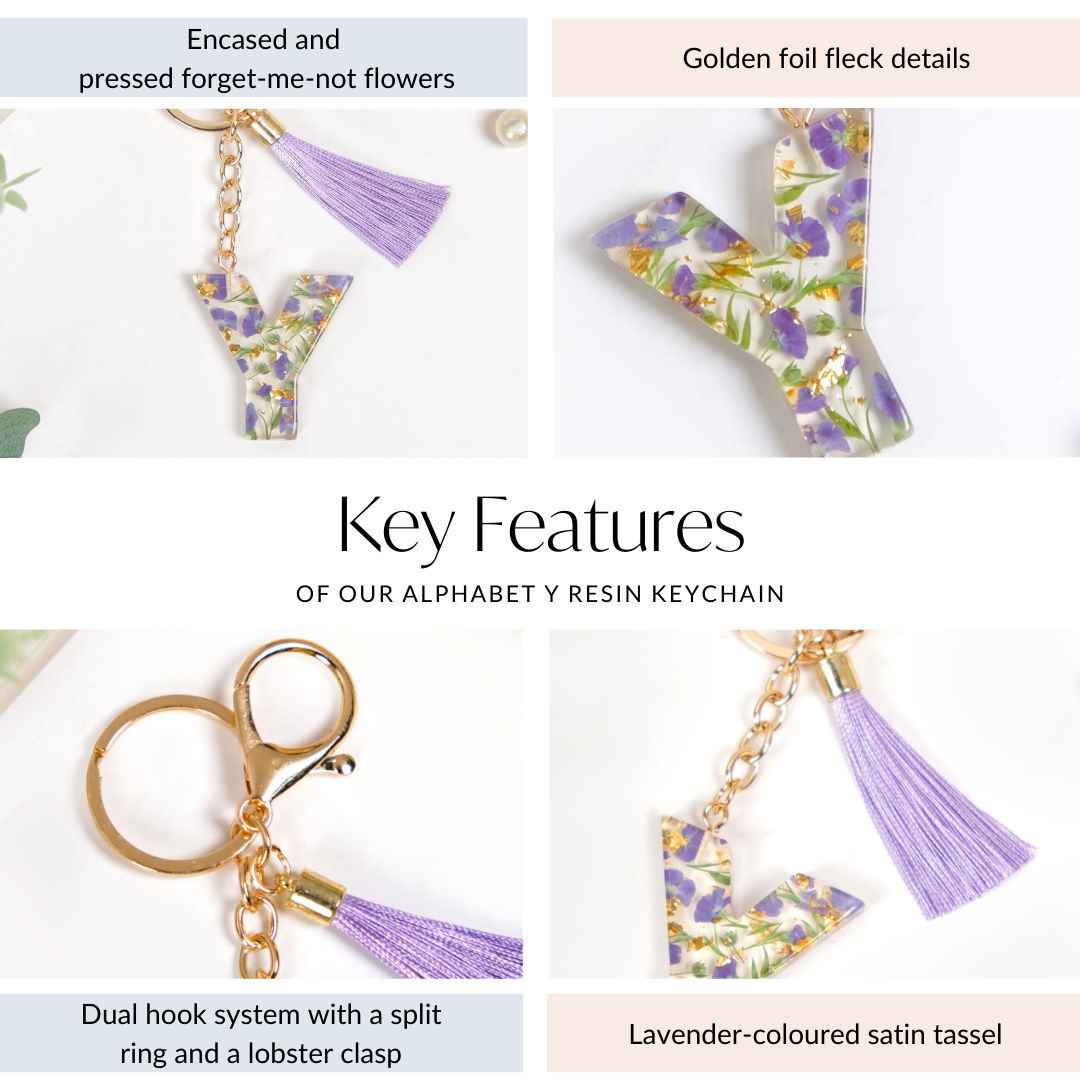 Add a touch of elegance with the "Y" resin keyring, featuring delicate pressed lavender forget-me-not flowers (Myosotis) encased in transparent resin. The golden flecks bring a gentle sparkle to the design, while a chic satin tassel adds both charm and practicality.