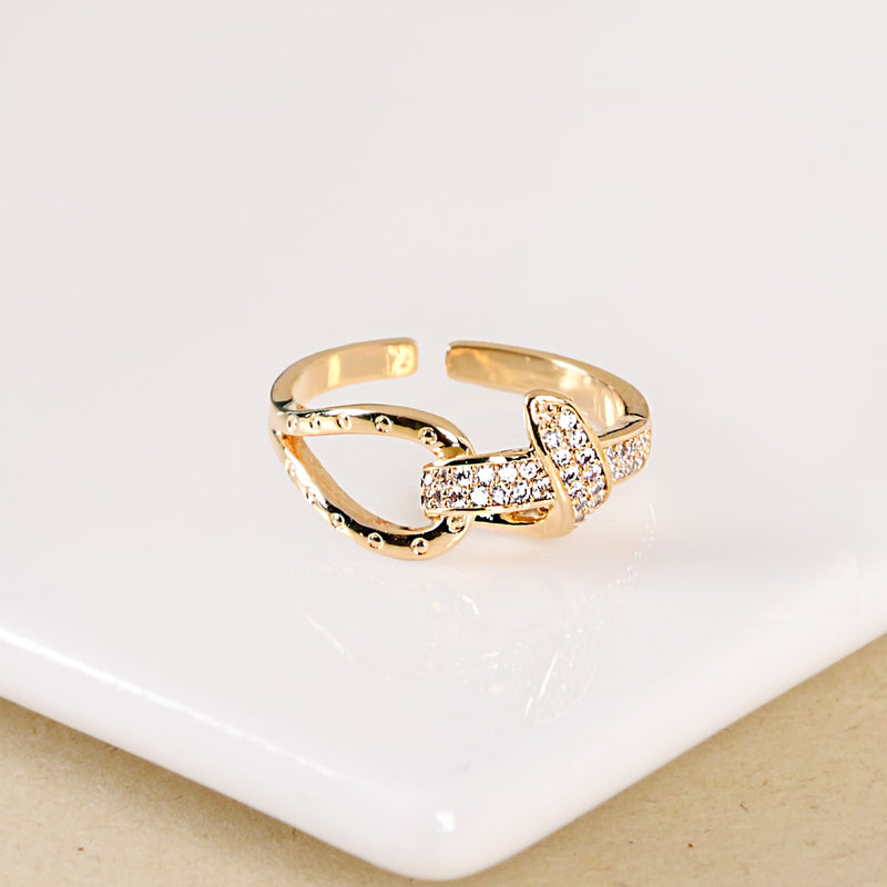 A sleek fusion of elegance and symbolism, this gold-toned adjustable ring showcases an abstract infinity symbol, representing endless possibilities. The flowing loop is adorned with shimmering stones, adding a touch of brilliance to its contemporary design. Inspired by the concept of infinite connections and timeless beauty, the ring’s open-ended structure ensures a comfortable, adjustable fit. Whether worn solo for a minimalistic statement or stacked with other rings, this piece exudes effortless sophistication.