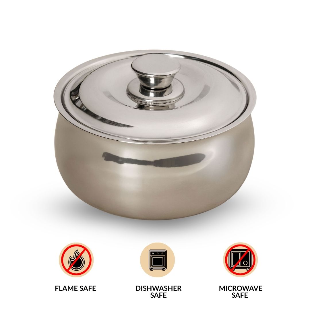 Design: Made from durable 202-grade stainless steel, this 2100ml belly casserole features a glossy mirror finish that enhances its elegant table presence. Its rounded shape with gently curved sides ensures easy grip and handling, while the spacious capacity is perfect for larger meal servings.