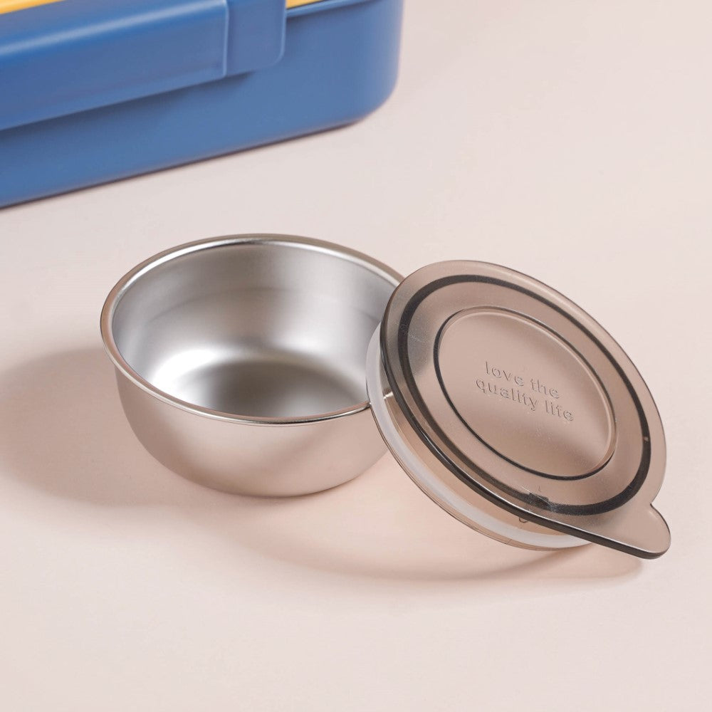 The warm water insulation feature utilises the heat-retaining properties of stainless steel and warm water to keep your food warm. To use this feature, you can fill the bottom PVC compartment of the lunch box with warm water before placing your hot food in the compartments of the upper removable stainless steel grid. The warm water acts as a heat reservoir, maintaining the temperature of the food for a longer duration.