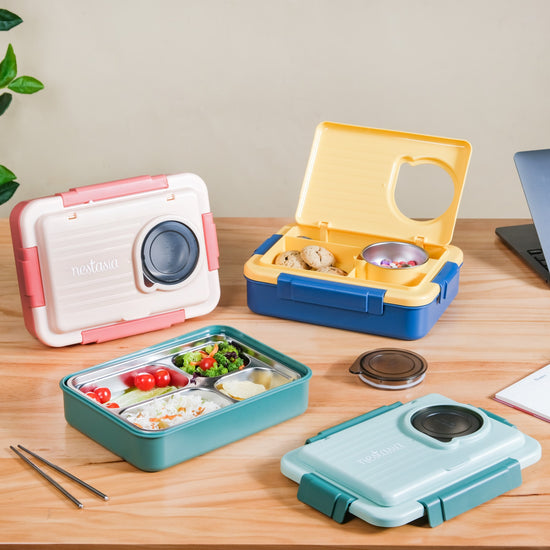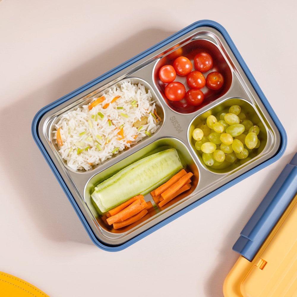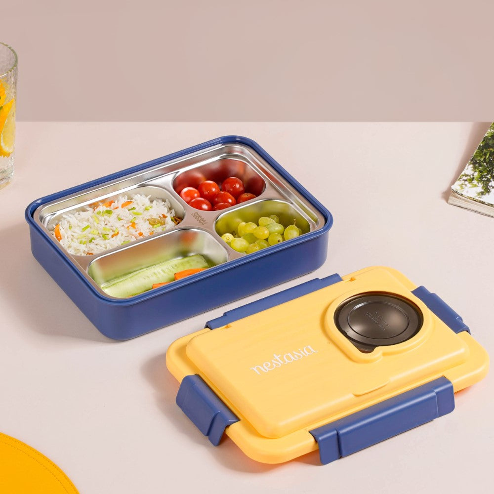 The 4-grid lunch box offers premium features for a delightful lunchtime experience. The tiffin box is made of food-safe, BPA-free materials, and the use of 304-grade stainless steel guarantees outstanding quality. Your health and safety are prioritised above anything else. The excellent warm water insulation technology of this lunchbox will keep your food warm and delicious. The four distinct compartments let you organise your food, and the clip locks on all four sides ensure its safety and security. The silicone gasket's detachable design also facilitates easy cleanup of the lunch box. Because of its durable yet lightweight design, it becomes easy to travel light with this lunch box. You can enjoy every bite by making lunchtime special with this gorgeous lunchbox.