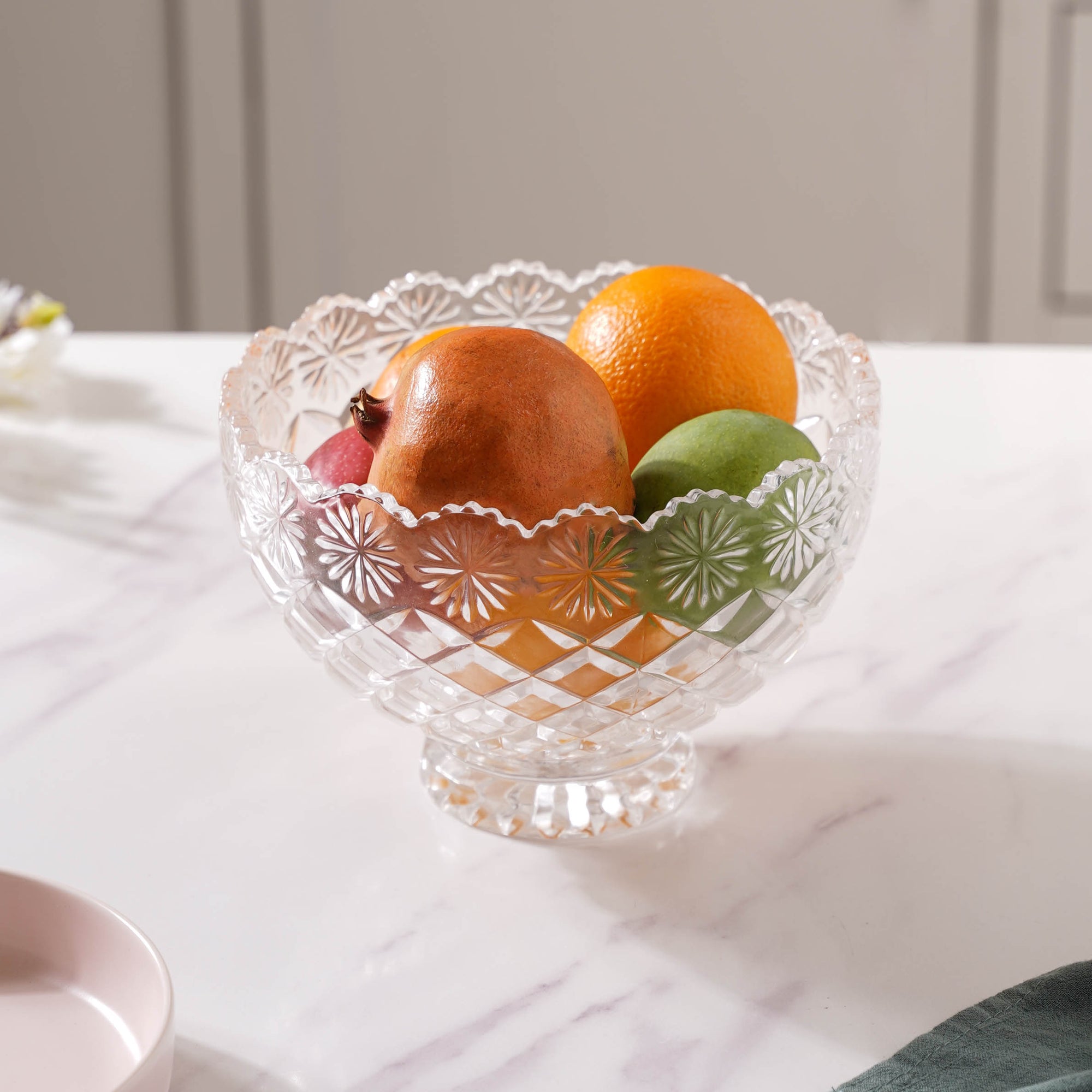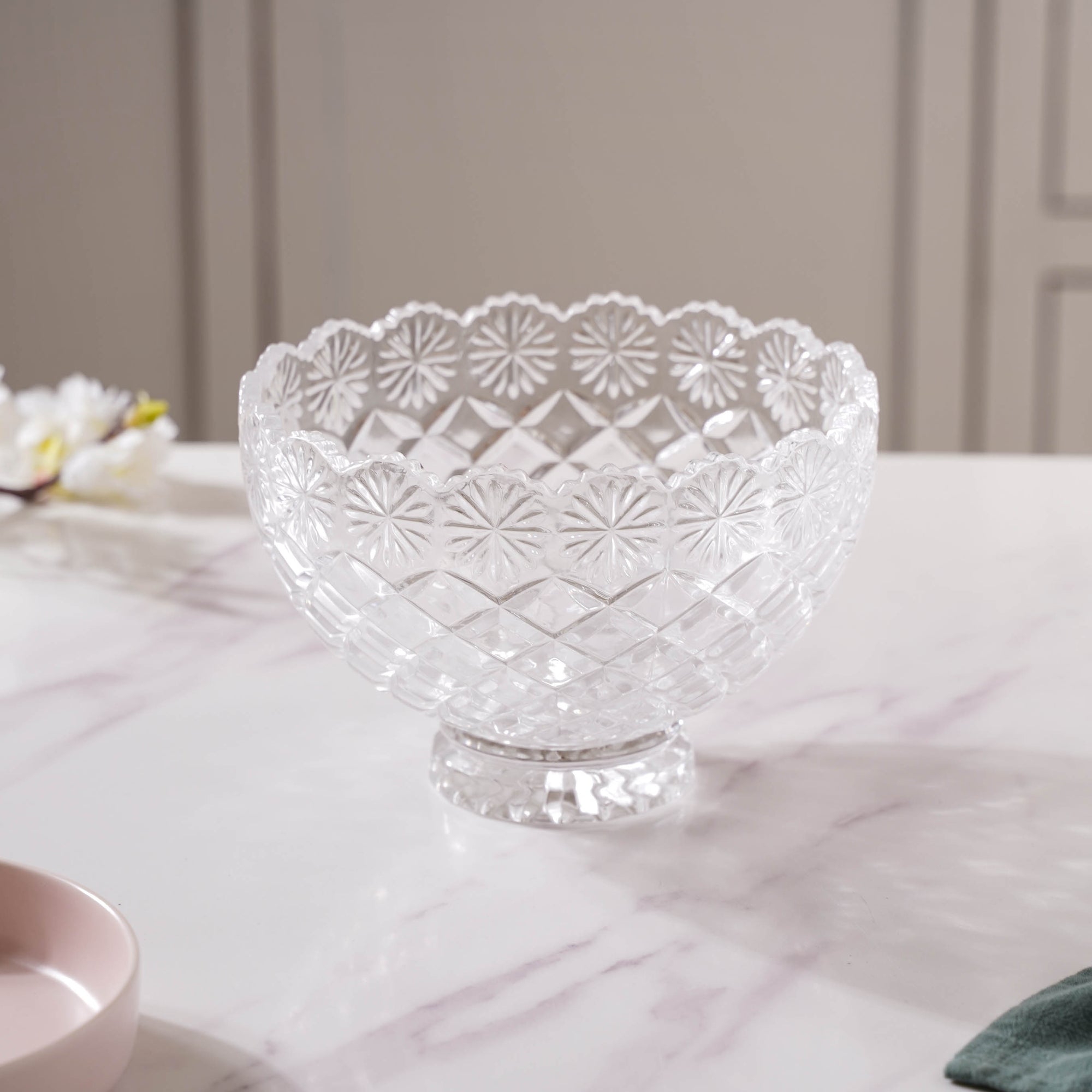The bowl has been designed intricately to grace the table with its beauty. The pristine and sturdy bowl is ideal for serving dishes to guests. The surface of the bowl has intricate floral and geometric textures, making it a classic addition to one's glassware collection. The glass bowl can be placed on the coffee table as a centre piece with some fresh flowers or lemons.