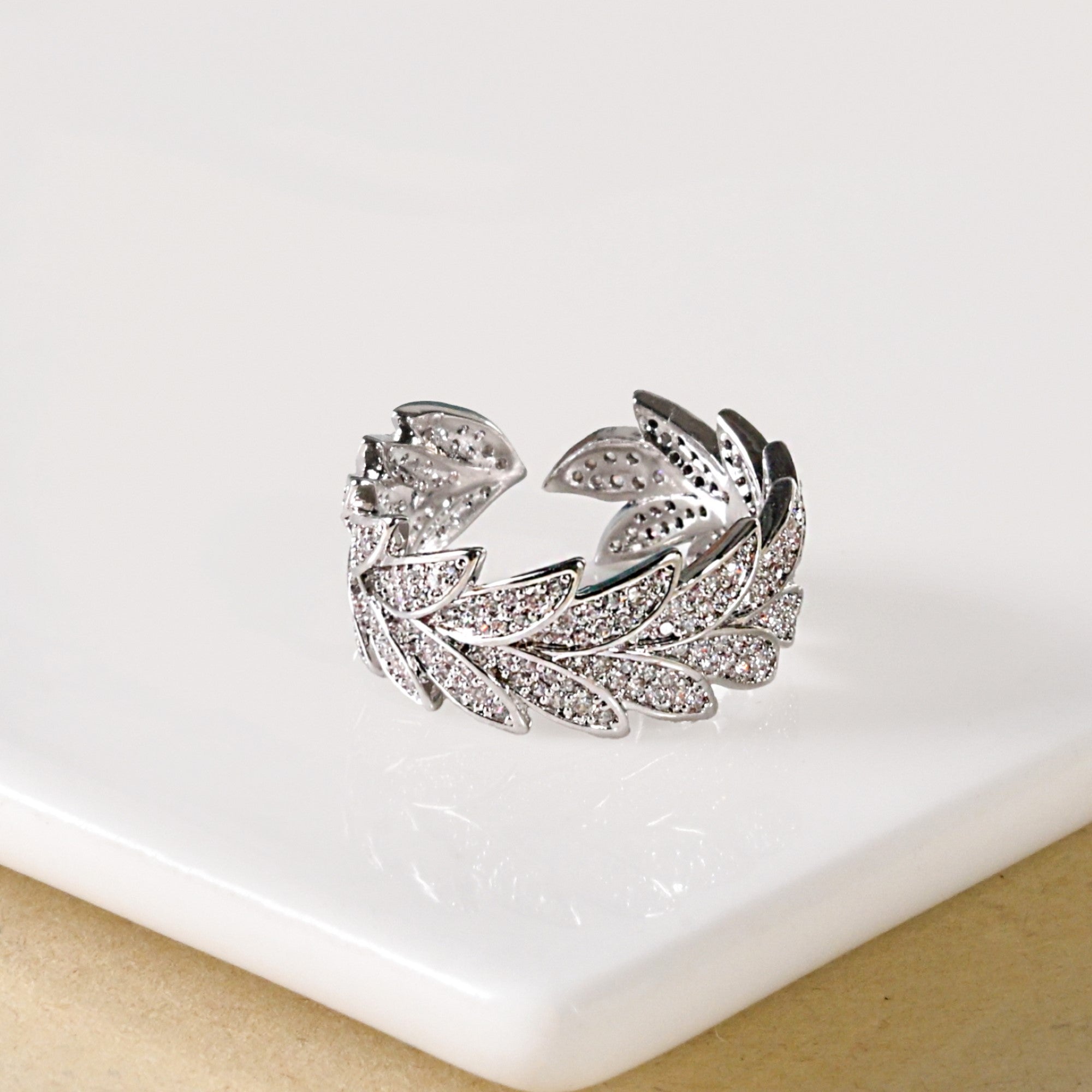 A delicate dance of nature and brilliance, this beautiful silver ring brings the beauty of a serene woodland to your fingertips. Crafted in sleek silver, the ring’s structure mimics an elegant vine, with intricately detailed leaves running gracefully along both sides. The true showstopper? A cascade of iridescent stones nestled within the design, shimmering like morning dew on a sunlit leaf. The polished silver border adds a refined touch, balancing nature’s whimsy with contemporary sophistication.