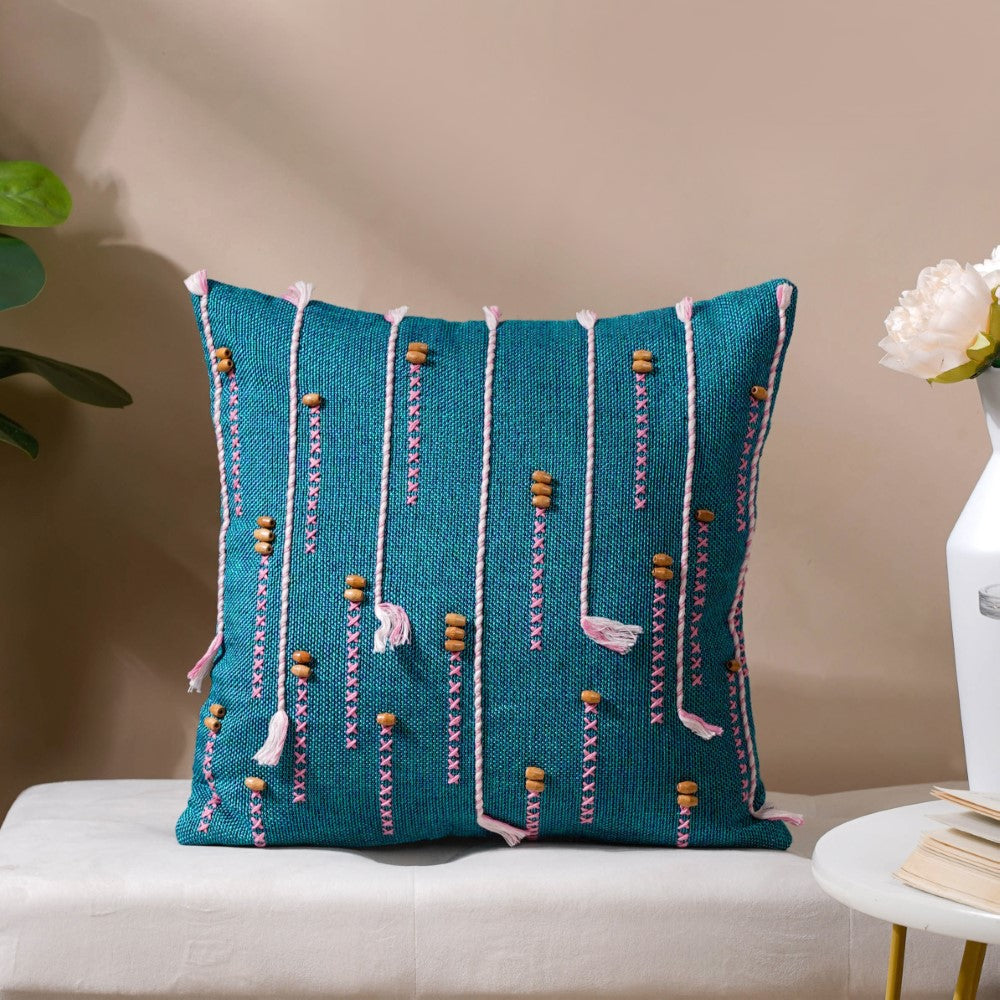 Jade Threadwork Beaded Jute Cushion Cover Green 16 x 16 Inch