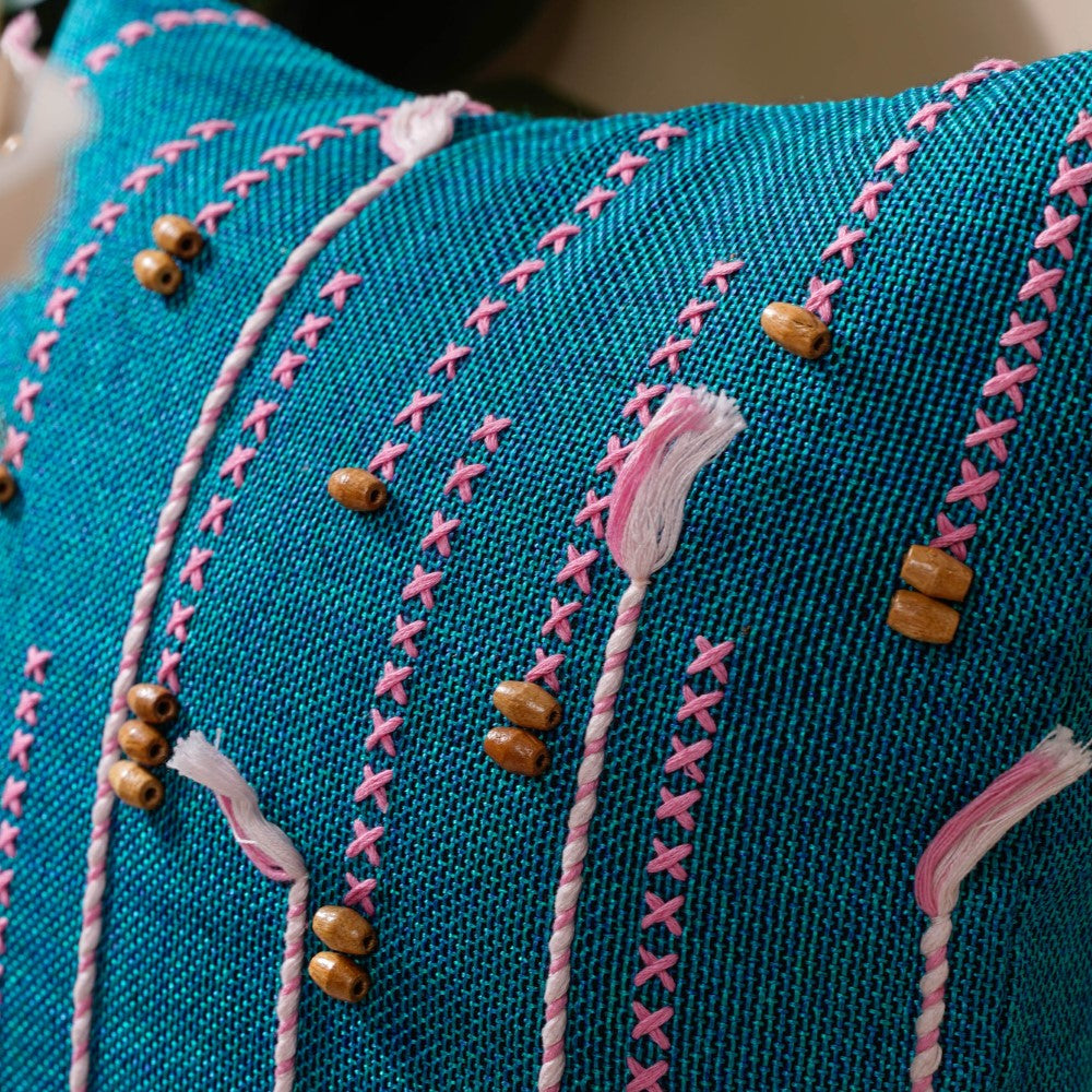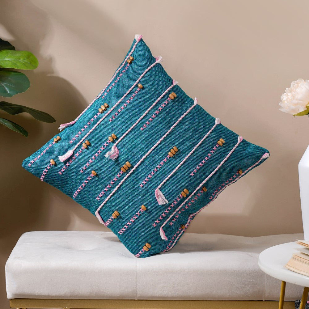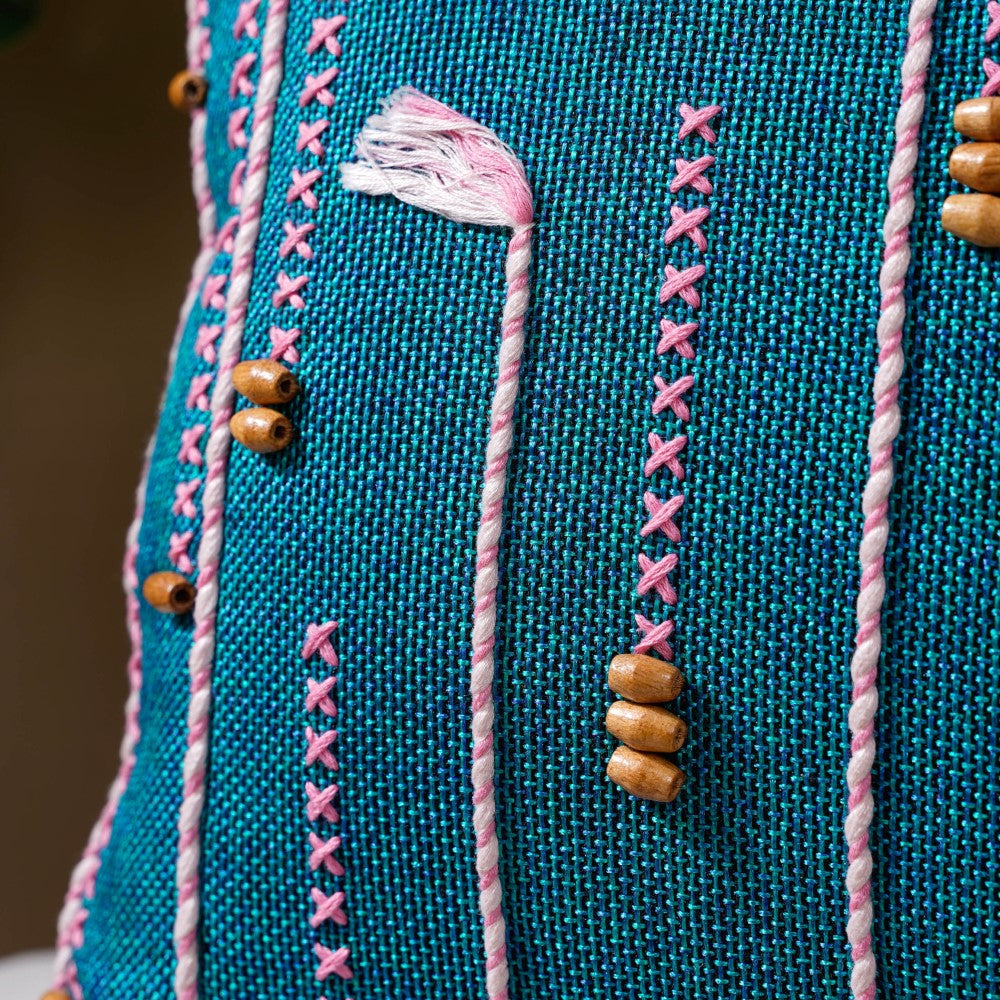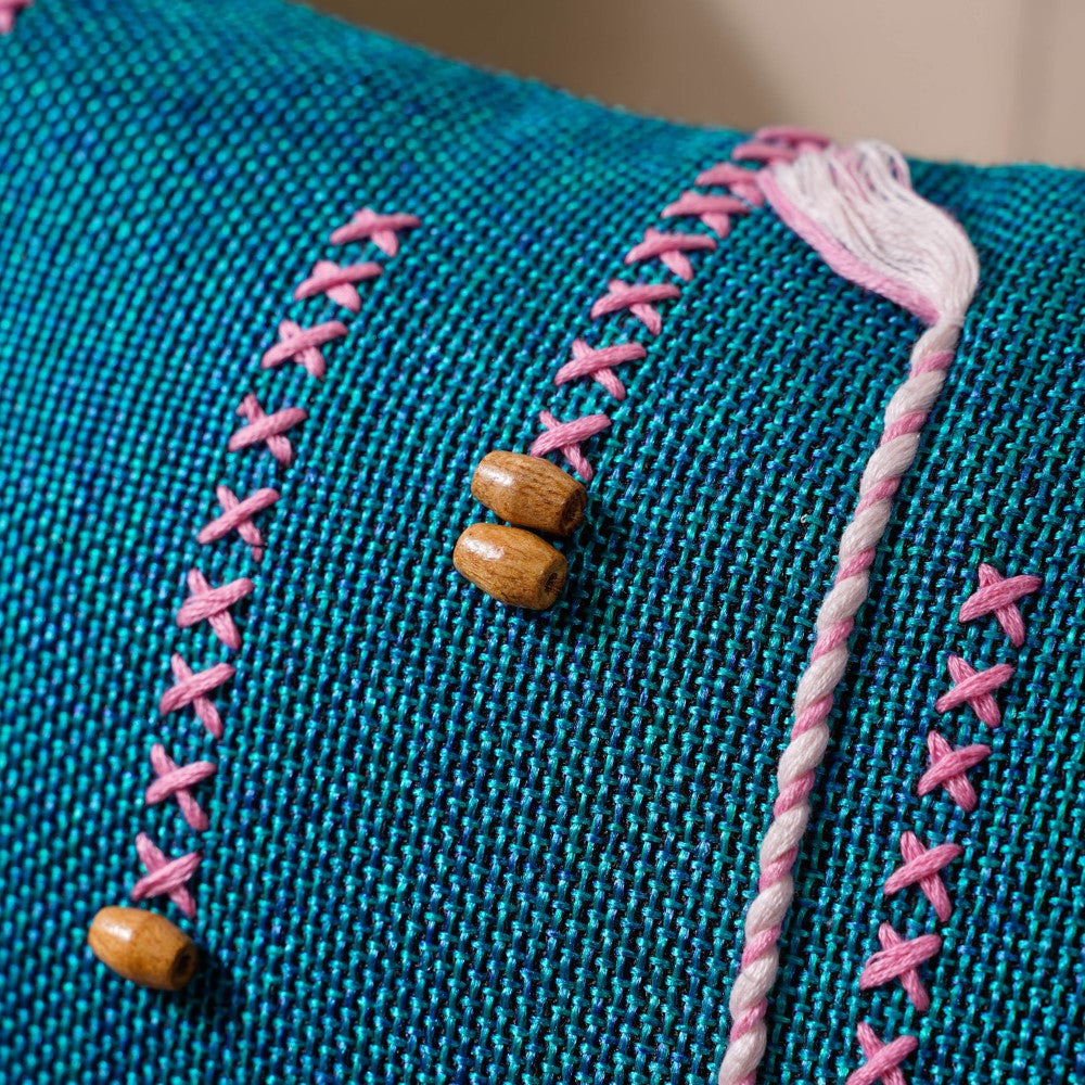 The Bohemian green jute cushion cover with pink and white threadwork and wooden beads is a must-have to amp up the contemporary interior design of a room or the overall home interior. An overlay of pink and white threadwork is seen, which is the artistry of the craftsmen working on our soft furnishing, which makes the square cushion cover an eye candy instantly. The playful cross-stitch of pink thread adds to the eclectic quality of the sofa cushion cover. Made with jute fabric, it's best for gifting as a housewarming, anniversary, festive, or trousseau gift, as it will surely be one of the best green cushion covers you will come across.
