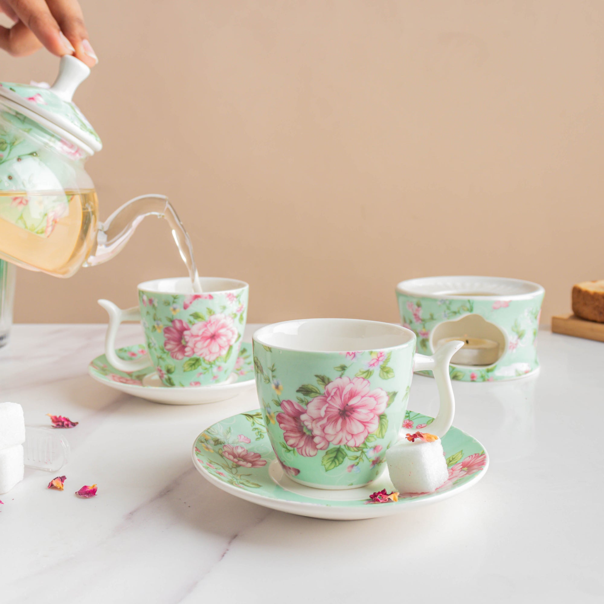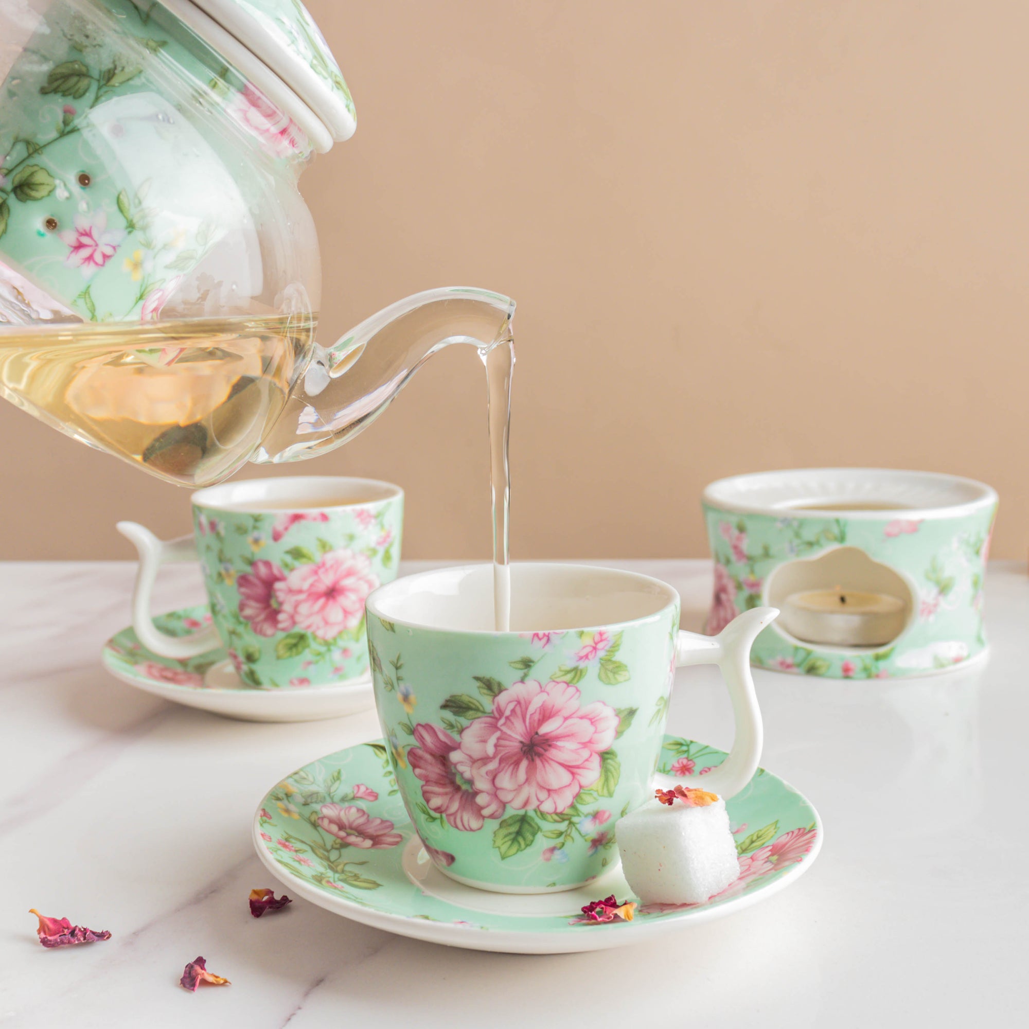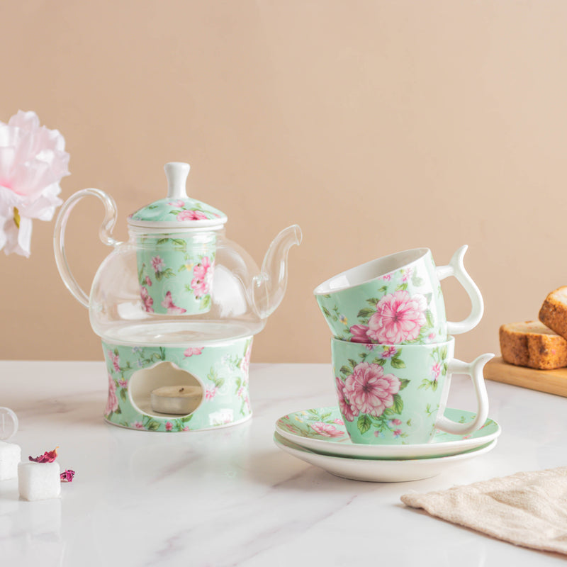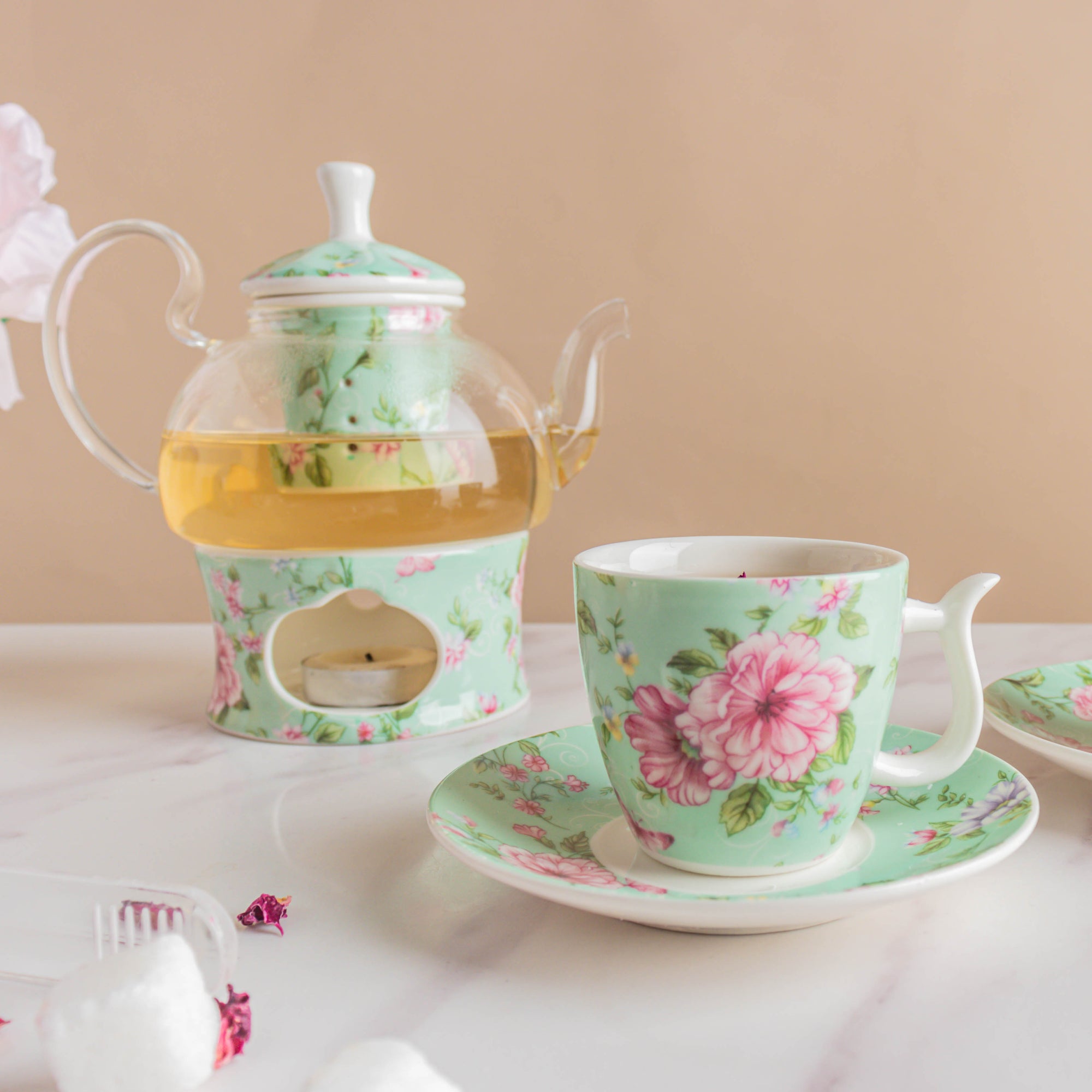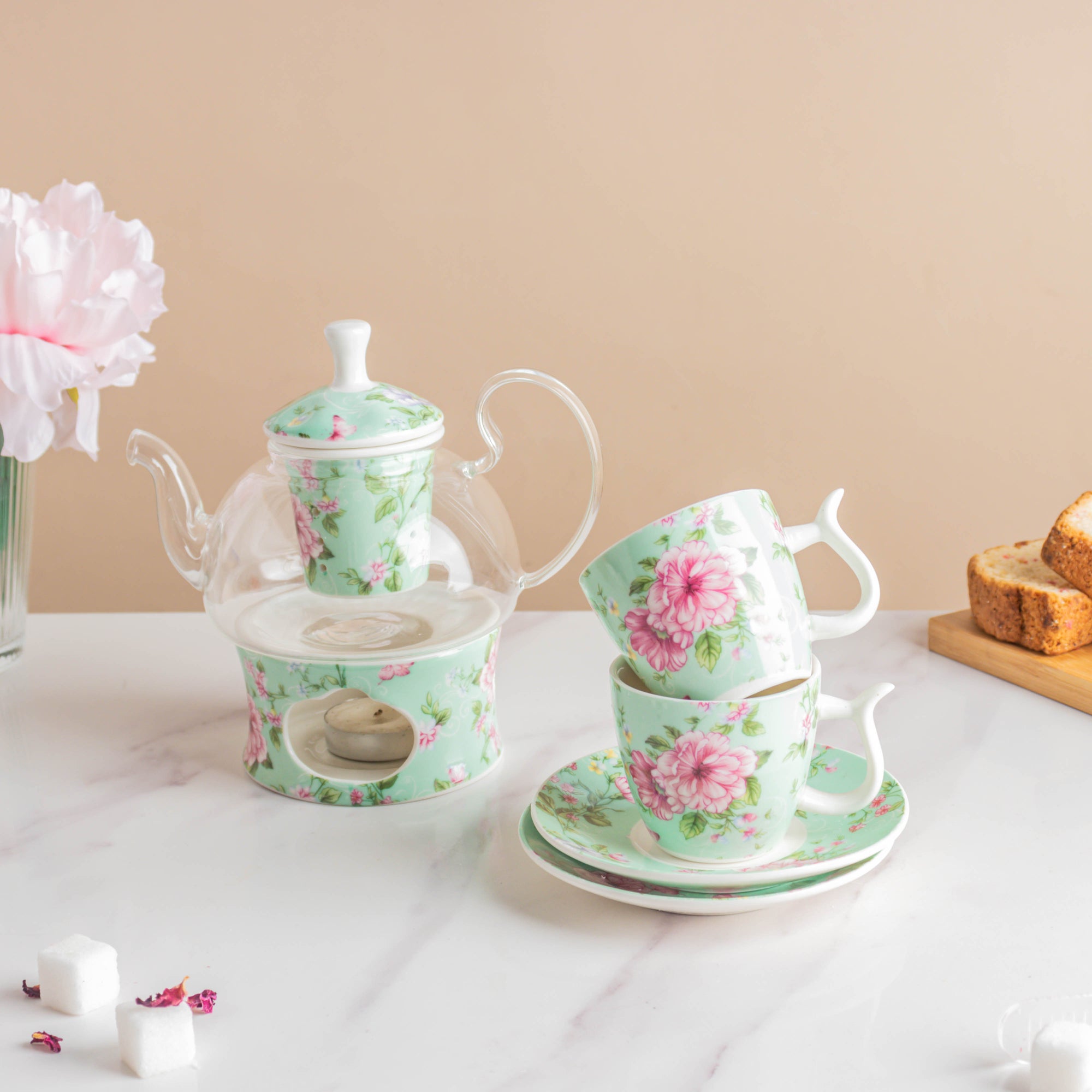 Products Included: 1 glass kettle, 1 tea infuser with a lid, 1 kettle stand, 2 teacups, and 2 saucers