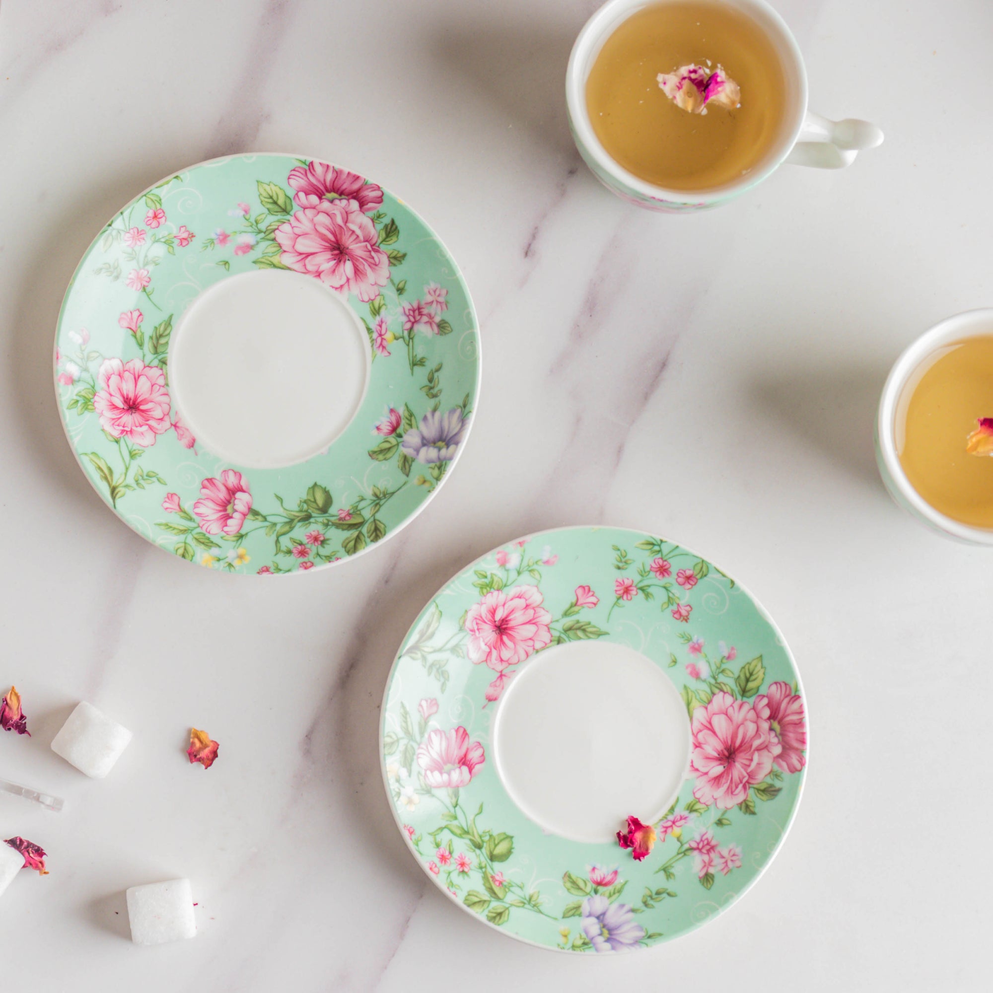Teacups, each with a distinct saucer - all made of ceramic - add the cozy elegance to tea parties. There also comes a ceramic kettle stand, having a flat, little station for the kettle to rest conveniently.