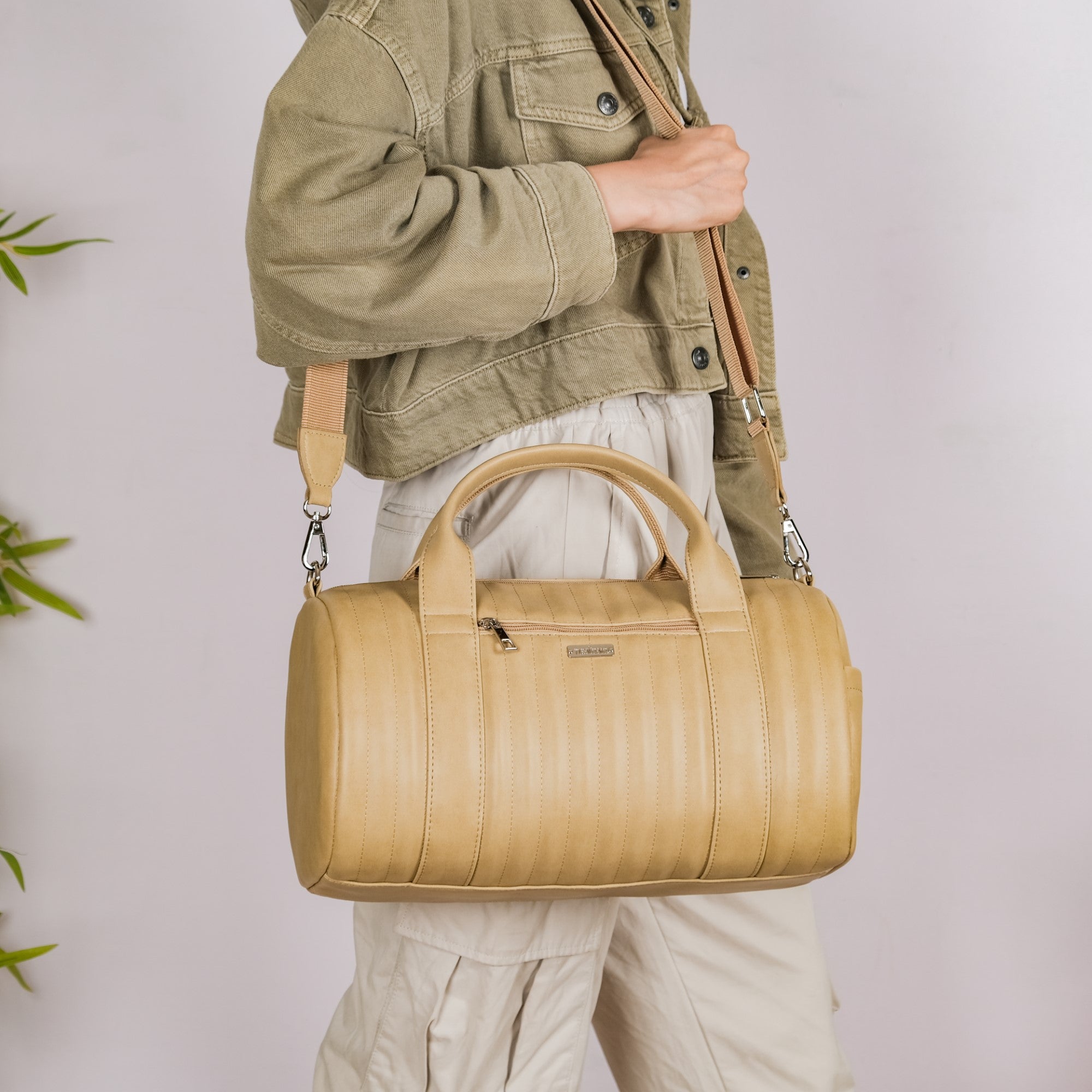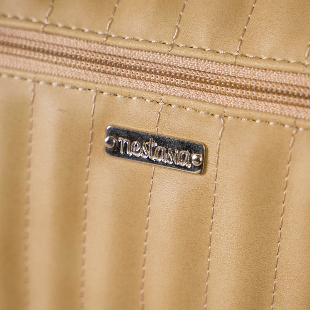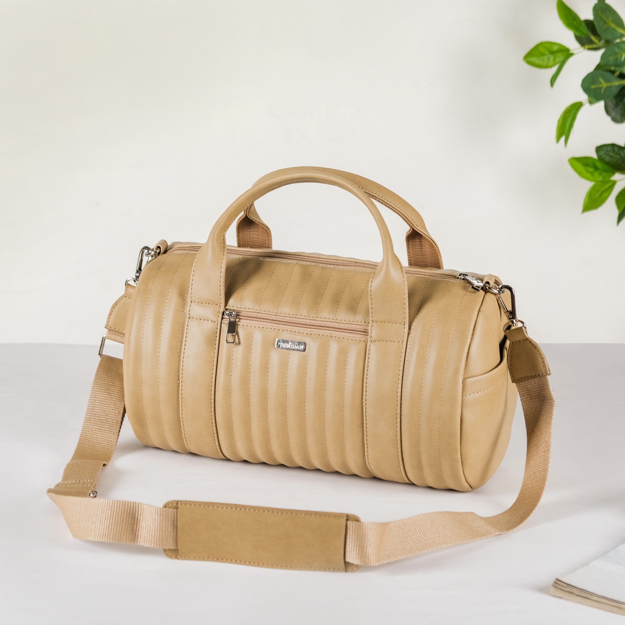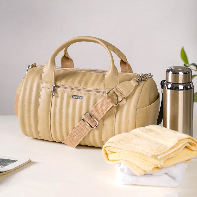 For a traveller looking for adaptability, functionality, and style, Nestasia's small beige duffel bag can be your ideal choice. Our duffle bag can be your dependable travel companion whether you're taking a quick weekend trip or going to the gym. The little front pocket is where you keep your charging connections, earbuds, power banks, and other small items while the main compartment is perfect for carrying your clothes and other travel necessities. The vegan leather material resists tarnishing, maintaining its freshness for a longer period of time.