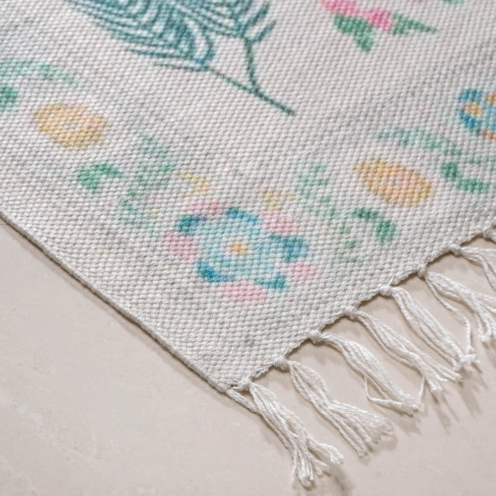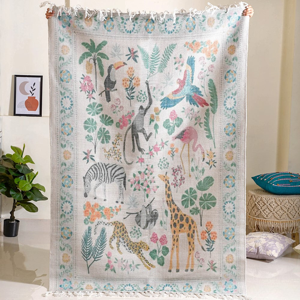 Our vibrant Jungle Dreams living room rug is an enchanting work of art that brings the beauty of the wild into your living space. This meticulously crafted floor rug showcases a stunning jungle scene bursting with life and colour. Lush green foliage, exotic flowers, and majestic trees create a captivating backdrop for an array of wild animals, from playful monkeys to graceful leopards and colourful parrots. Each detail is expertly woven into the soft, durable fabric, ensuring long-lasting quality. This area carpet can be the perfect statement piece for inviting nature's wonders into your abode with its breathtaking artistry.