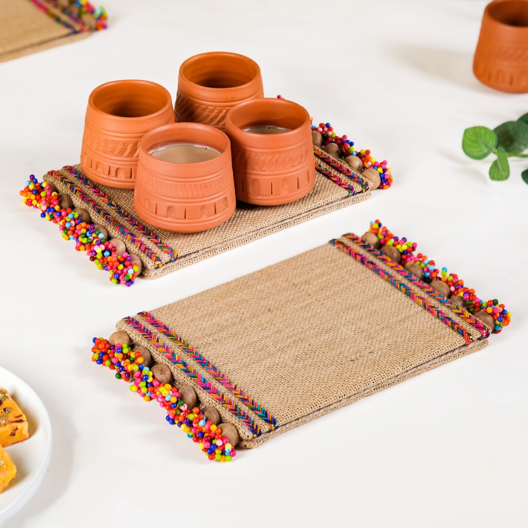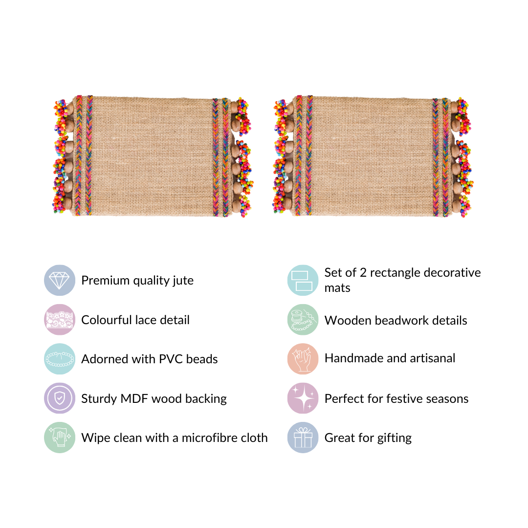 Elevate your home decor with our decorative trivets, where artistry meets functionality in the most enchanting way. Made from premium jute, this decorative mat was designed to combine elegance with a touch of modern flair. The multicolored lace around the edges, along with the wooden moti balls with multicolored beads on the sides, add a joyful burst of color and a refreshing vibe to your space. Furthermore, the trivet features an MDF wooden base that provides the durability and sturdiness it needs to help you securely display all your home decor objects. And guess what? The spacious surface of the decorative trivets makes them perfect to use as a place mat for all your serving bowls and platters during parties. This truly is a must-have trivet you don’t want to miss out on!