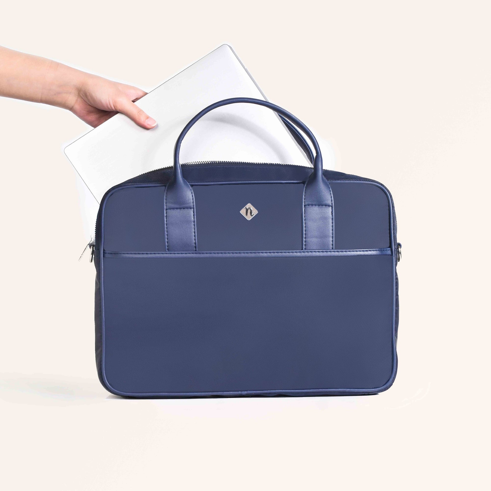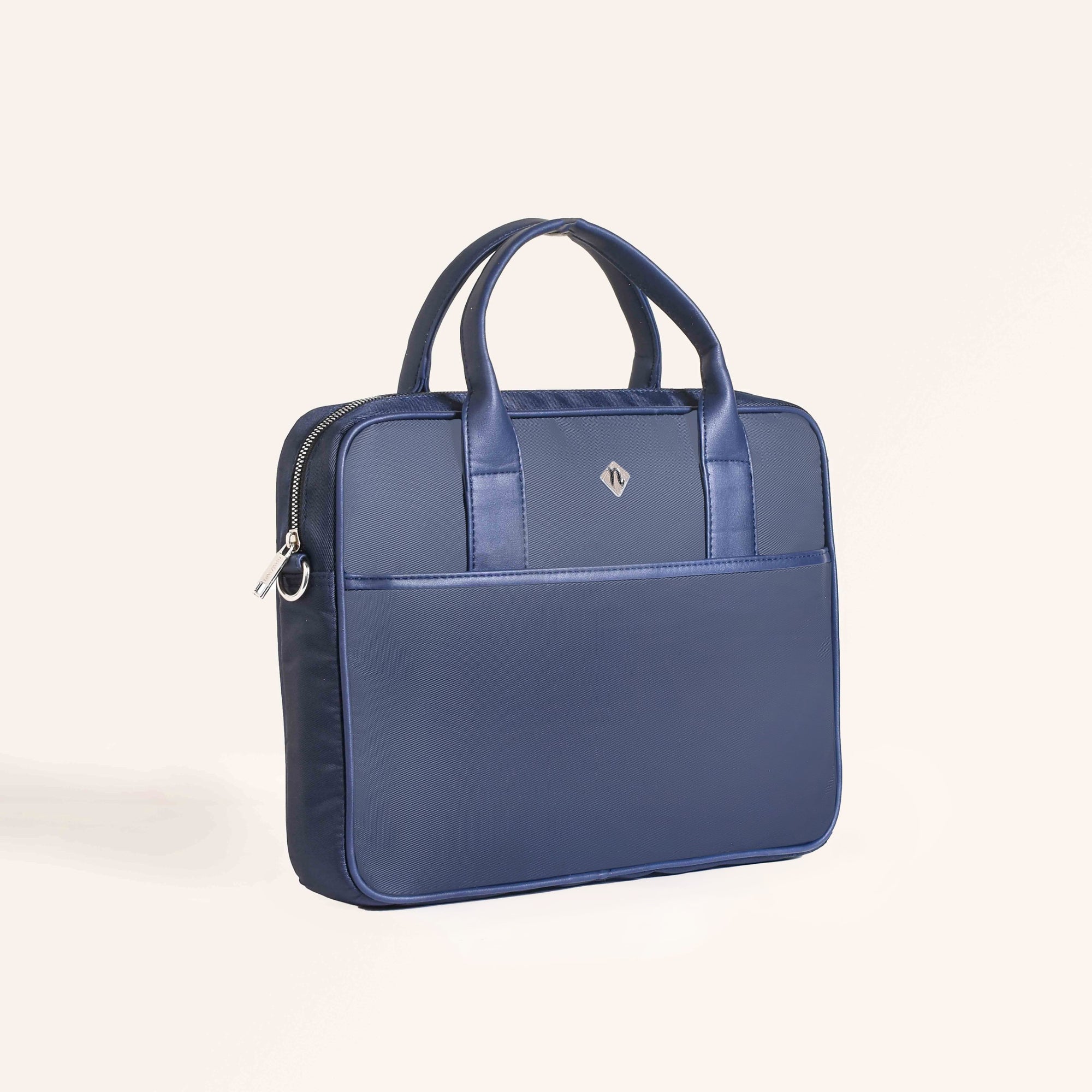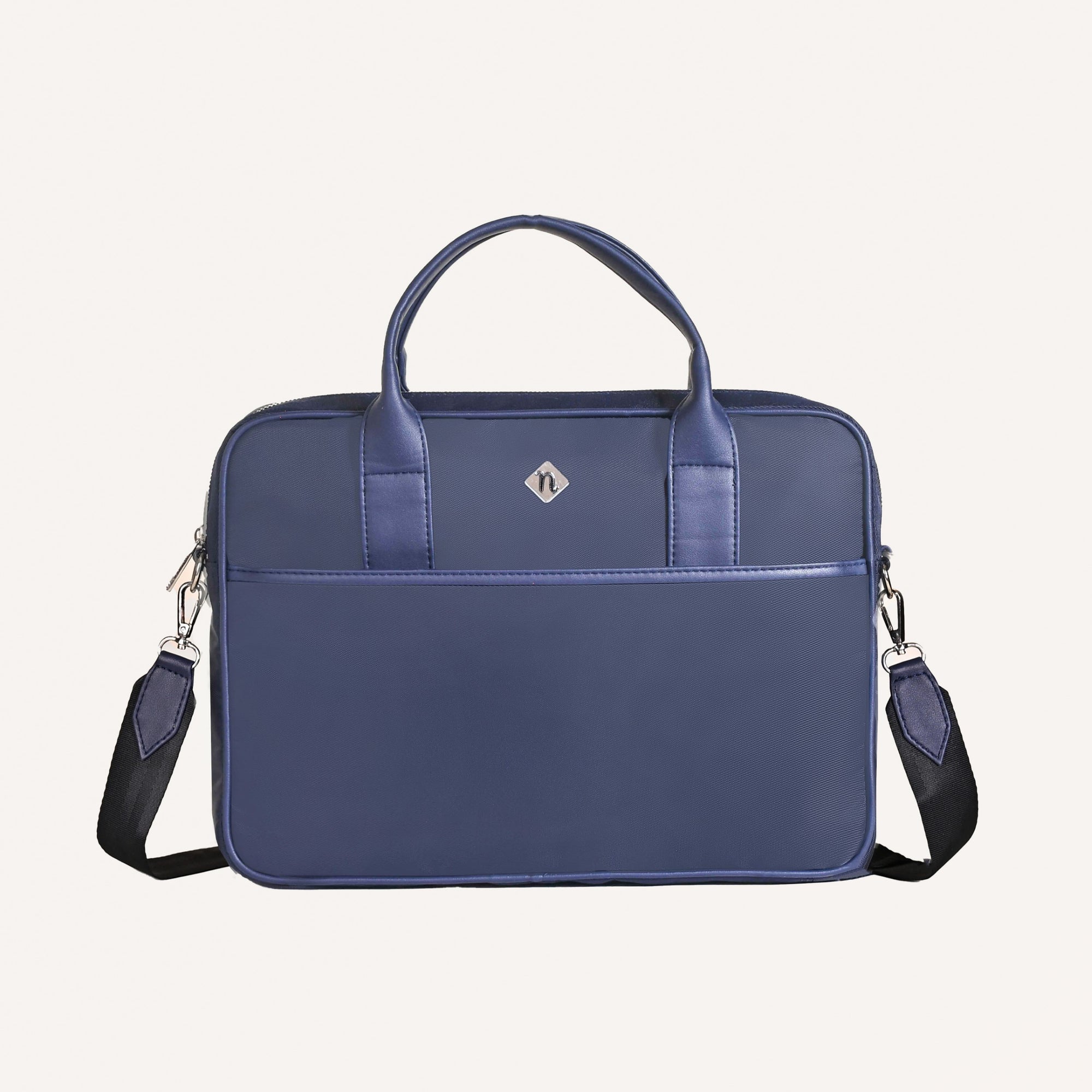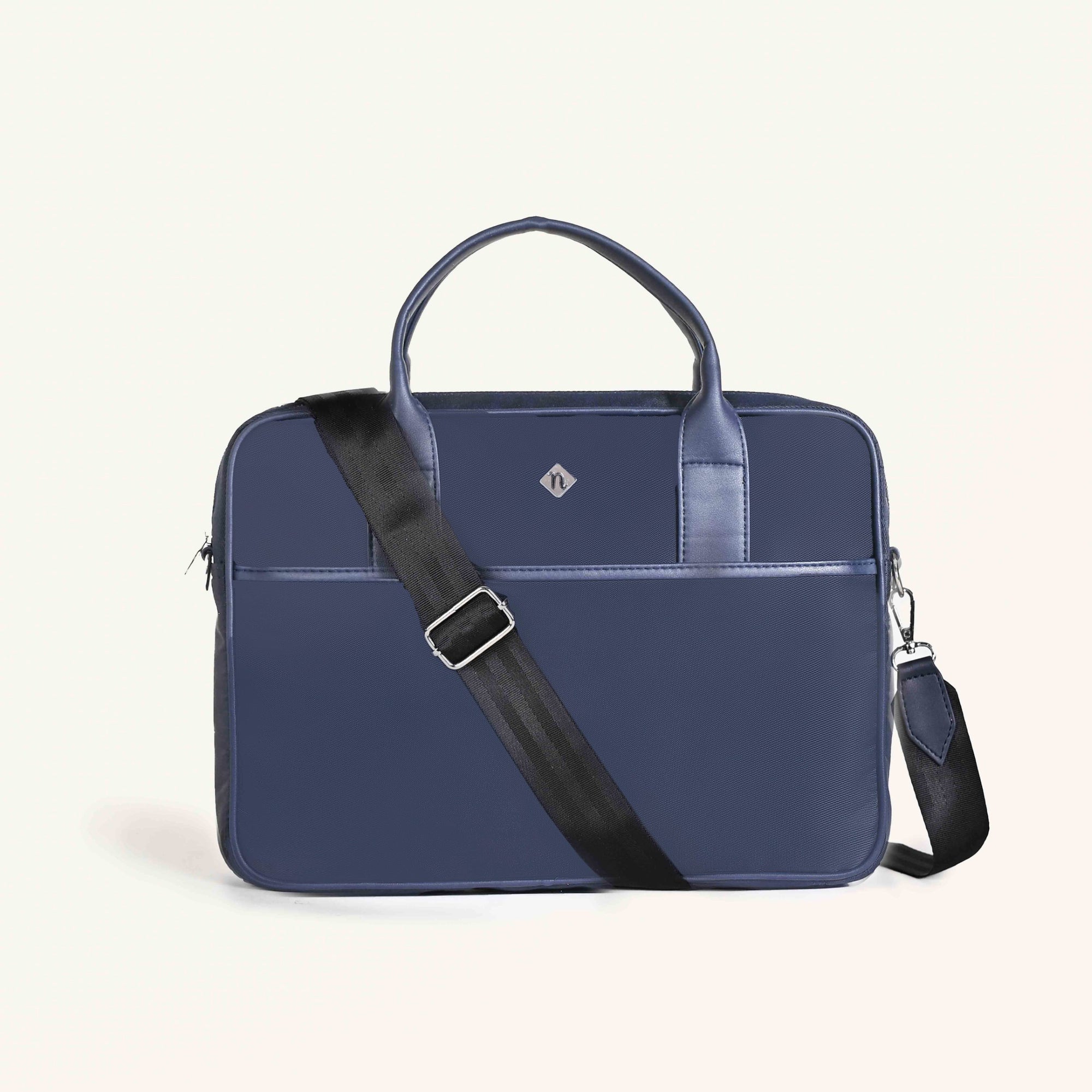 Design: Crafted from 100% premium nylon, the Kaizen bag offers a perfect blend of durability and sophistication. The sleek navy blue exterior and waterproof lining ensure all your electronics remain protected. Inside, a generously sized main compartment with a padded divider keeps your laptop secure, while a velcro top strap adds an extra layer of protection. With multiple smooth metal zipper closures, the bag features two interior pockets for wires and essentials, a zippered side pocket, a front compartment, and a back pocket, all meticulously designed to keep you organized. The short, sturdy handles and the adjustable, detachable sling strap offer versatile carrying options, making it equally suitable as a laptop sling bag or a messenger bag.
