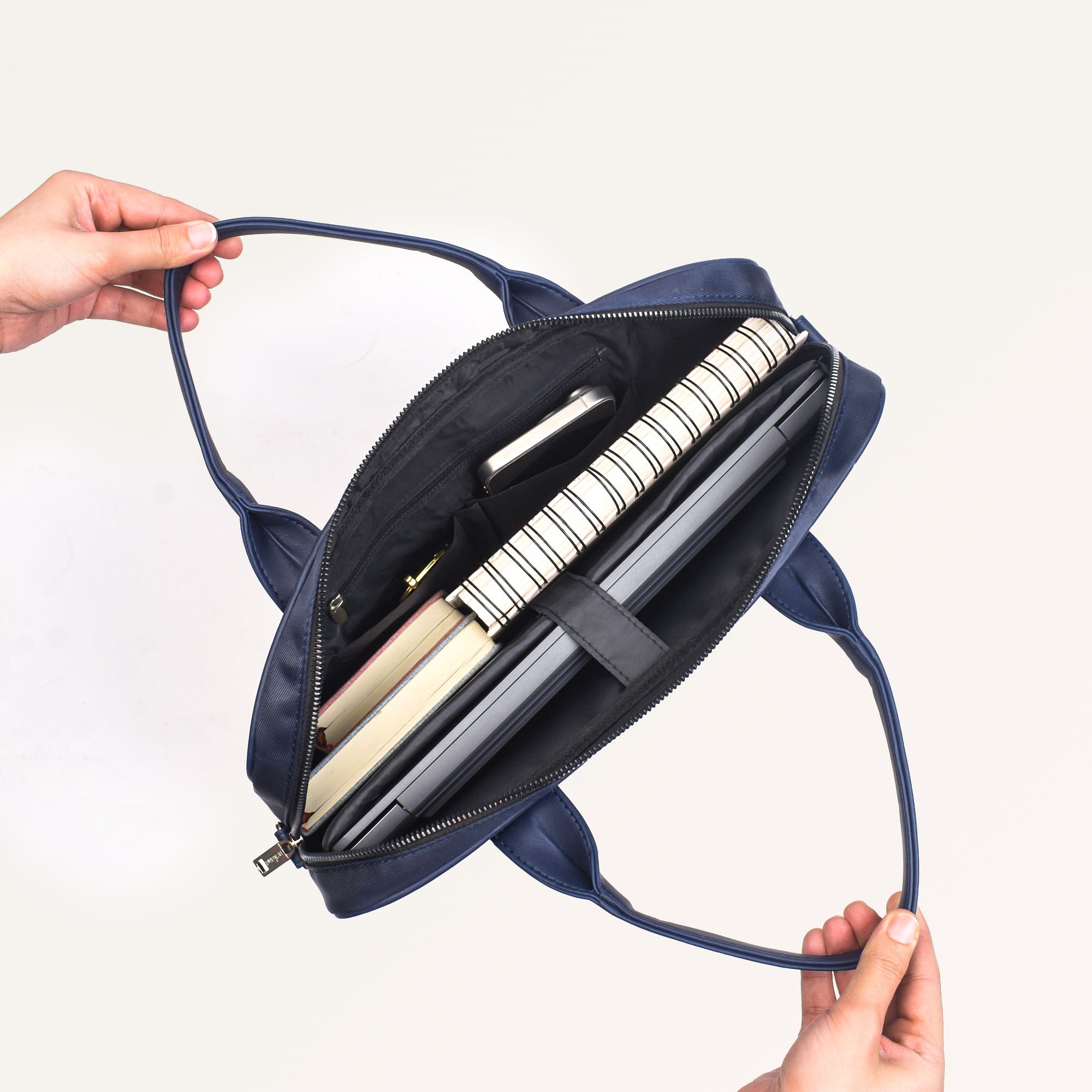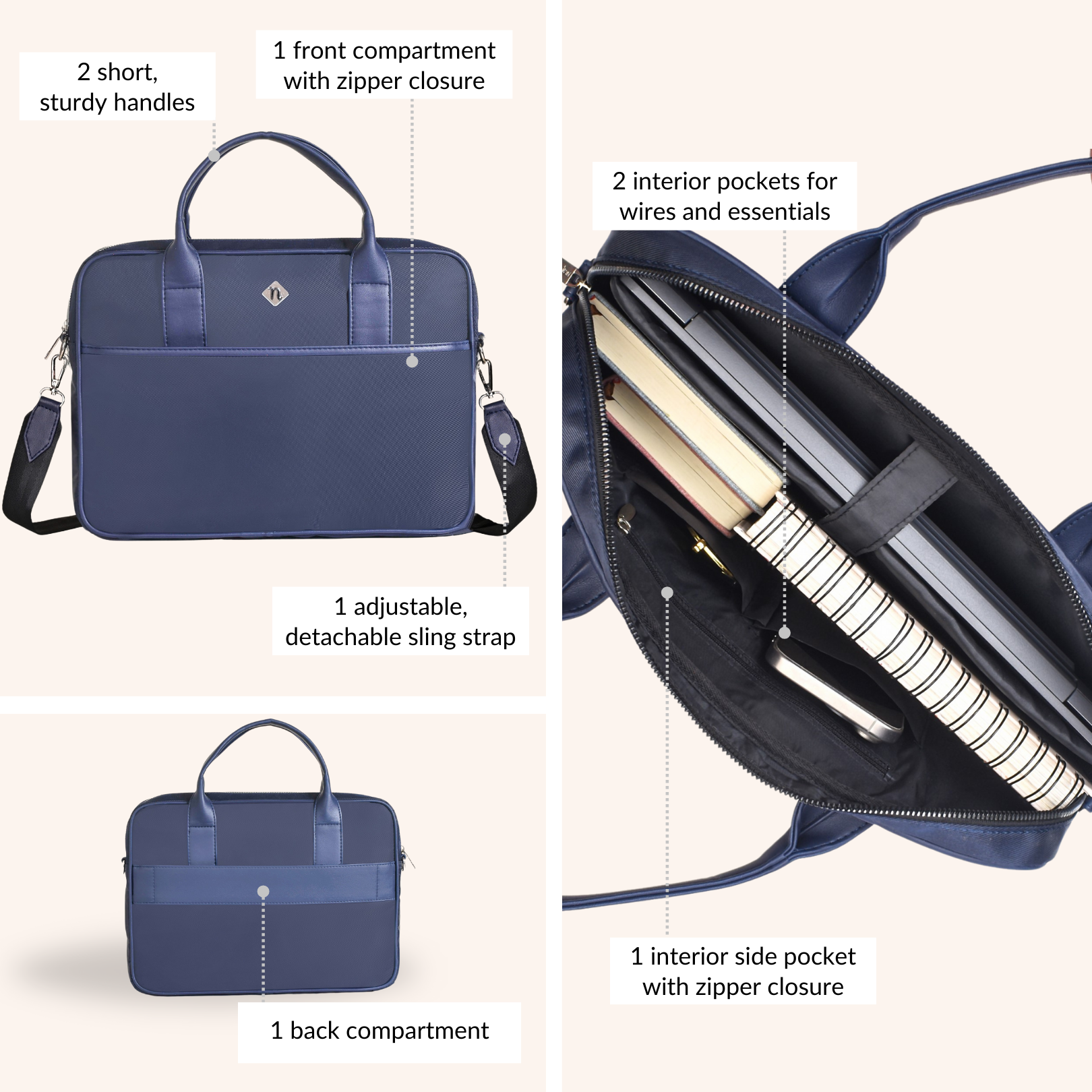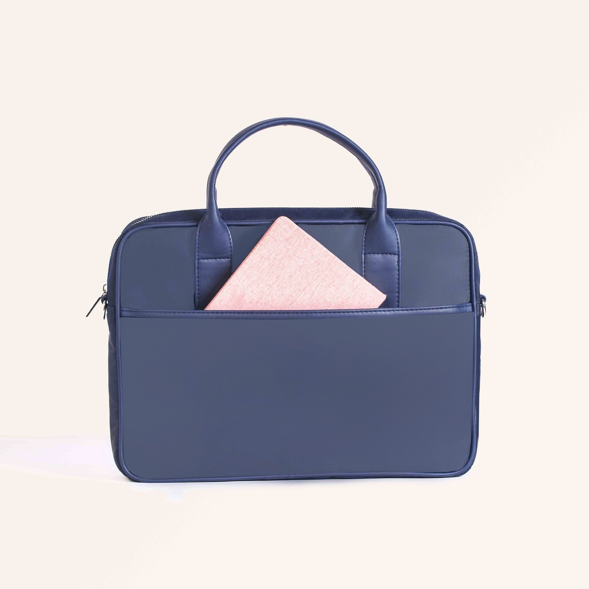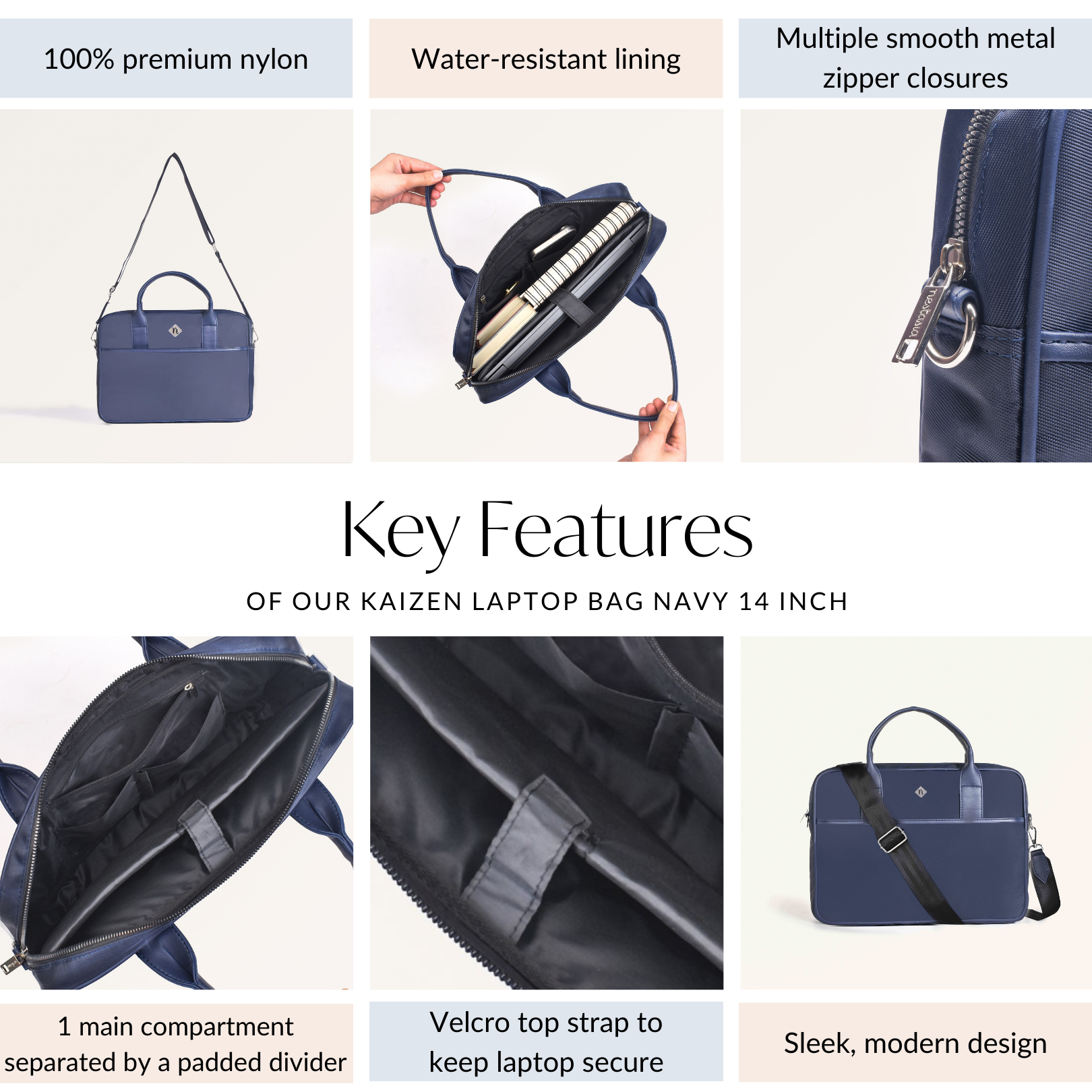Design: Crafted from 100% premium nylon, the Kaizen bag offers a perfect blend of durability and sophistication. The sleek navy blue exterior and waterproof lining ensure all your electronics remain protected. Inside, a generously sized main compartment with a padded divider keeps your laptop secure, while a velcro top strap adds an extra layer of protection. With multiple smooth metal zipper closures, the bag features two interior pockets for wires and essentials, a zippered side pocket, a front compartment, and a back pocket, all meticulously designed to keep you organized. The short, sturdy handles and the adjustable, detachable sling strap offer versatile carrying options, making it equally suitable as a laptop sling bag or a messenger bag.