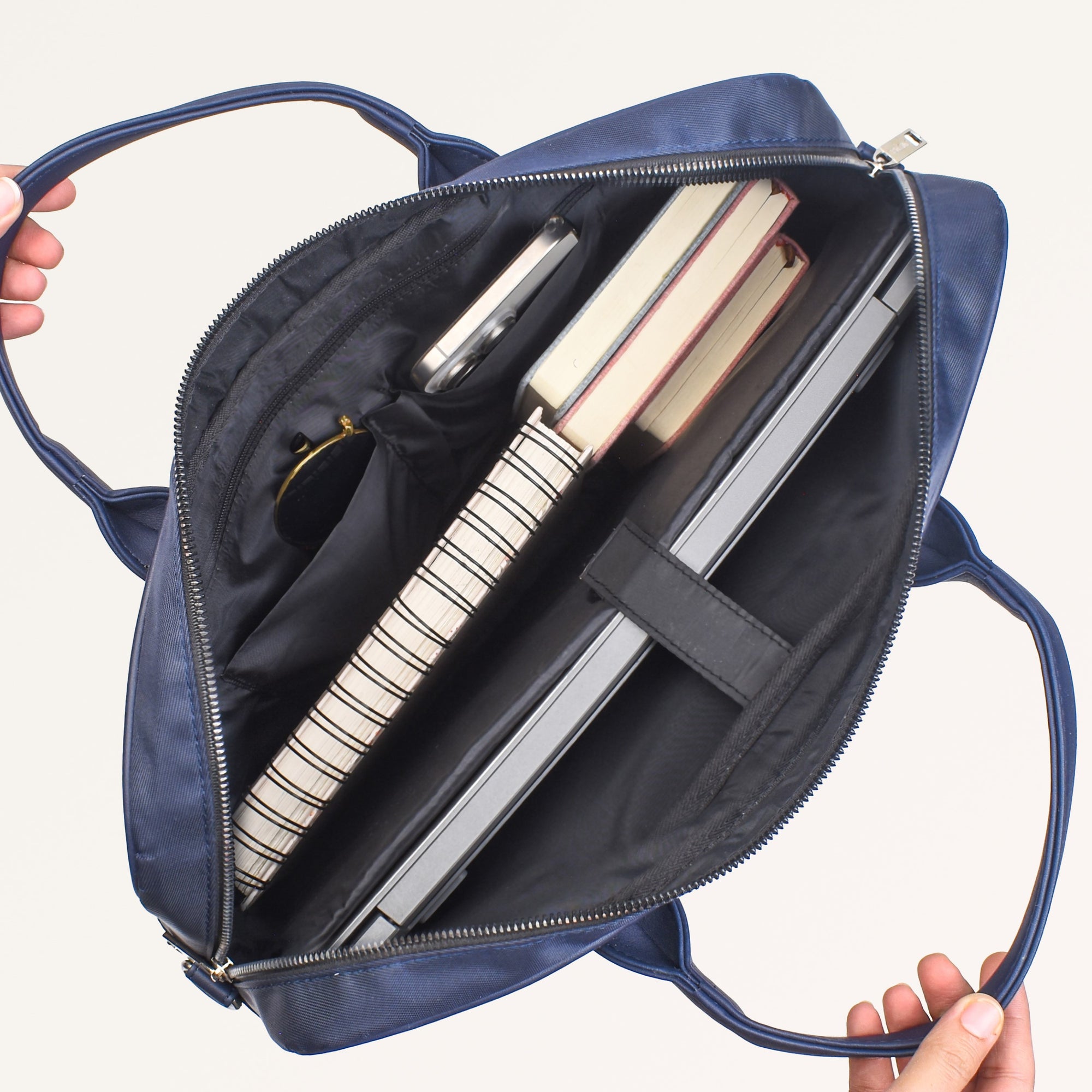 Design: Made from high-quality nylon, The Kaizen showcases modern elegance with a rich, navy blue hue that brings the essence of quiet luxury to the look. The waterproof lining ensures that your belongings stay dry while on the go. Inside, the bag features a well-organized main compartment with a padded divider to protect your laptop and a velcro top strap for added security. You'll also find two interior pockets that are perfect for storing your cables, a zippered side pocket for important documents, and additional compartments at the front and back. Furthermore, the Kaizen laptop bag offers multiple carrying options, whether you want to carry it by the two short straps for a sleek, polished look, or by the adjustable sling, for a hands-free, effortless ensemble.