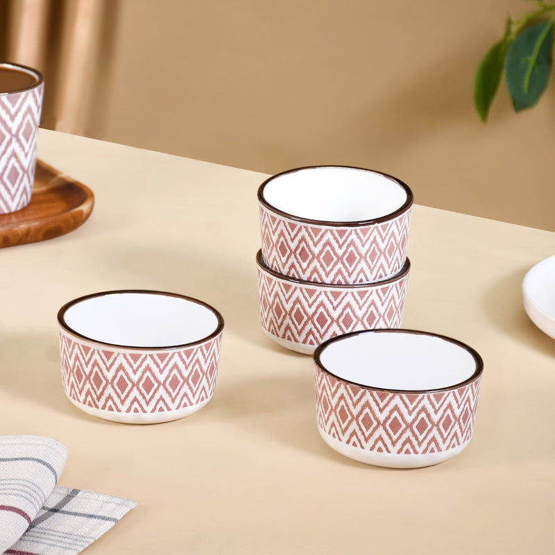 Design: Our ceramic snack bowl set is a blend of elegance and whimsy. Designed with a lively alternating diamond pattern in a delicate pink and serene white colour palette, this small bowl set adds a pop of colour to your table setting. The sleek shape not only enhances the design but also makes it easy to handle!
