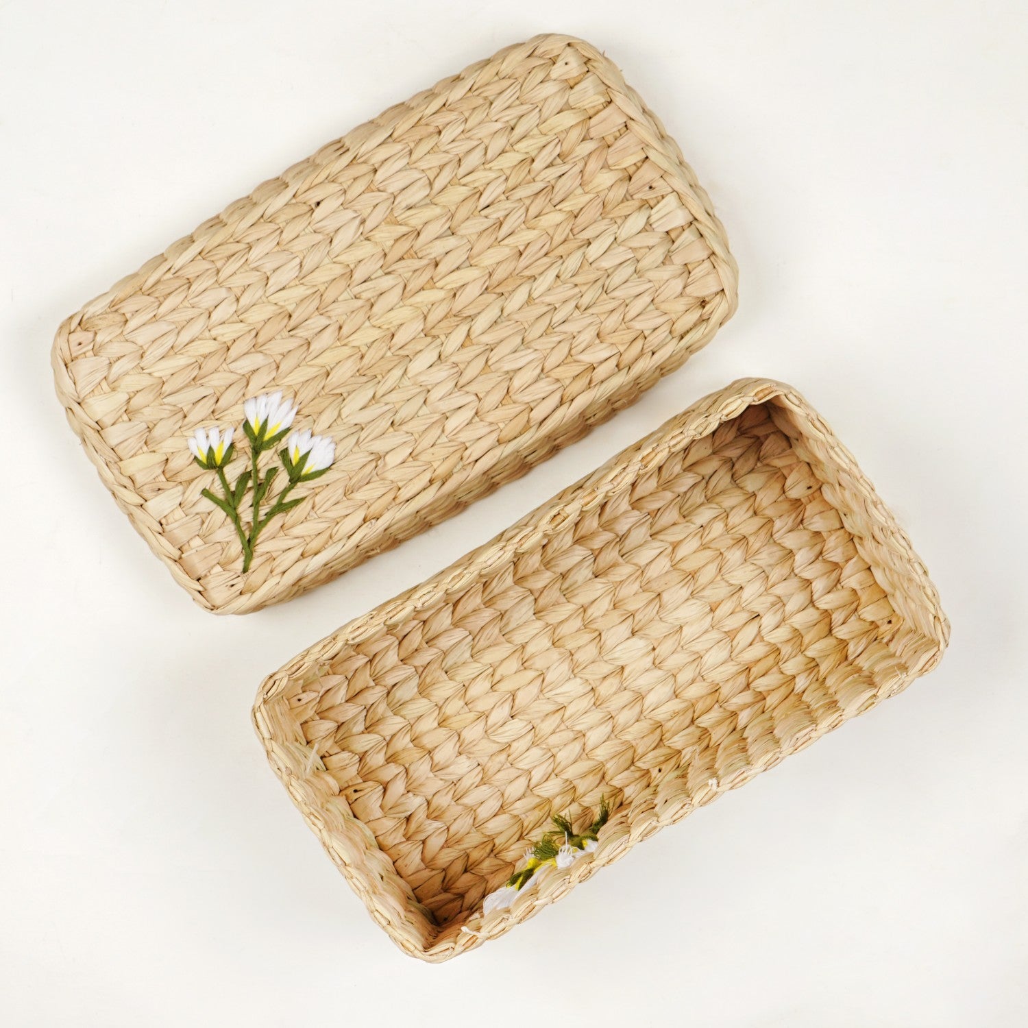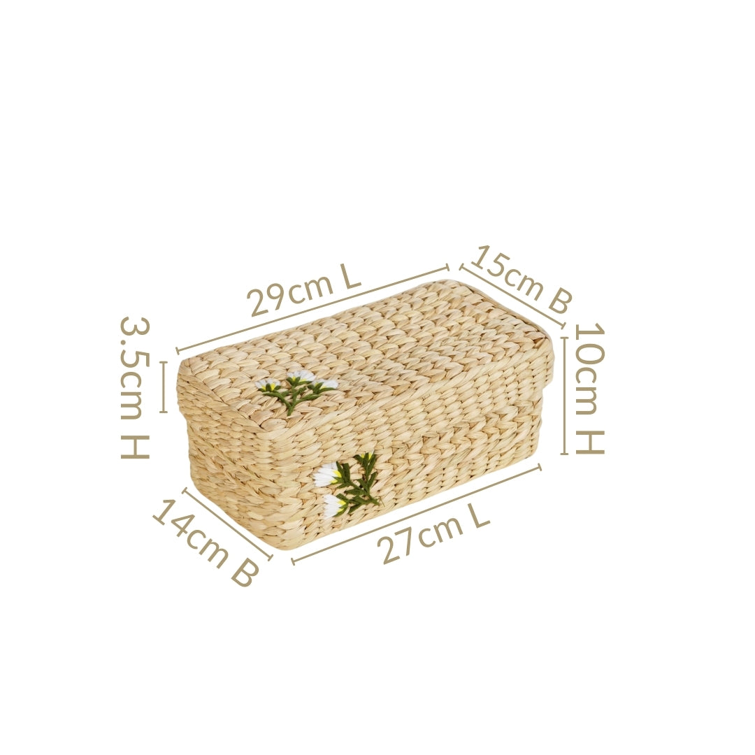 Design: Made from eco-friendly, hand-braided kauna, this box is lightweight, durable, and sustainable. The woven texture offers a naturally rustic finish. The neutral beige tone is elevated with dainty white floral embroidery featuring green stems and yellow and white accents, lending a soft, handcrafted charm. Its rectangular shape ensures neat stackability and space-saving convenience.