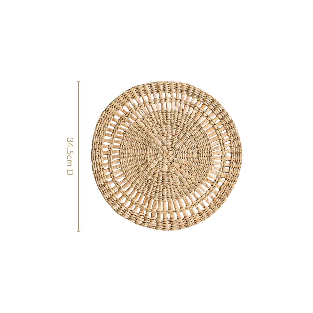 Design: The unique round shape of these table mats is a work of art, featuring a stunning rustic handwoven design crafted from 100% organic kauna grass. The natural, light-brown to straw colour is visually appealing, with a captivating concentric pattern. This design incorporates both tight weaving in the centre and open vertical slats in the outer ring, highlighting the handcrafted skill and providing an appealing texture.