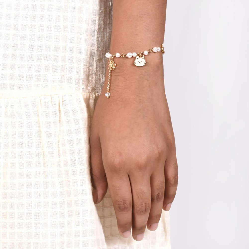 Kitty, kawaii, chic - this exquisite charm bracelet combines all facets, adding a wholesome charm to all your outfits. The golden link chain bracelet boasts a strand of glistening artificial pearls and some incredibly cute charms to add a touch of whimsy. Boasting a cute bow for the love of all things coquette and girly and an adorable kitty charm, this elegant bracelet is perfect for all trendsetters and crazy cat ladies. Accentuated by a gracefully dangling tassel with a flower ornament and glimmering stones, our bracelet goes perfectly with every look in the book.