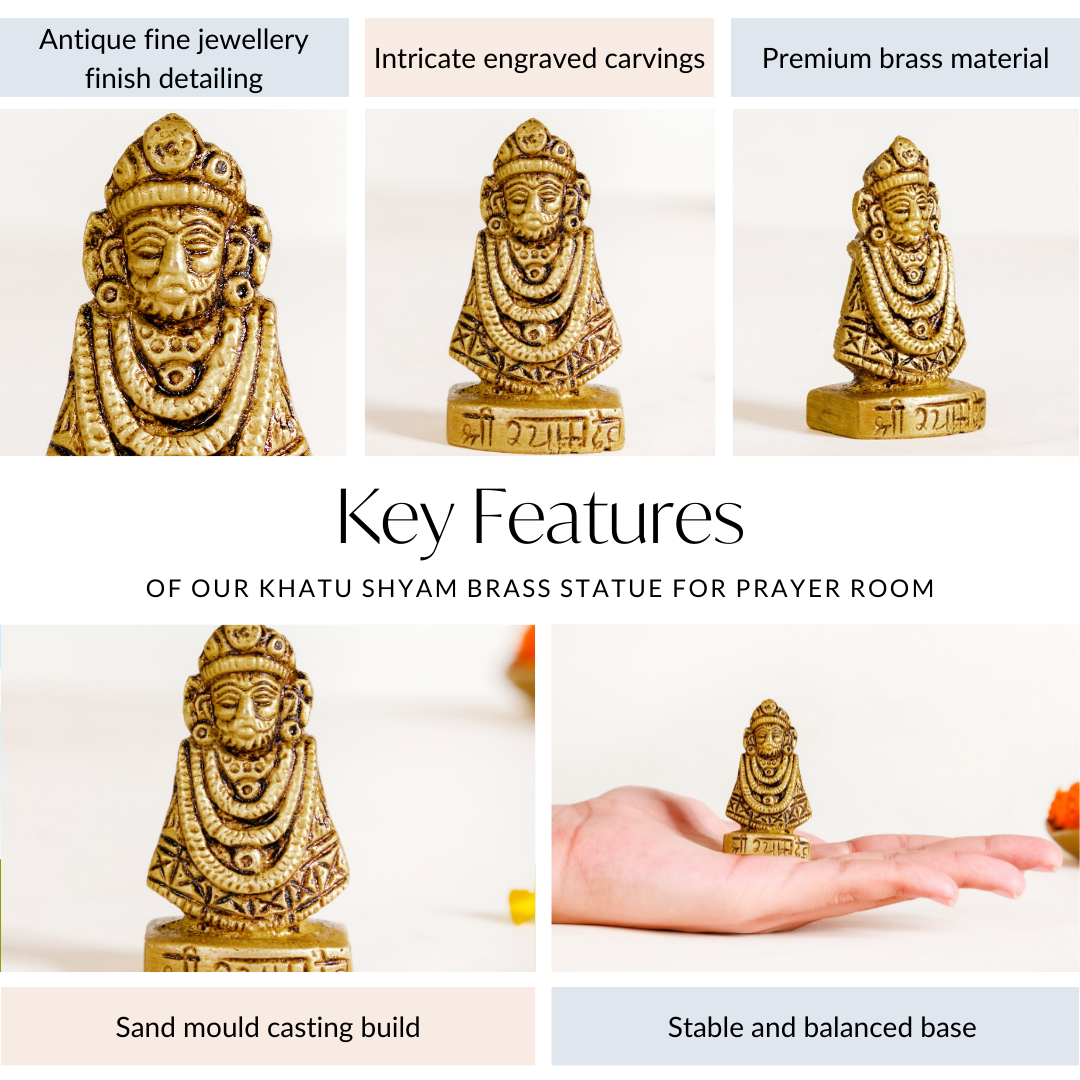 Worship of a brass idol of Khatu Shyam typically includes daily prayers, offering flowers, incense, and lighting a lamp. Devotees often chant mantras and sing bhajans (devotional songs) dedicated to Khatu Shyam. Keeping the idol clean and maintaining a pure space around it is also important.
