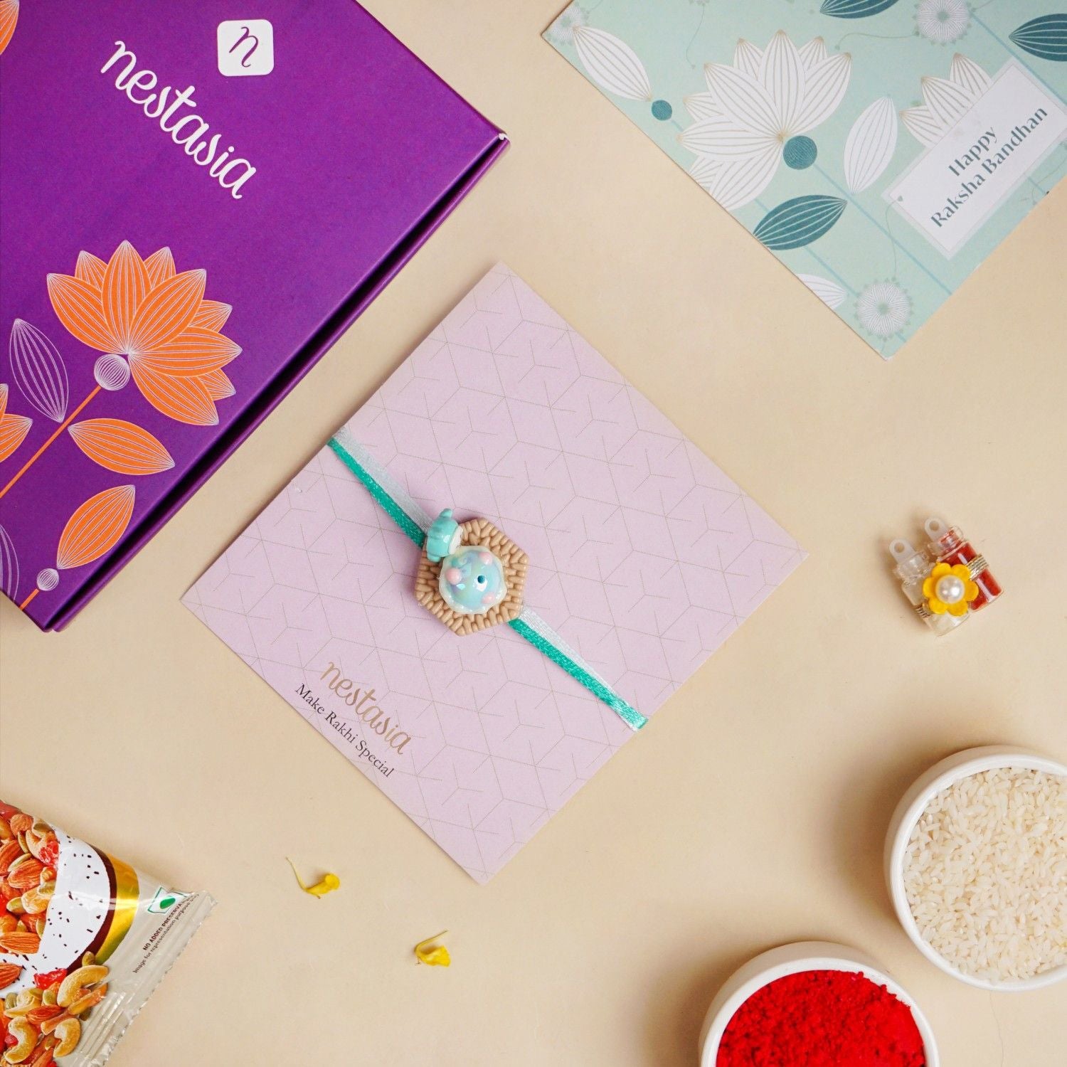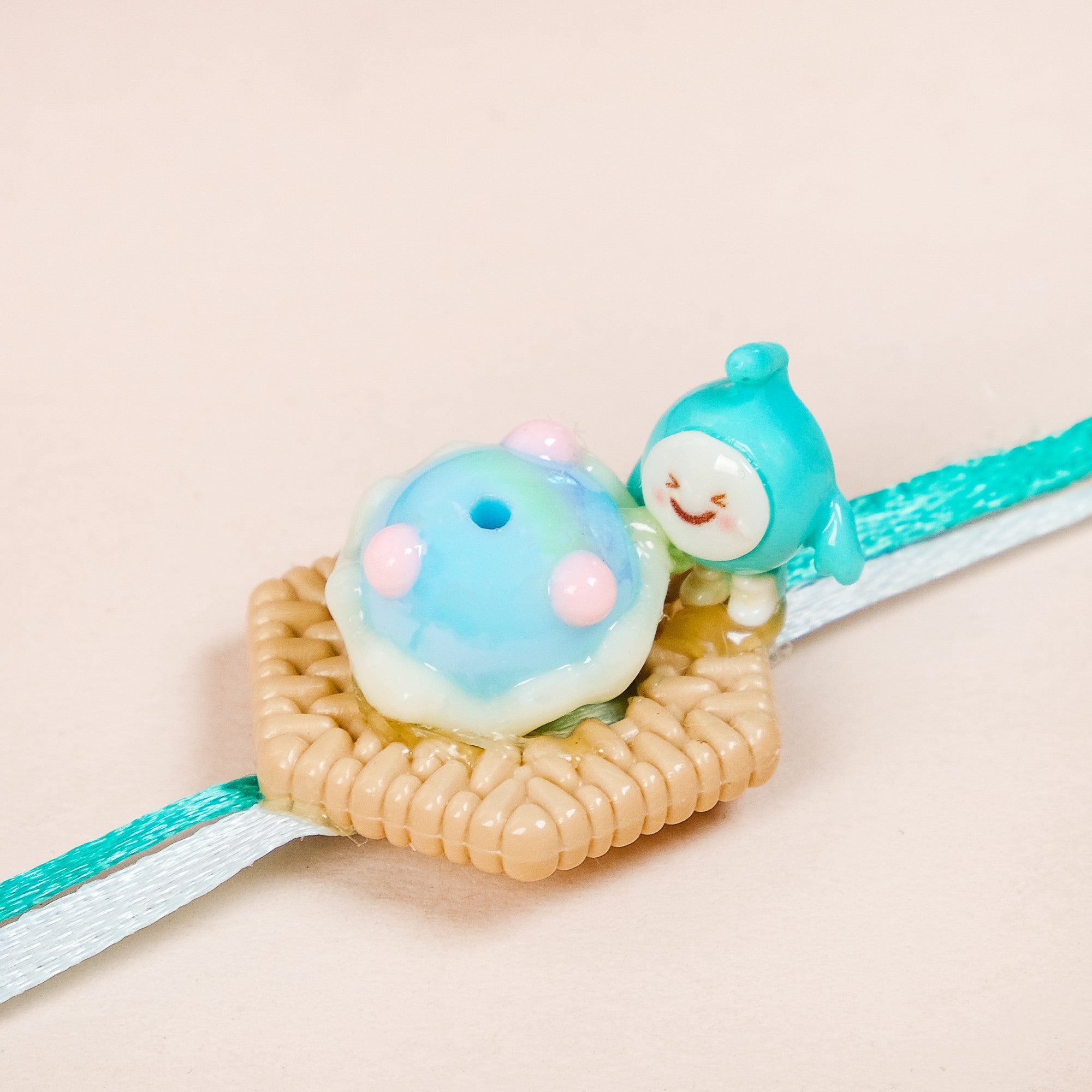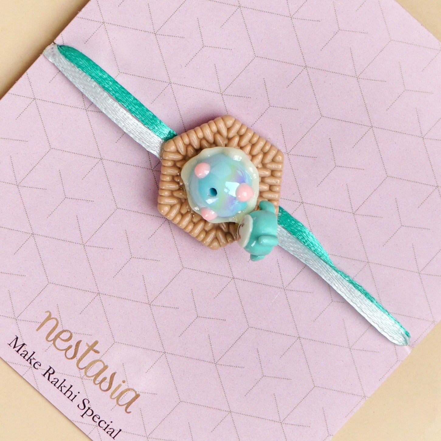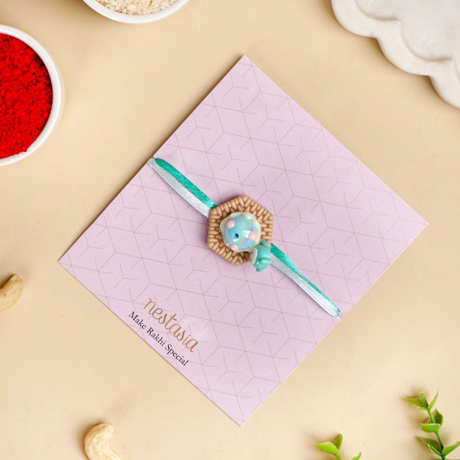 This unique 3D design Rakhi with an adorable chubby cheeks character is made of durable PVC material. It is attached to two different coloured ribbons and gives out a big sense of poolside comfort with its joyful creature sitting next to a pastel floating ball. It includes 1 Rakhi, 1 dry fruits packet, and 1 roli chawal bottle set.