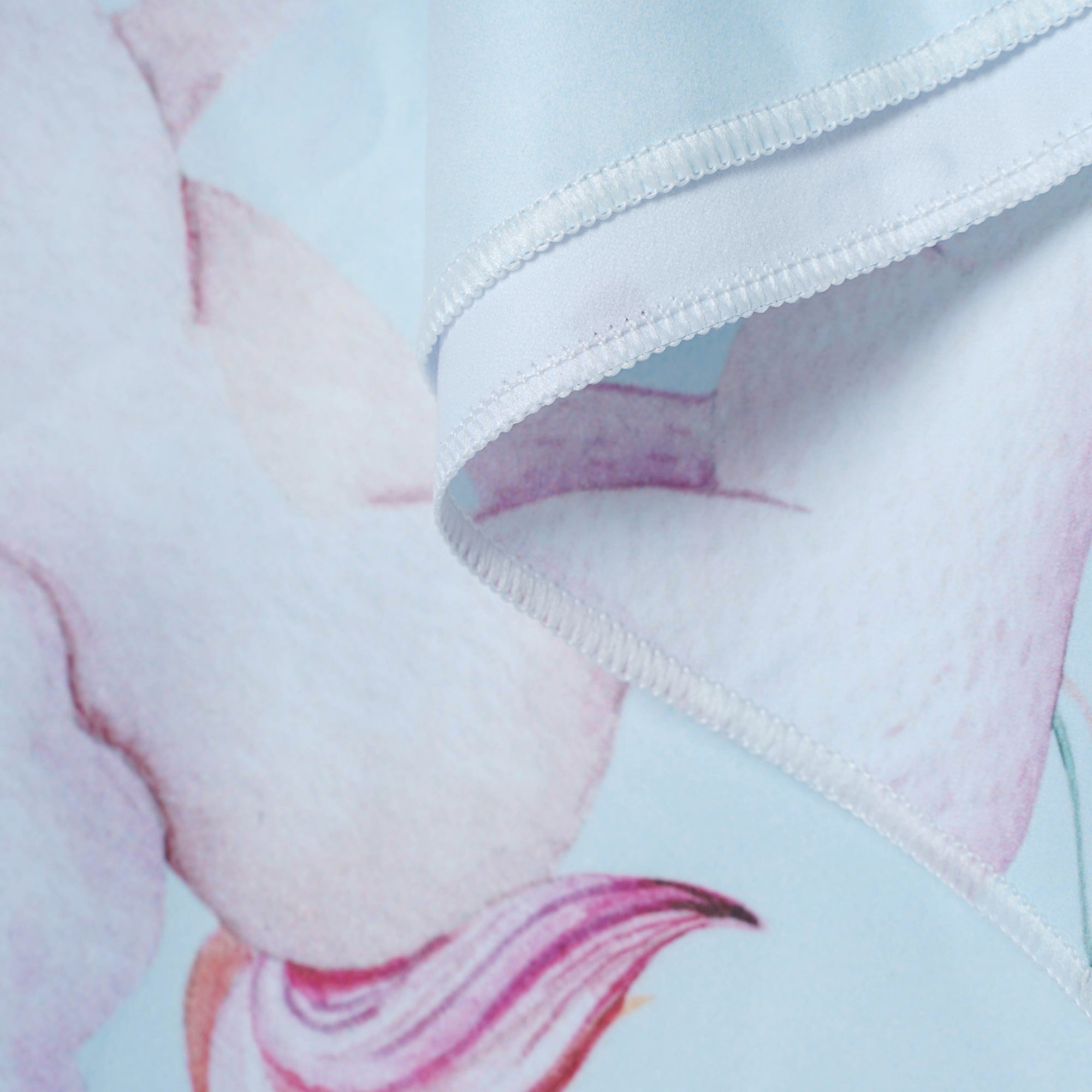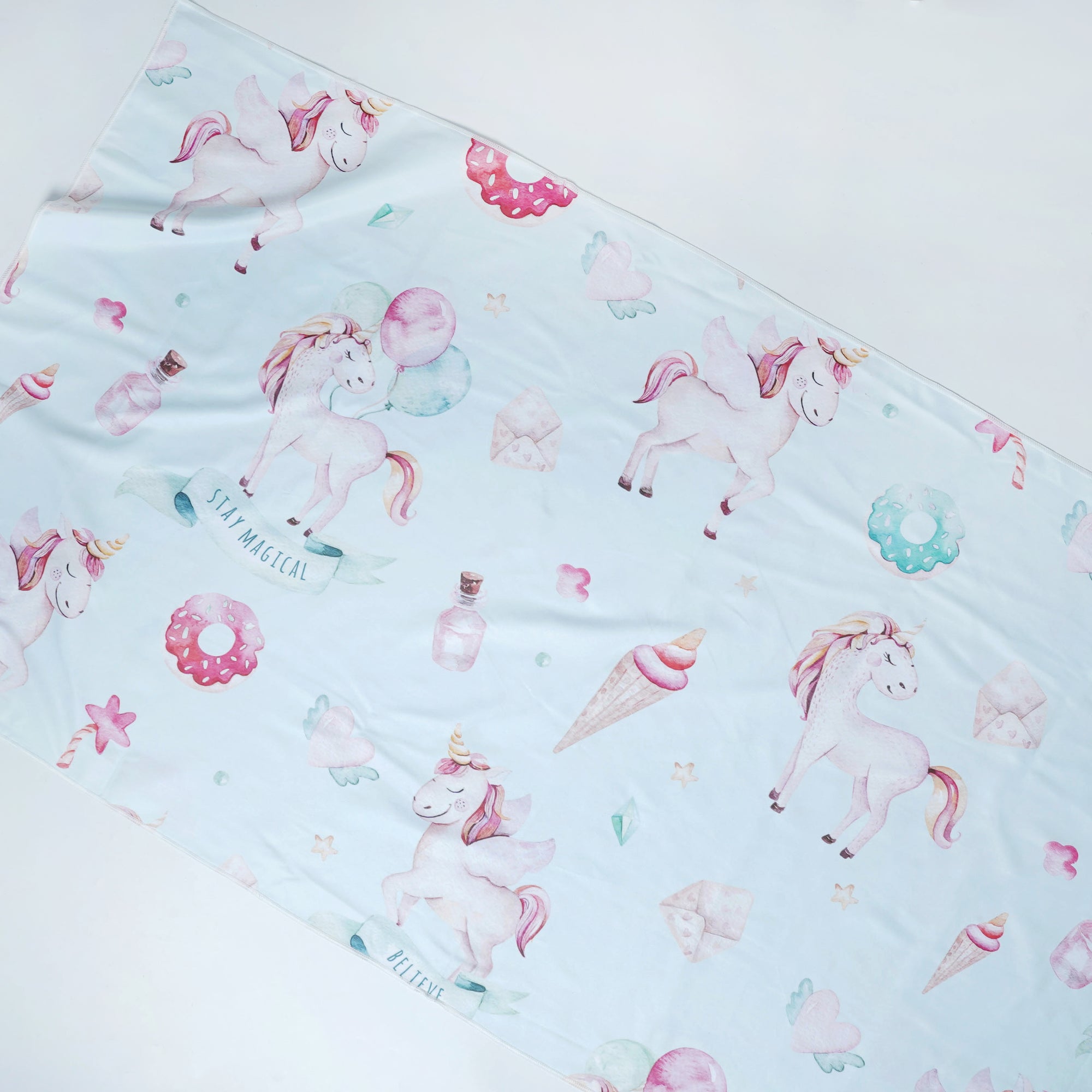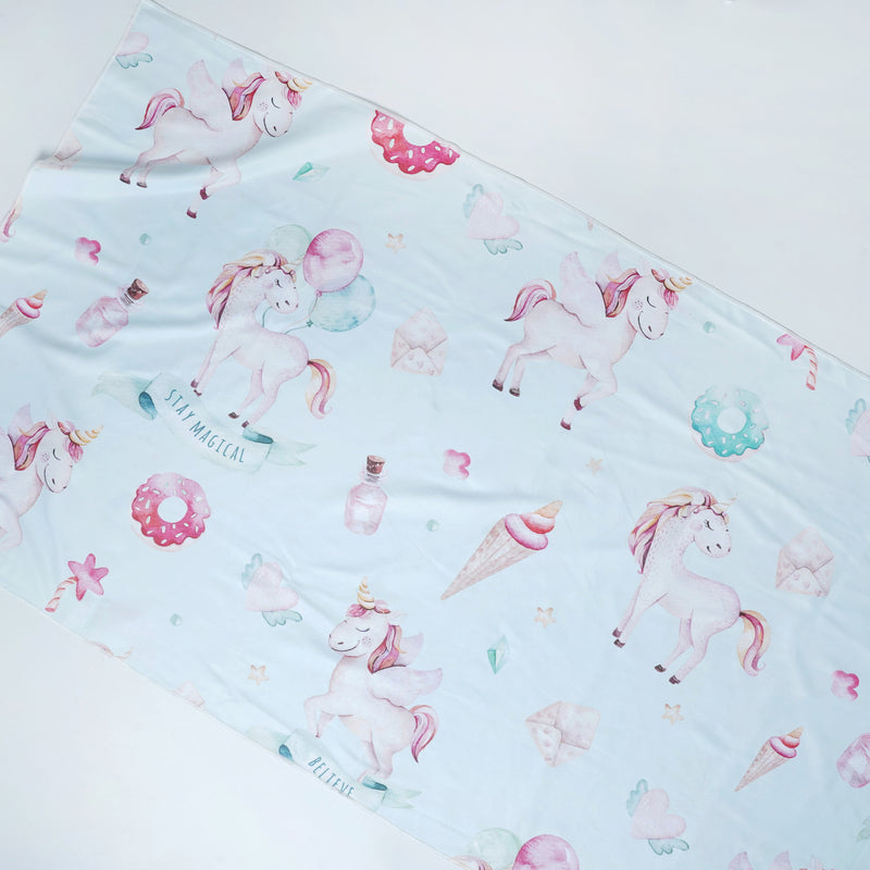 Endearing unicorn print towel in a light baby blue shade which is ideal to be used as a baby towel. The multipurpose towel is made of premium quality soft material, and will contribute to a good after bath experience. Other than unicorns, the bath towel has ice-cream, love letters, donuts, perfume bottles and the words 'stay magical' printed on it, which further adds to its endearing quality. Compact and lightweight, the towel dries very quickly, leaving the skin soft and dry to the touch.