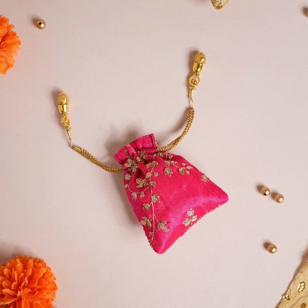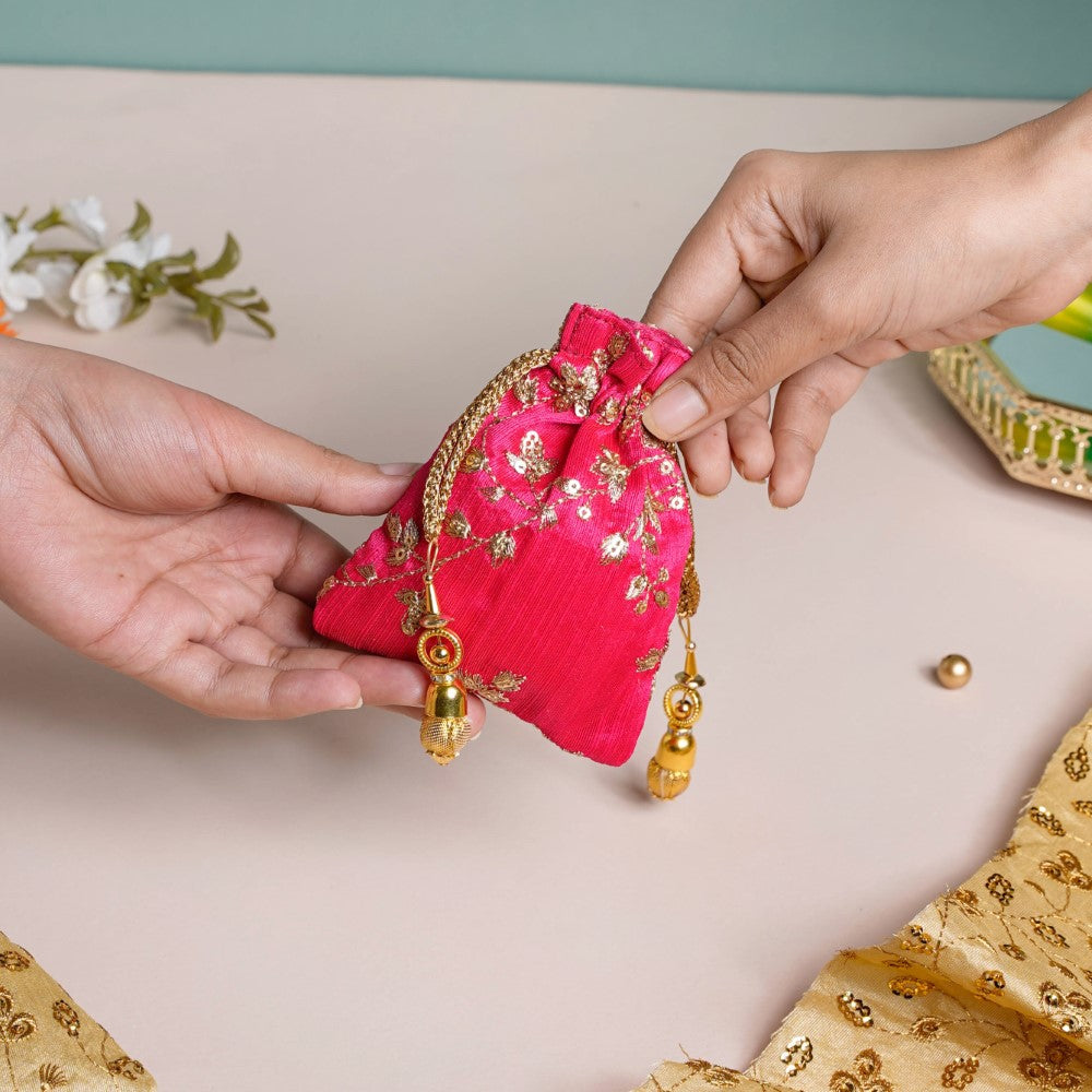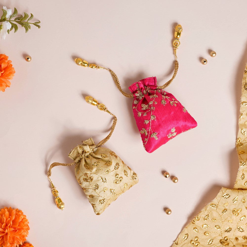 The set of 2 shagun potli bags has been crafted with extreme attention to detail, to bring an accessory for gifting that exudes opulence and finesse. The 2 potli bags feature distinctive colours of magenta and gold and feature embroidered floral detailing with lustrous golden threads. The party potli bags have a pull-out drawstring enclosure that is adorned with metallic gold beads. The potlis can be used for gifting shaguns, and trinkets such as rings, earrings, and bracelets on wedding ceremonies or festive occasions.