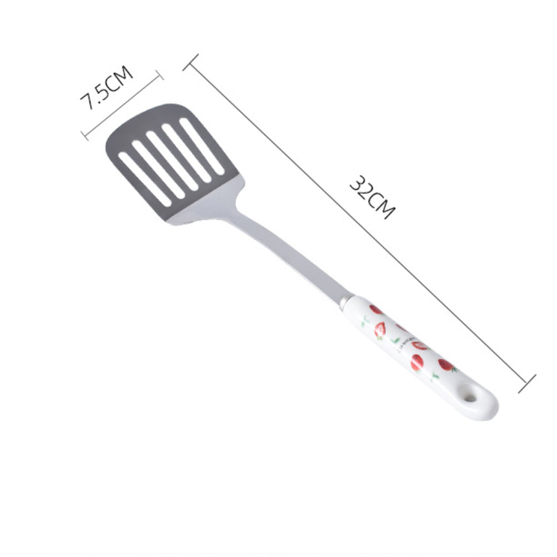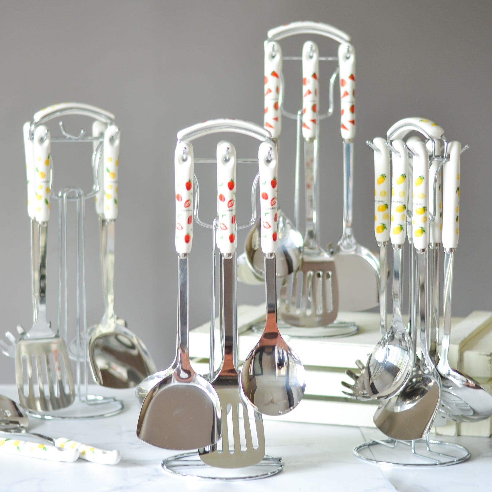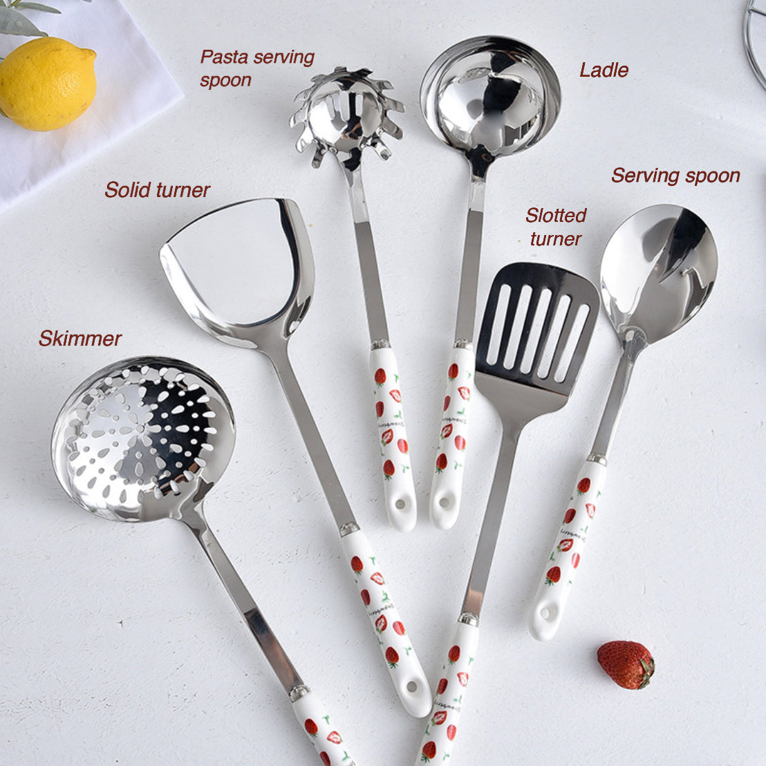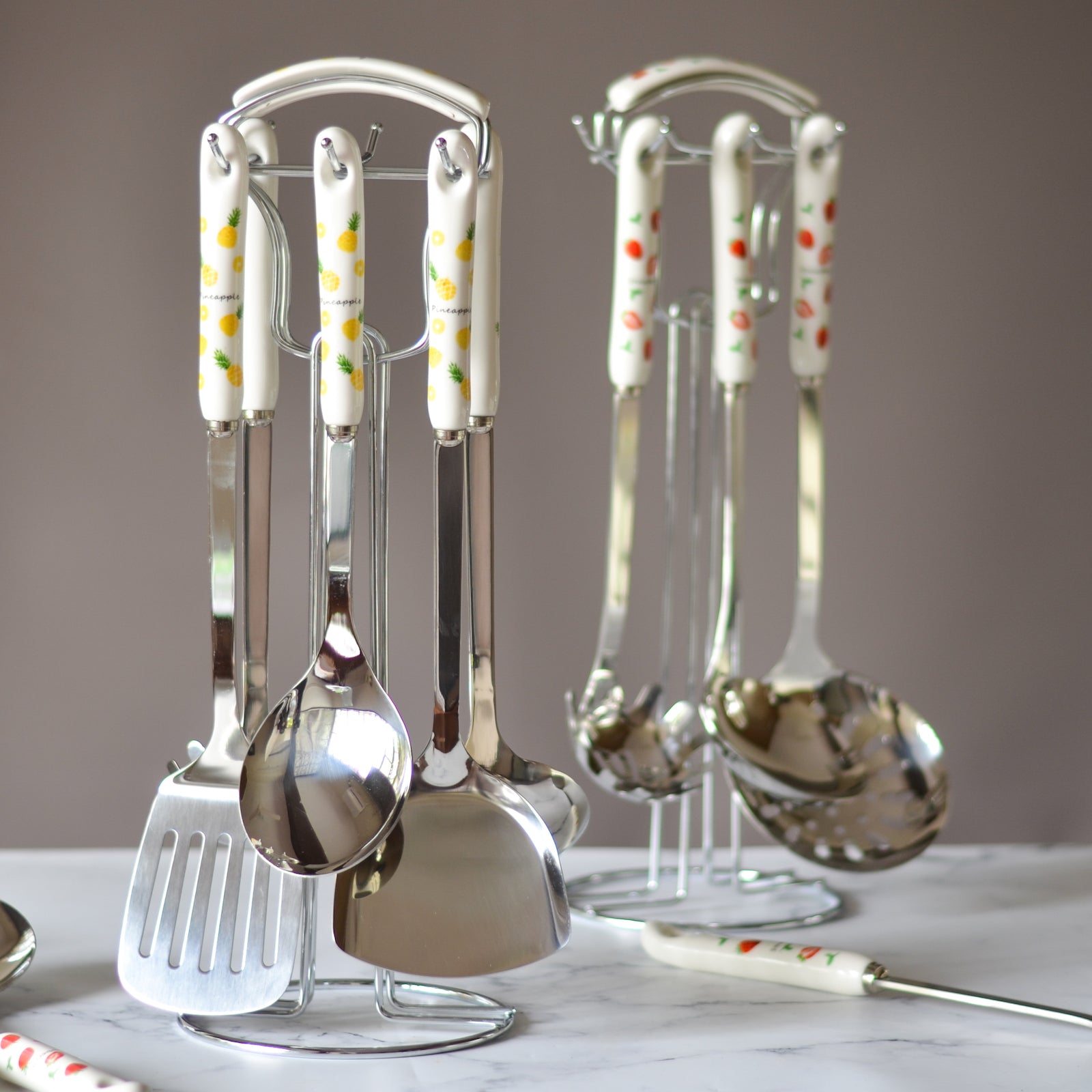 Items Included: 1 ladle, 1 serving spoon, 1 pasta serving spoon, 1 skimmer, 1 solid turner, 1 slotter turner, 1 stand
