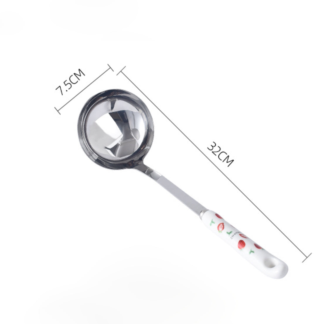 Size: Ladle - 32cm x 7.5cm , skimmer - 34cm x 11.5cm, serving spoon - 30cm x 8cm, pasta serving spoon - 31.5cm x 8cm, solid turner - 35cm x 10cm, slotted turner - 32cm x 7.5cm, stand - 41cm x 14cm