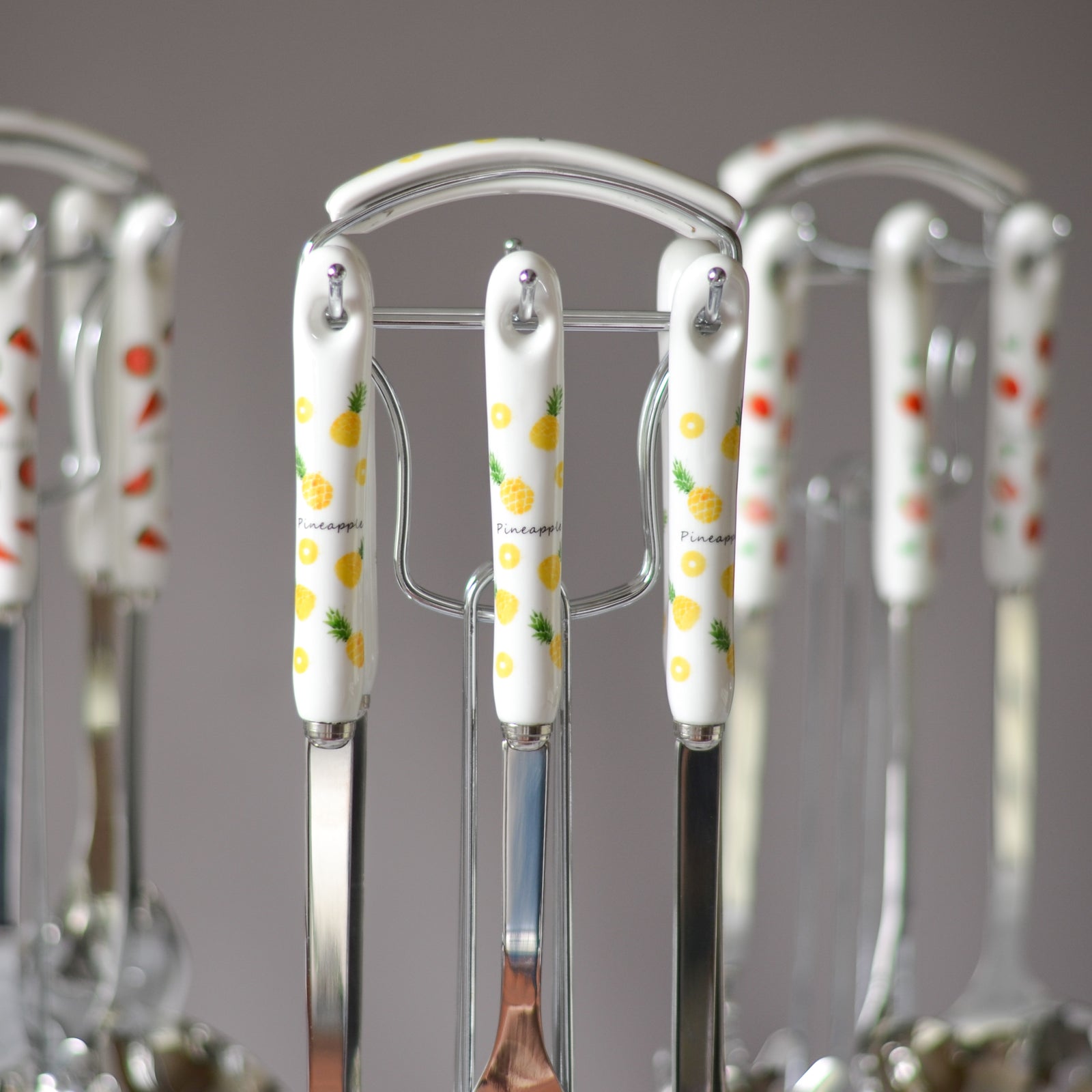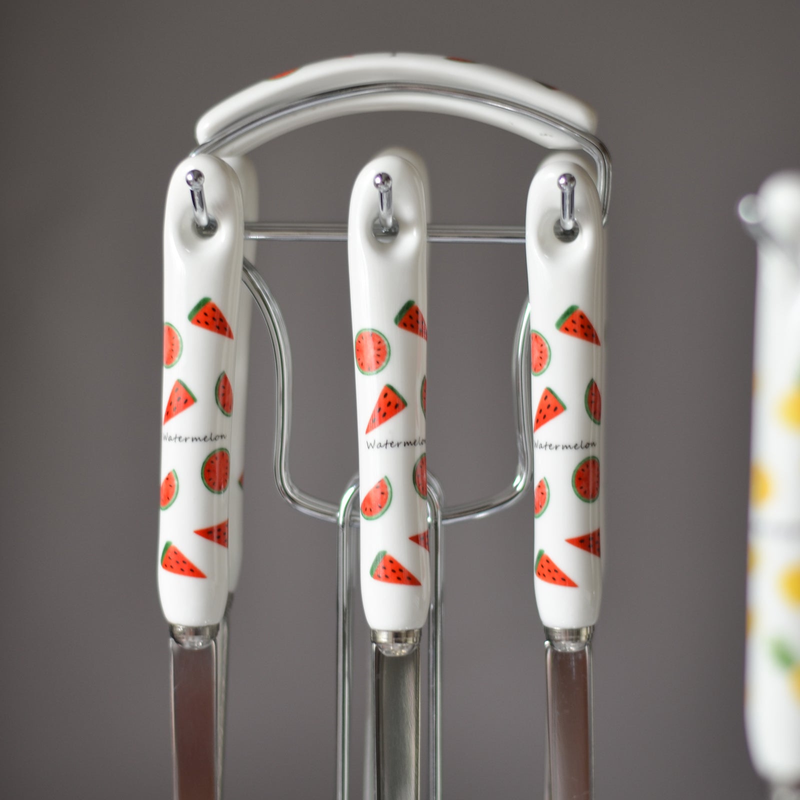 Kitchen cutlery set with stand that comes in 4 fruit variants. The kitchen equipment have a silver base and white handle that have prints of water melon, pineapple, strawberry and lemons. The quirky kitchenware set is a great way of making cooking and serving more interesting that can uplift the mood of the dinner setting.