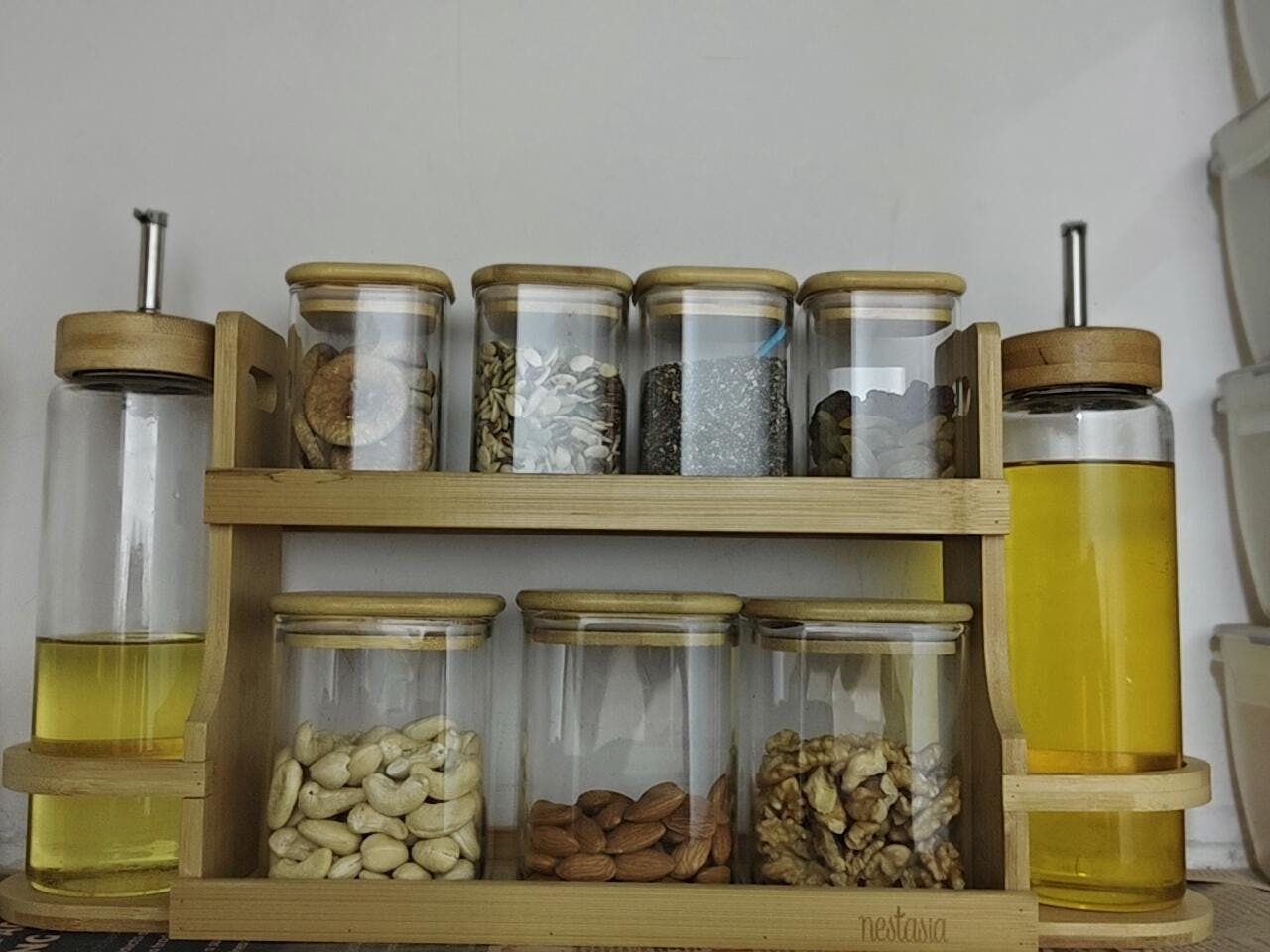 The organiser set includes 3 large glass jars (400ml each), 4 small spice jars (220ml each), and 2 oil dispensers (250ml each). Each jar and bottle comes with secure bamboo lids and silicone gaskets to keep your spices and oils fresh. The oil dispensers feature rust-proof stainless steel spouts for easy pouring.