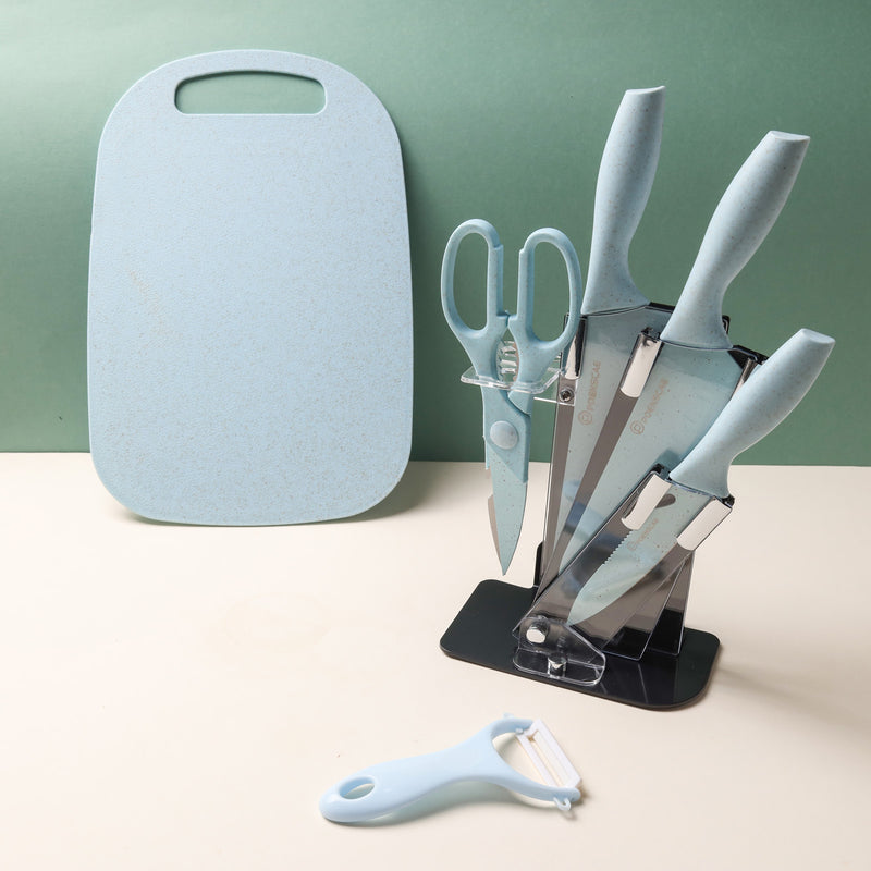 The knives, pair of scissors, peeler, and chopping board are a neat and orderly set with a stand, which gives one option in a range of how and what to chop, and is an essential in kitchen utilities.