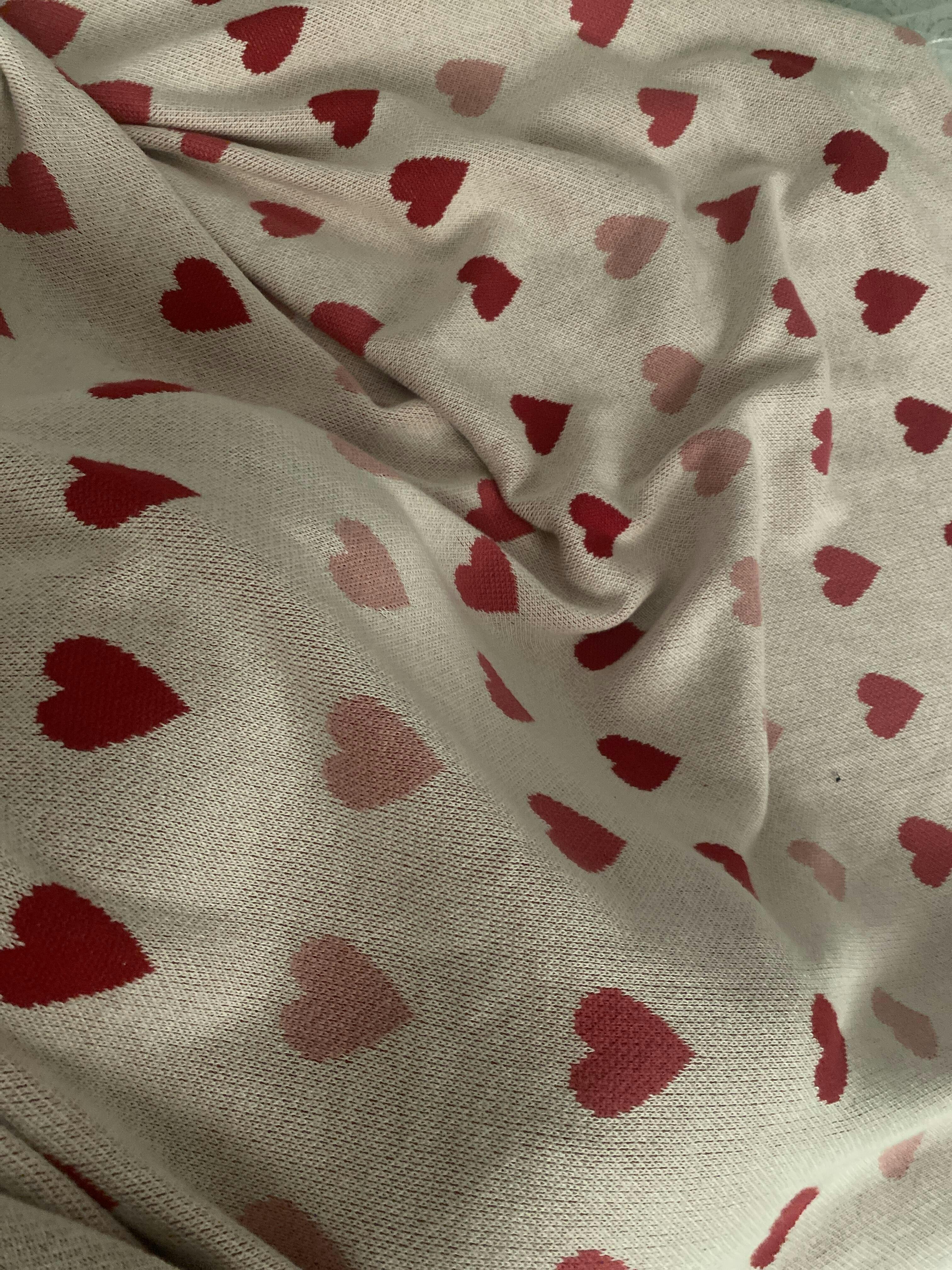 Design: Exuding the ultimate hygge vibes, this throw blanket is all about the details. One side features a creamy base adorned with rows of charming hearts in a beautiful mix of warm and soft hues. It’s a playful yet refined design that adds a welcoming feel to any room. Flip it over, and you’ll discover a finely knit texture, where strands in complementary shades of red, pink, and cream come together in perfect harmony.