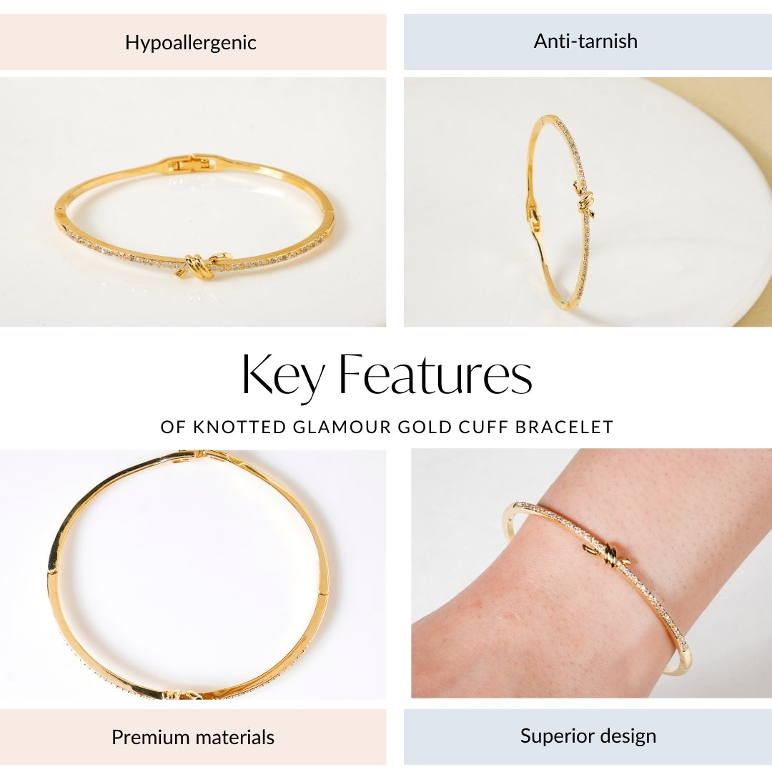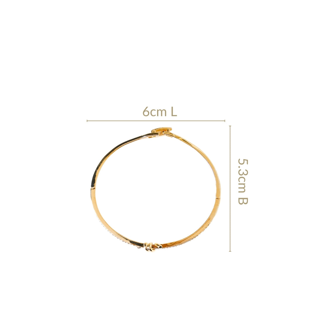 A timeless statement of elegance, this gold-toned bracelet features a delicate twisted knot design at the top, symbolising grace and unity. Adorned with small shimmering stones, it catches the light beautifully, adding a subtle sparkle to any look. The sleek, polished finish enhances its sophisticated charm, making it perfect for both everyday wear and special occasions. Designed for comfort and security, the bracelet comes with a foldable clasp that ensures a snug yet adjustable fit. A versatile piece that seamlessly blends classic allure with modern refinement.