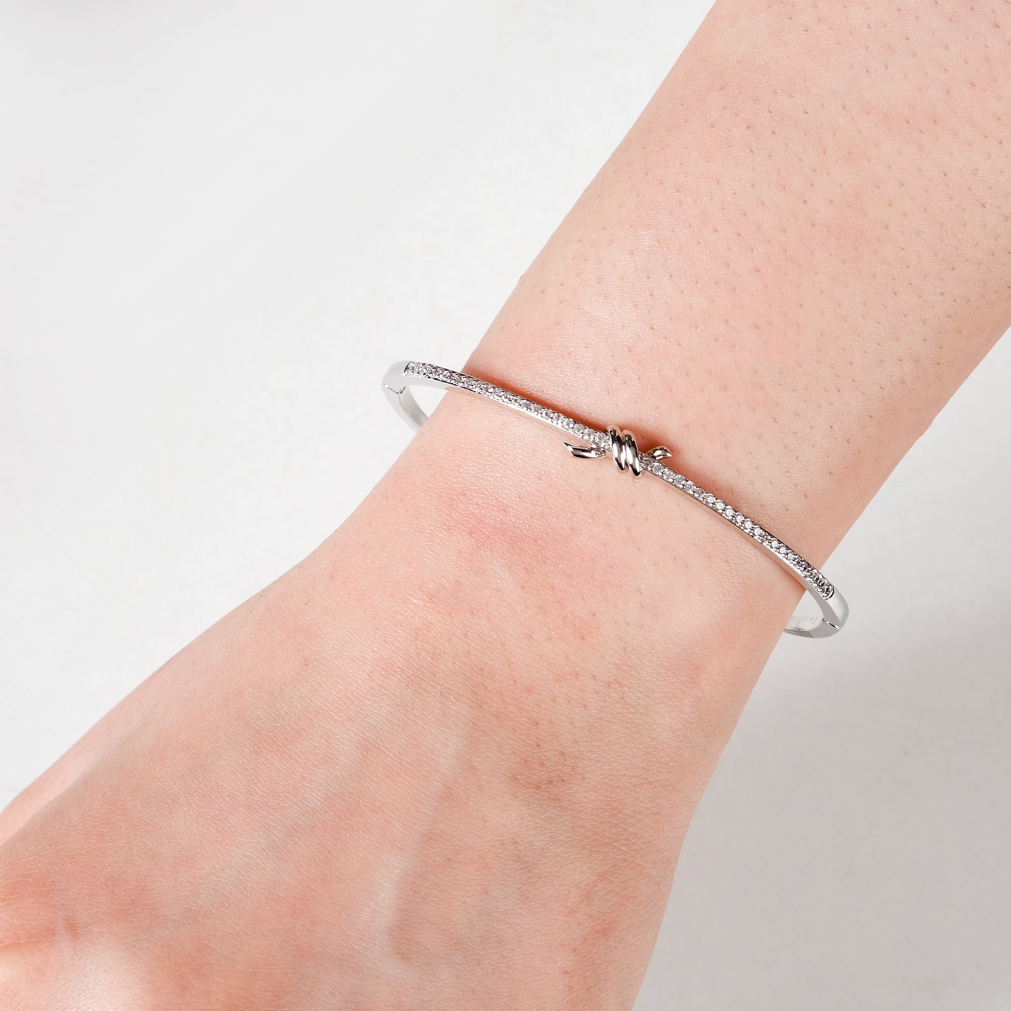 Gracefully intertwined with a twisted knot design, the silver-toned bracelet exudes elegance and sophistication. Adorned with delicate shimmering stones, it catches the light beautifully, adding a subtle sparkle to any look. The foldable clasp ensures a secure and comfortable fit, making it perfect for both everyday wear and special occasions. Whether worn solo for a minimalist statement or stacked with other accessories, this bracelet is a versatile addition to any jewellery collection, effortlessly blending sophistication with modern style.