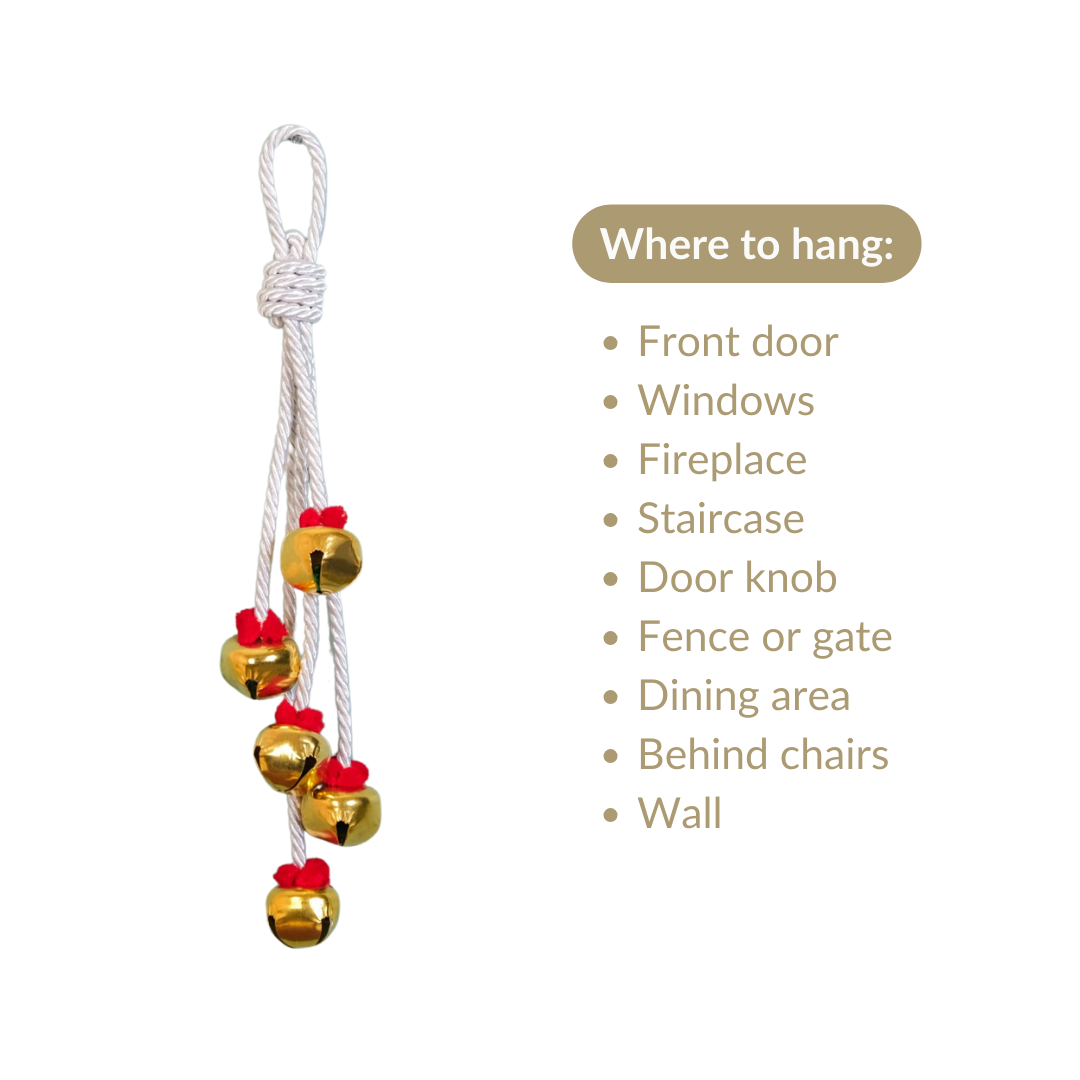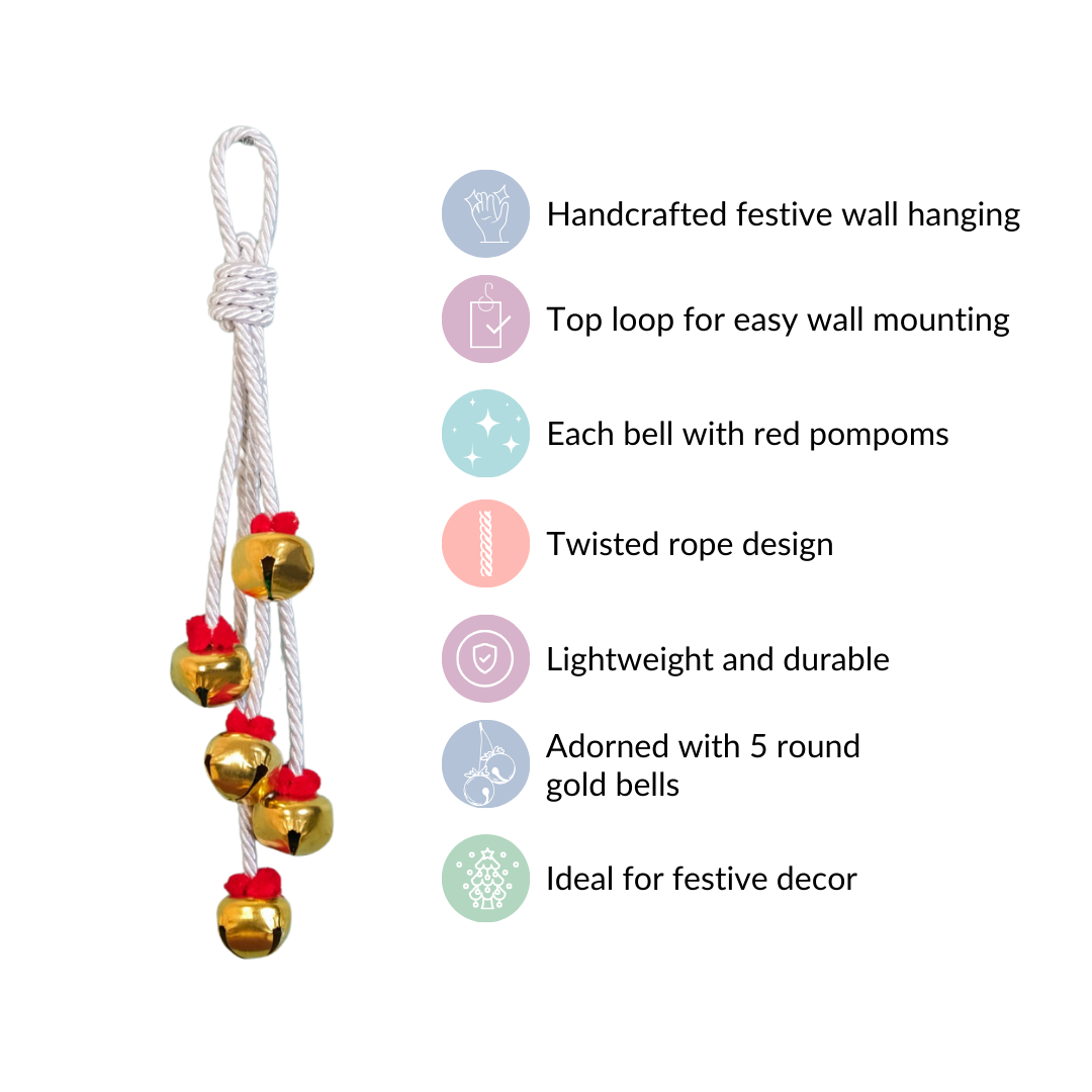 The festive wall hanging can be an excellent choice as a backdrop for holiday photos or gatherings. With its charming twisted rope design and five round gold metal bells accented with vibrant red pompoms, it adds a festive and decorative touch to the background.