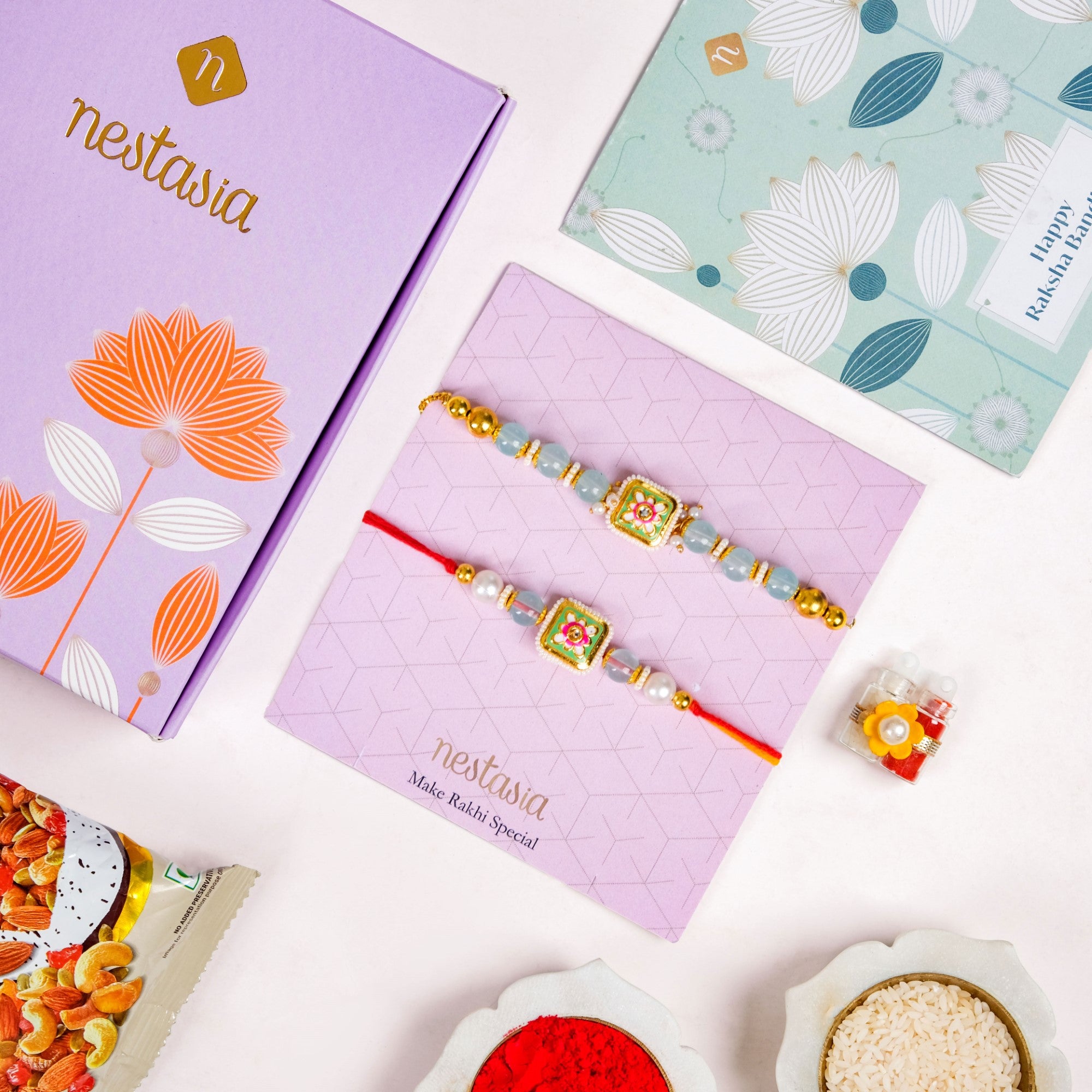 Infused with timeless traditional motifs and rich, festive colours, this Rakhi and bracelet set brings an air of regal elegance to your Raksha Bandhan celebration. The design centres around intricately crafted square floral pendants, each adorned with vibrant enamel detailing that adds depth and vibrancy to the piece. These centrepieces are beautifully framed with dainty faux pearls and paired with beads in soothing seafoam green and pearl white, creating a harmonious blend of tradition and refinement. The bracelet is finished with an adjustable gold-toned chain and elegant hanging pearl drops that add movement and grace to the design. Perfectly suited for sister-in-law gifting, this thoughtfully curated set includes 1 roli-chawal bottle set, a pack of premium dry fruits, a heartfelt wish card, and a festive gift box, making it a complete, elegant, and effortless gifting choice for the occasion.