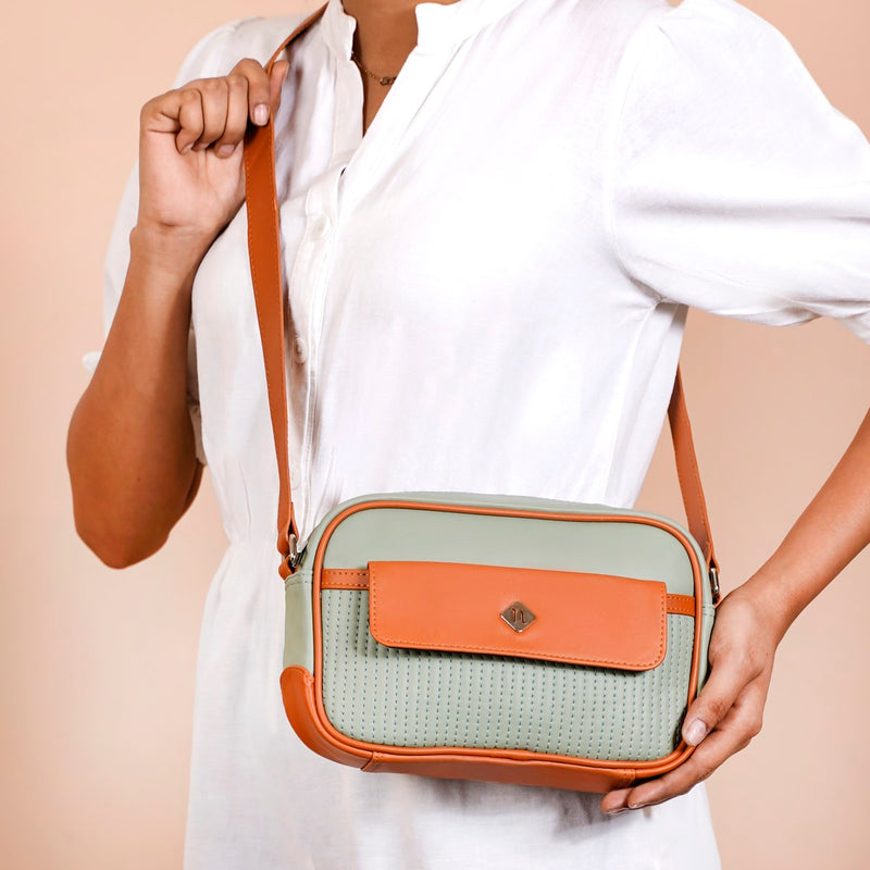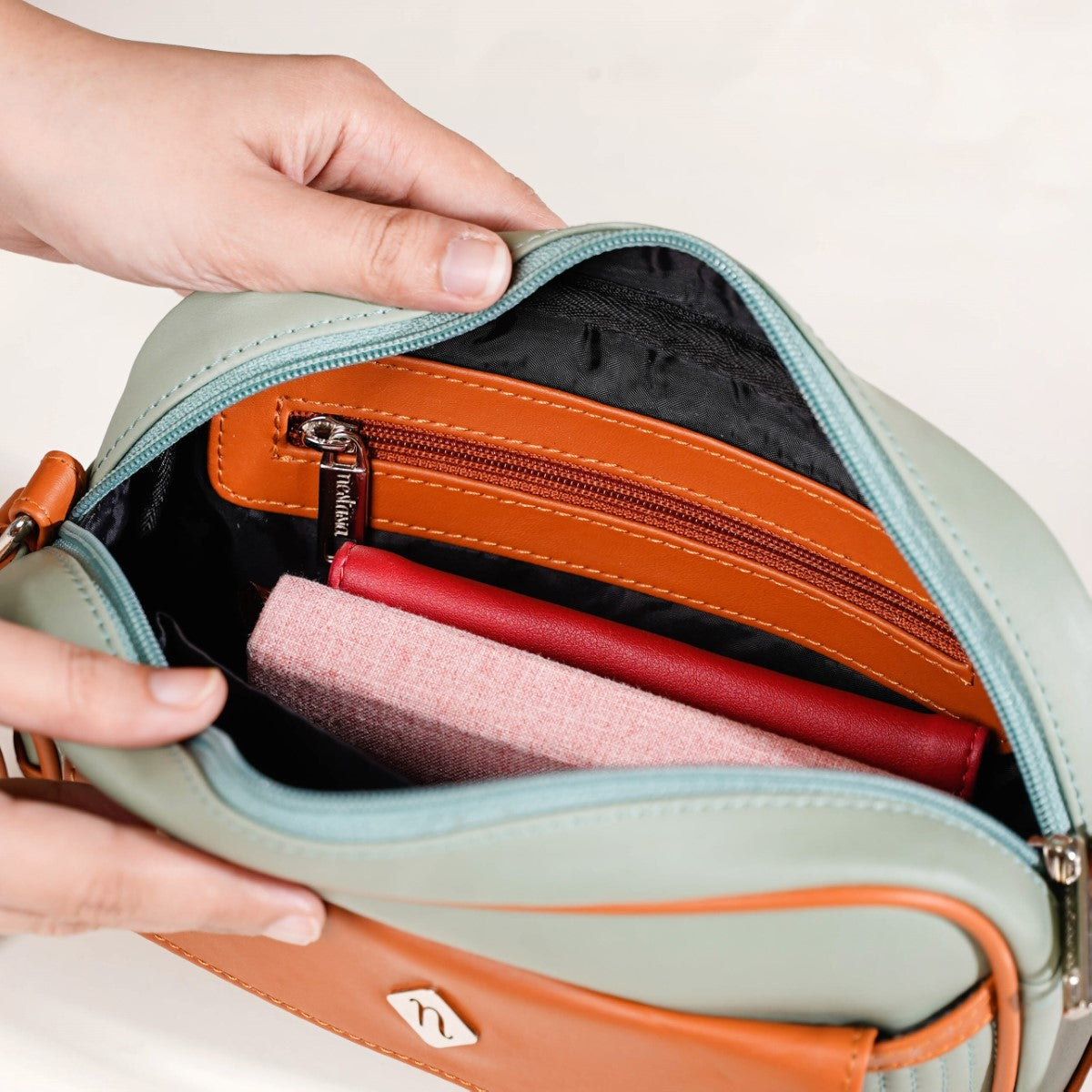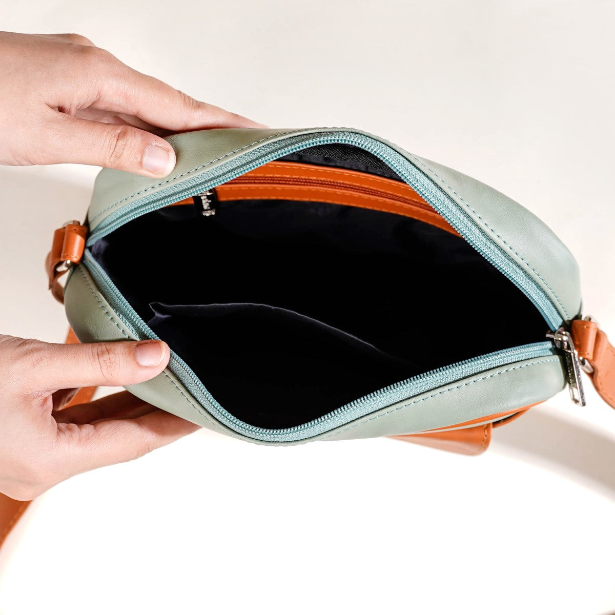 This sling bag in mint and tan offers a unique combination of style and functionality. Its eye-catching color combination sets it apart, ensuring that you stand out in a crowd. Plus, it's made of vegan leather, catering to eco-conscious individuals. The taffeta silk interior sleeve and zippered compartment enhance its usability and interior organization, making it a perfect blend of fashion and practicality.