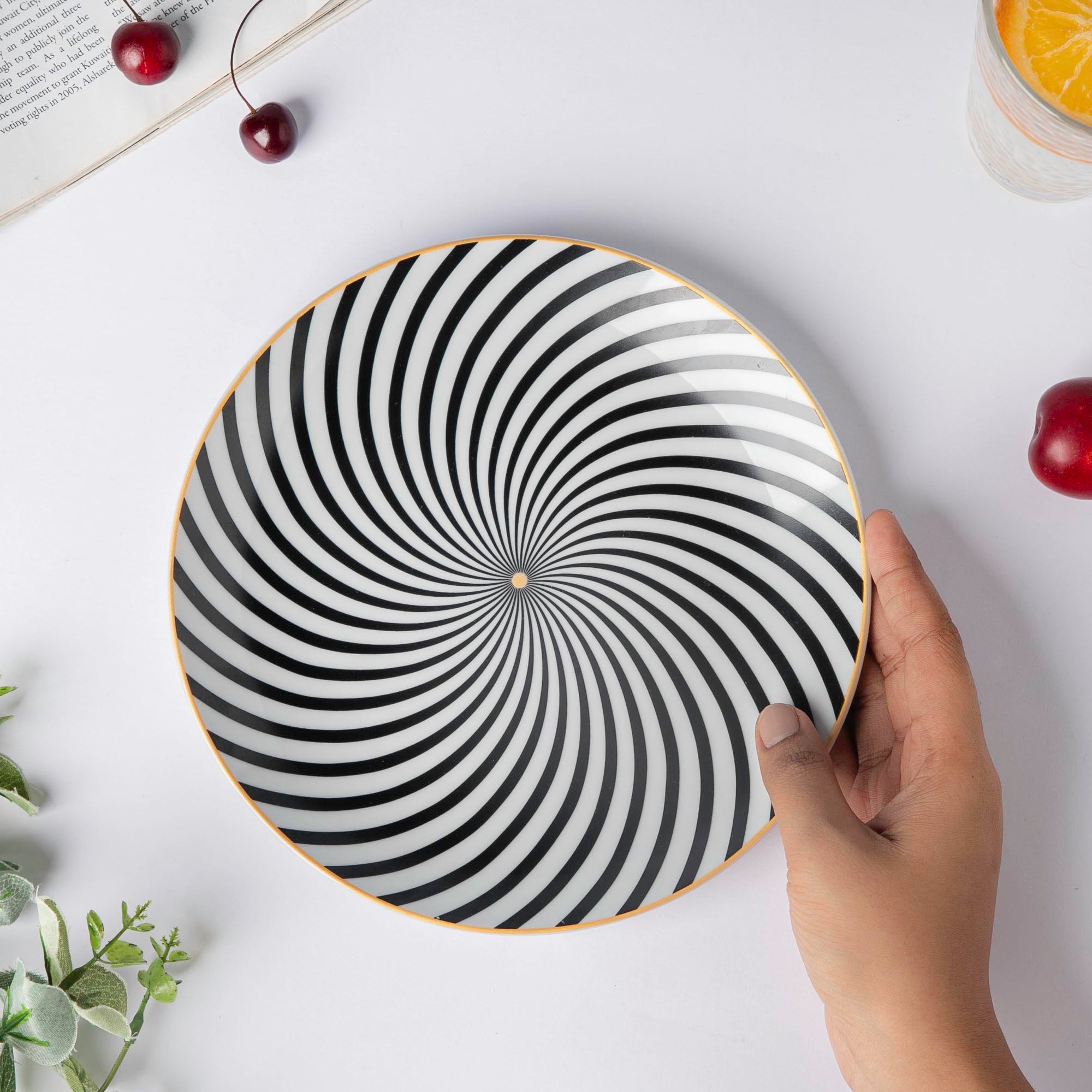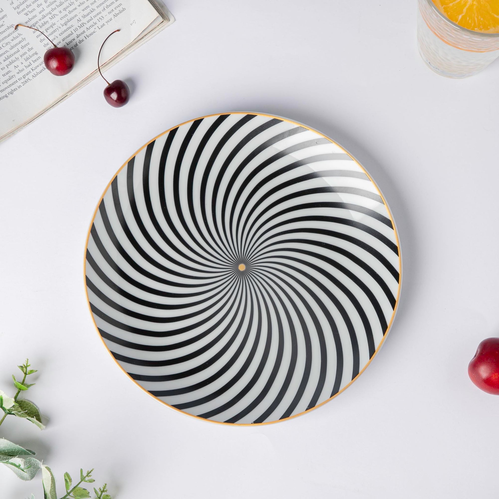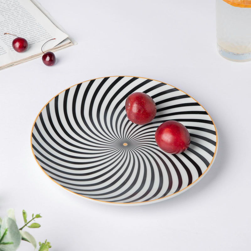 The best dish to add a unique appeal to the table is the ceramic plate that has been intricately designed with eye-cathching geometric patterns on the interior surface. The plate's slightly elevated rim makes it the ideal serving dish for soupy noodles or other dishes with a light gravy.