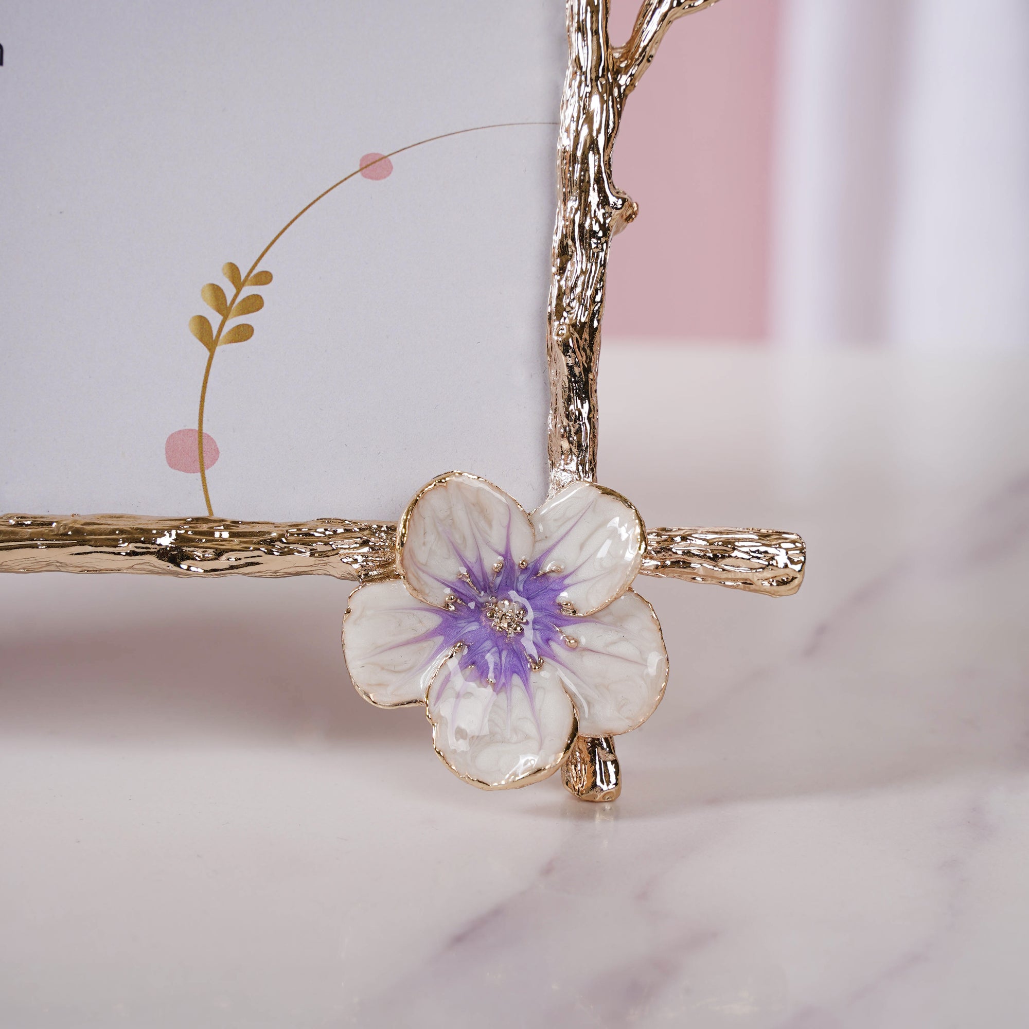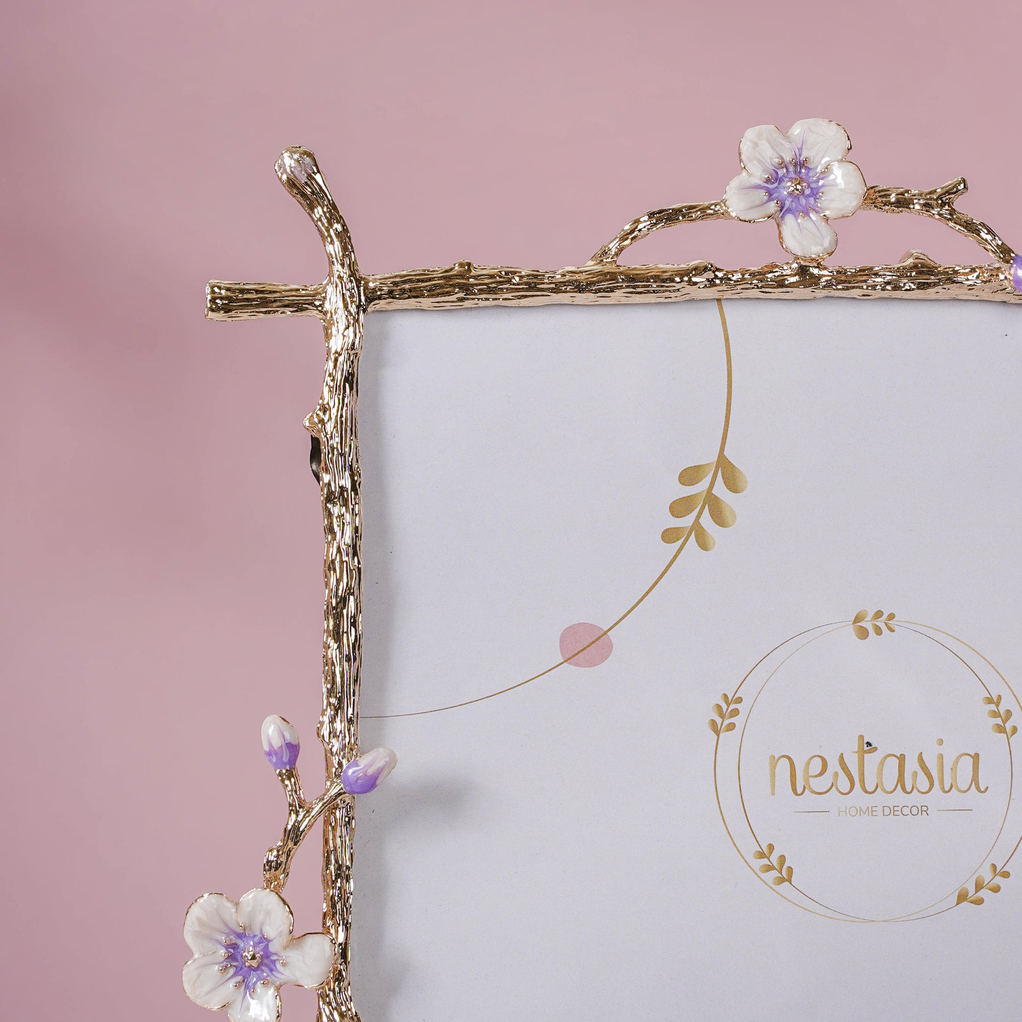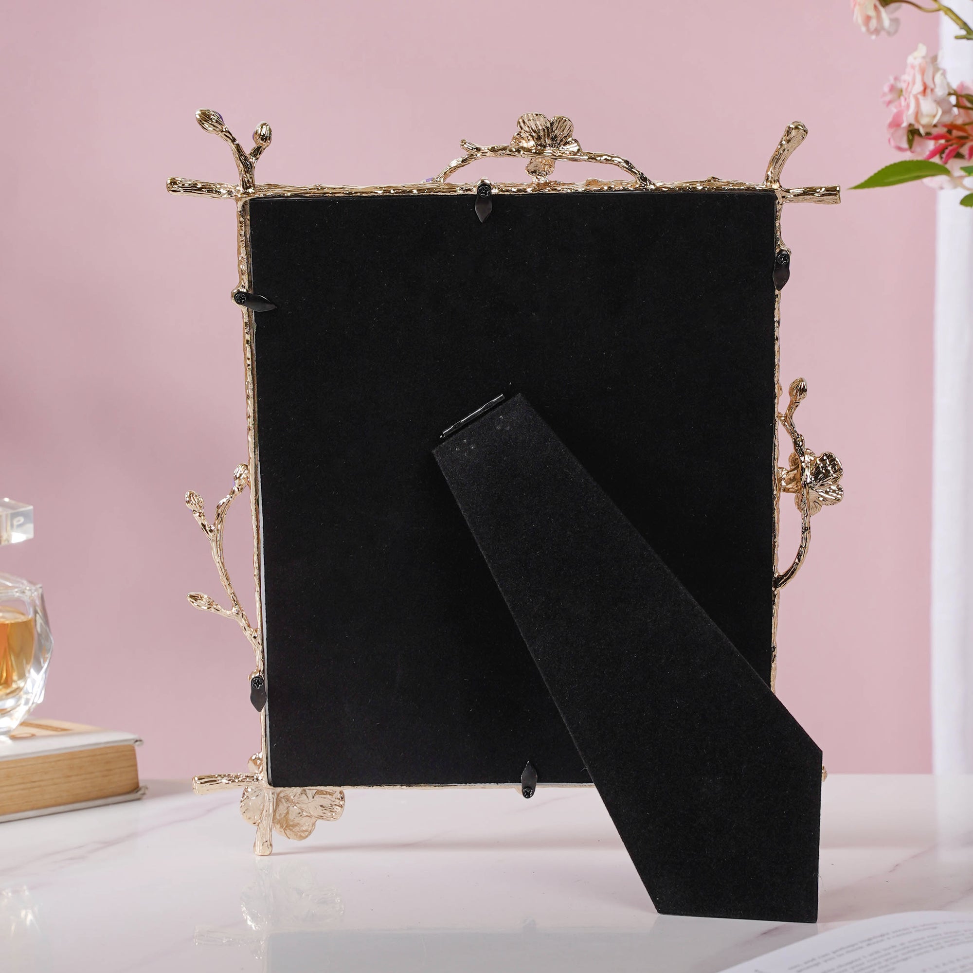 The golden-edged photo frame is the perfect case to protect all precious photographs. Thick golden borders line the photo frame on all sides, which at points take the shape of motifs resembling the stems of a plant. At one of the four corners, the stem attains monopodial branching. Plus, there are tiny flowers provided to amplify the elegant appeal of the photo frame.