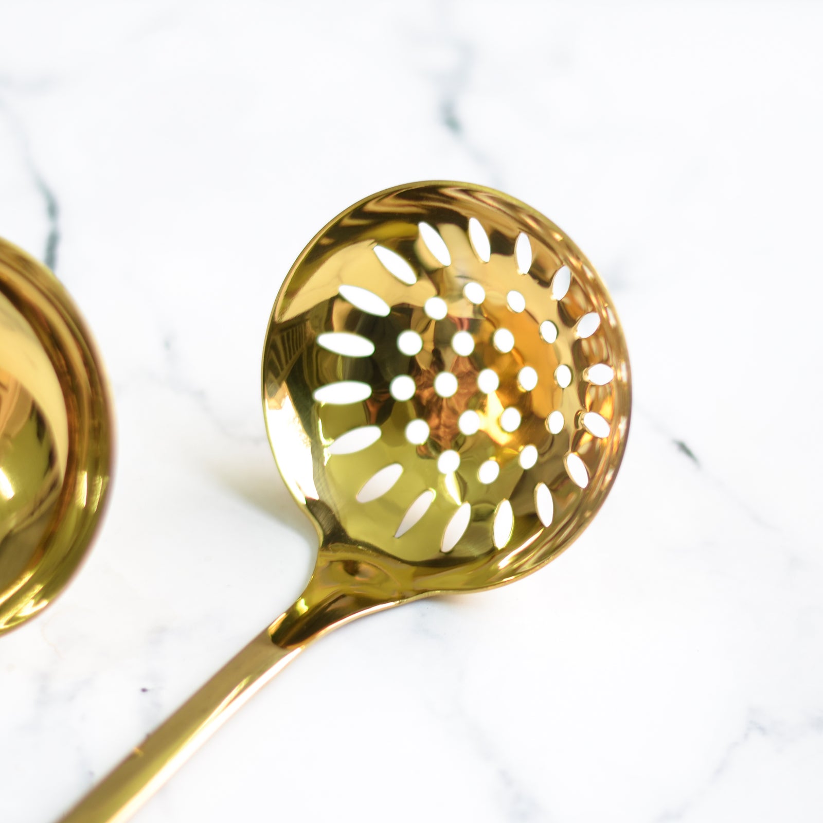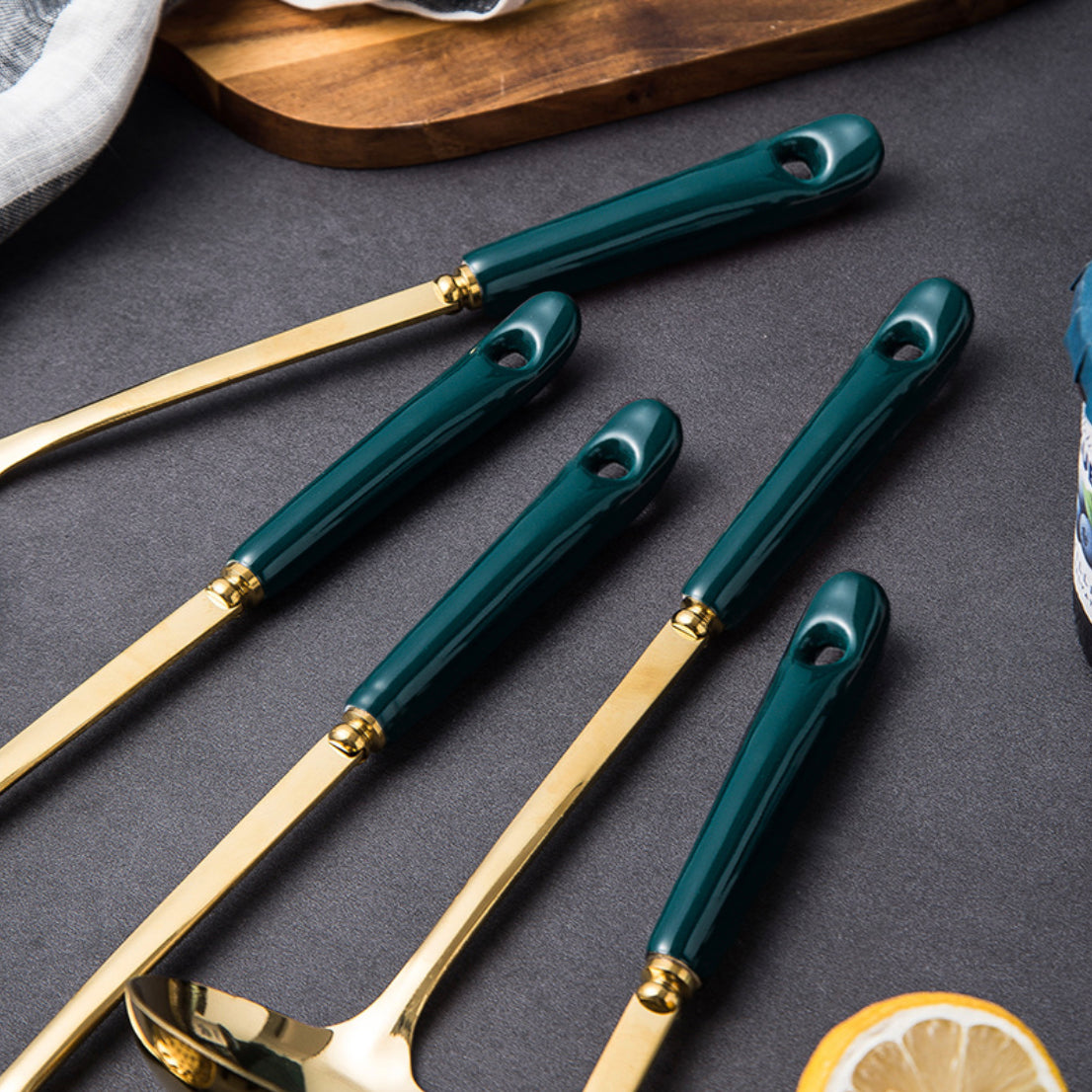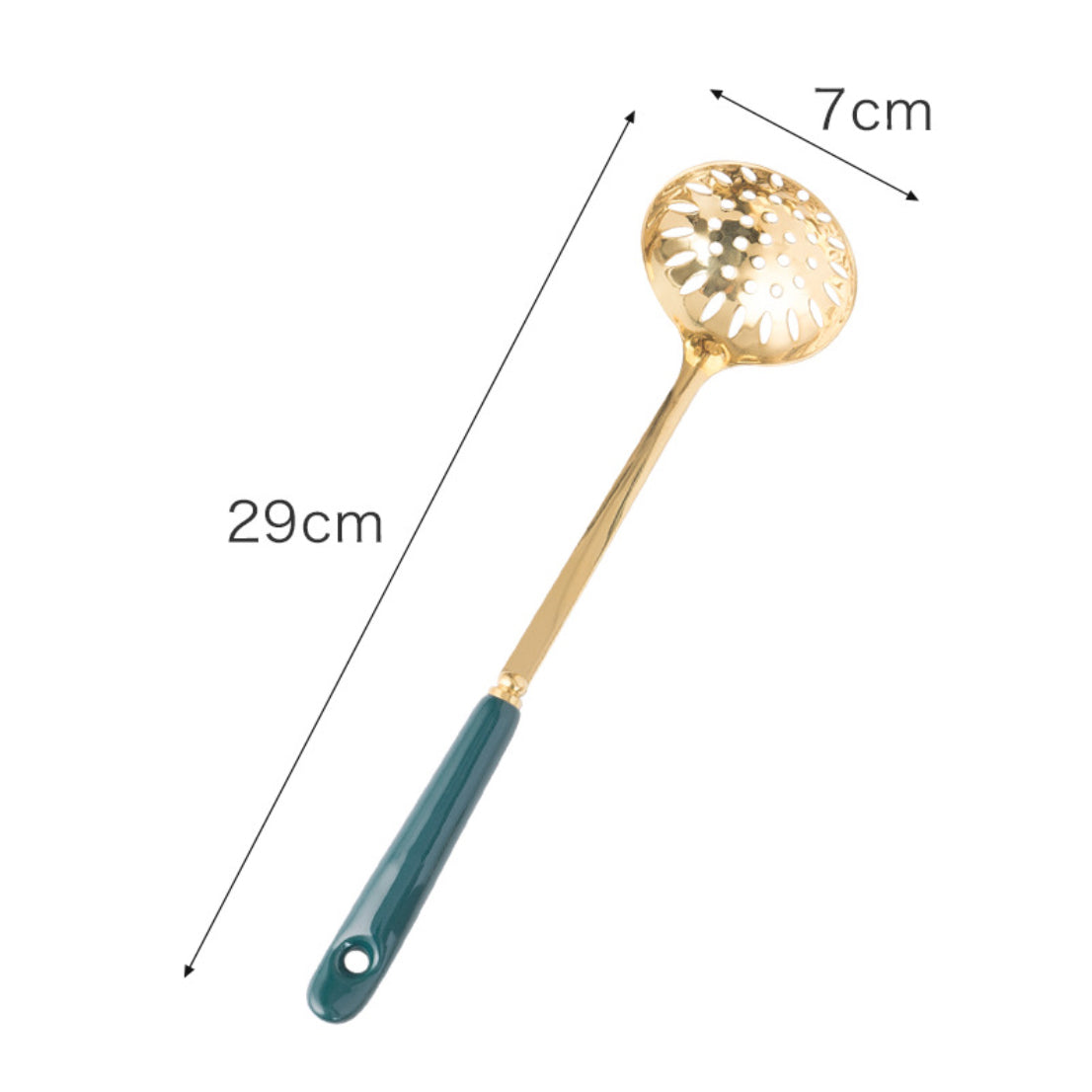 Ladle spoons in two variants that comes in a royal gold color with a blue handle. The ladle can be used for serving soup or stew or can also be used for making dosa or pancake. The slotted spoon or slotted ladle can be used for a helping of soups with diced veggies or noodles that will drain the liquid. The stylish ladles come with hole that makes it convenient to hang the set along with the teal color that can elevate a serving.