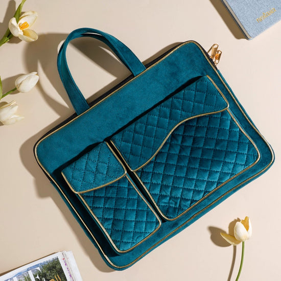 With our velvet laptop bag, enter a world of luxury and style. The laptop bag, made from premium quality velvet fabric, is the perfect combination of functionality and style. The velvety texture enhances the look of the laptop bag. The laptop sleeve's soft and quilted design protects your laptop from knocks and scratches while you're on the go, and the little pockets with magnetic closures make it easy to carry chargers, power banks, and other small items.