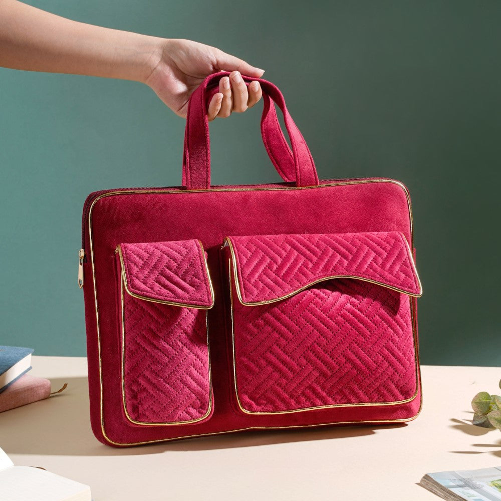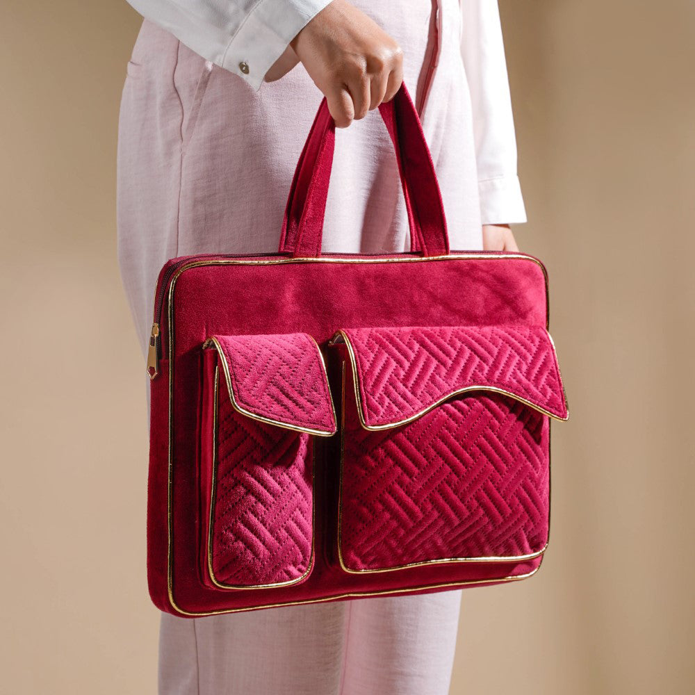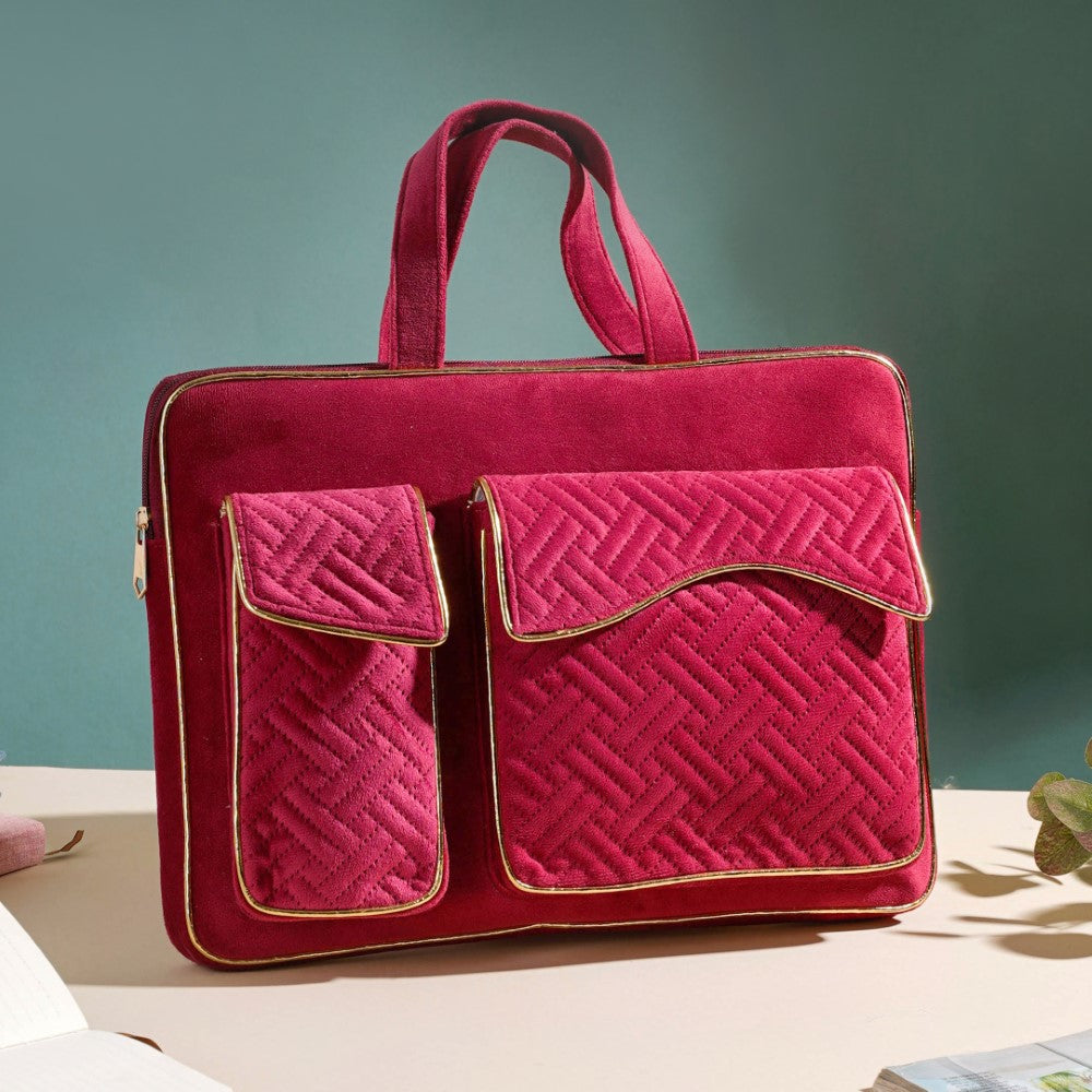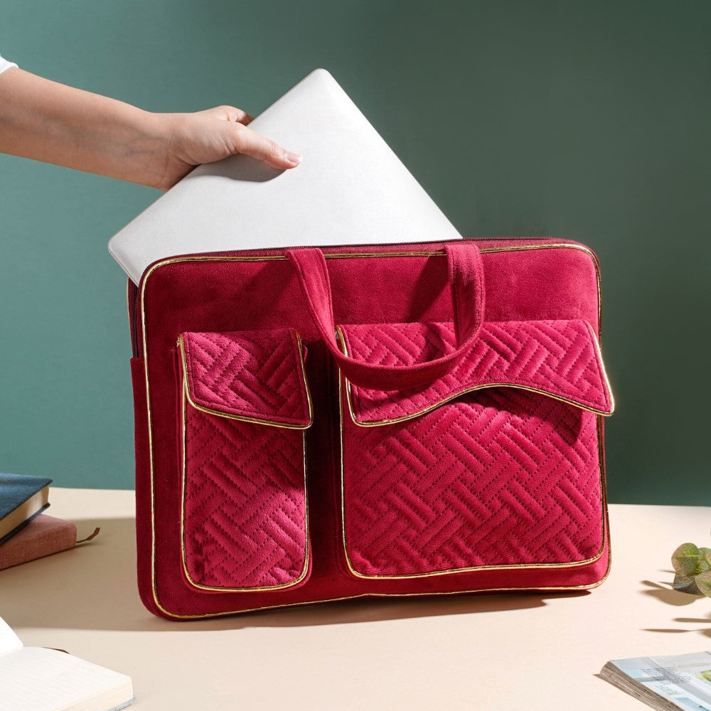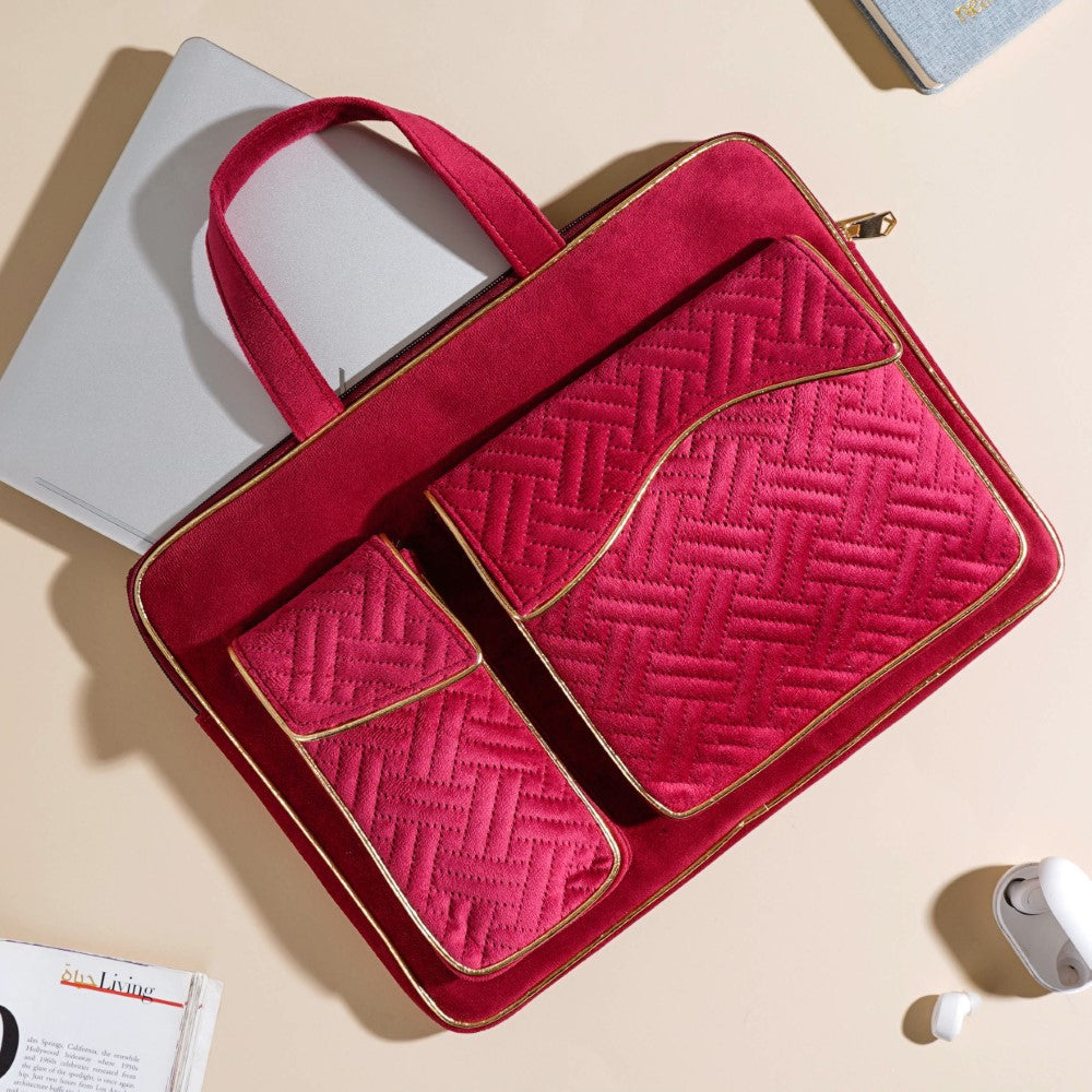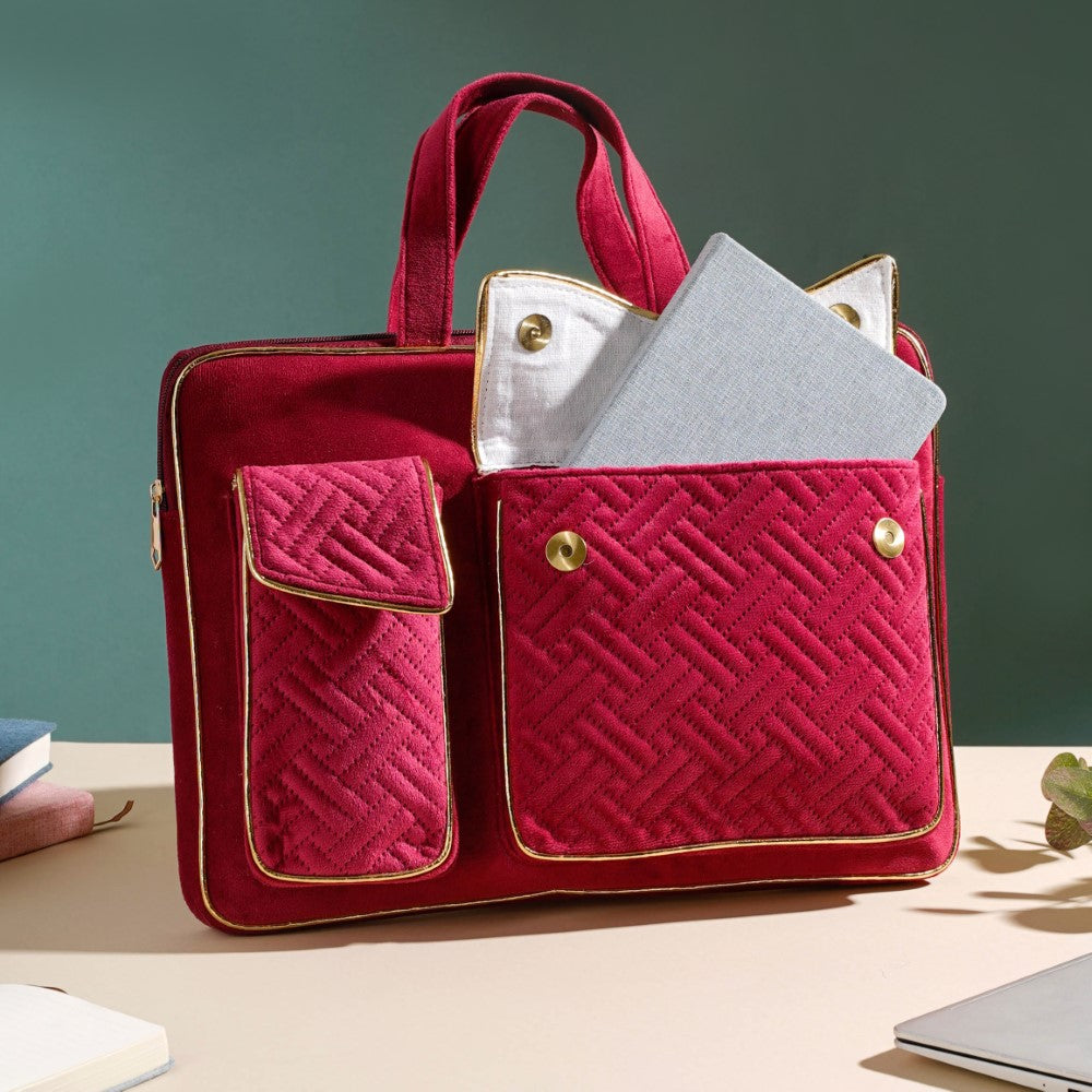 Step into a world of opulence and style with our velvet laptop bag. Crafted from premium quality velvet fabric, the laptop bag is an ideal amalgamation of utility and fashion. The velvety texture elevates the ordinary accessory into a contemporary must-have, adding a touch of splendor to your daily life. While the soft and quilted construction of the laptop sleeve safeguards your laptop from bumps and scratches on the go, the small pockets with magnetic closures will help you to store chargers, power banks, and other small items.