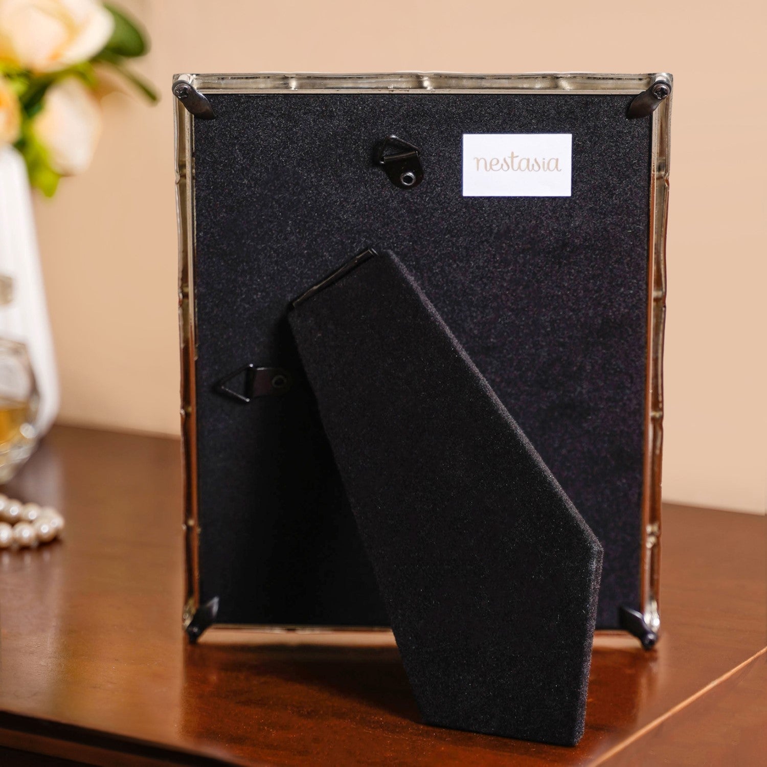 Design: Crafted from silver resin shaped like bamboo stems, this frame features delicate ridge details and a sleek, polished surface. The clear acrylic front preserves photo clarity and vibrancy, while the minimalist design lets your memories shine. A velvet-backed stand secured with satin thread adds elegance and ensures tabletop stability, making it a perfect gift-ready piece. This frame is perfect for displaying 8x10" photos.