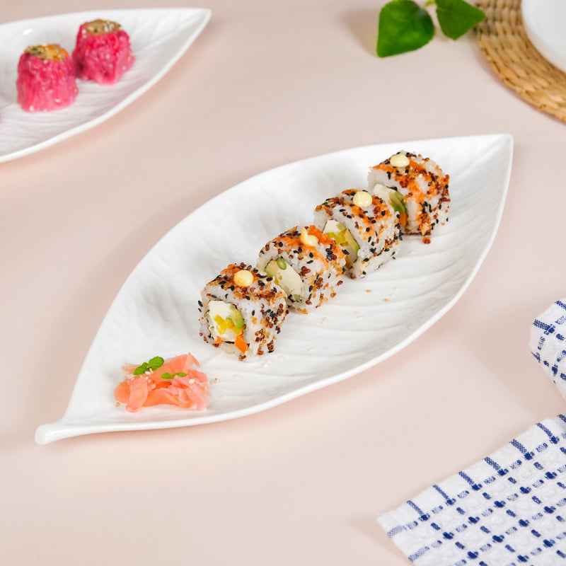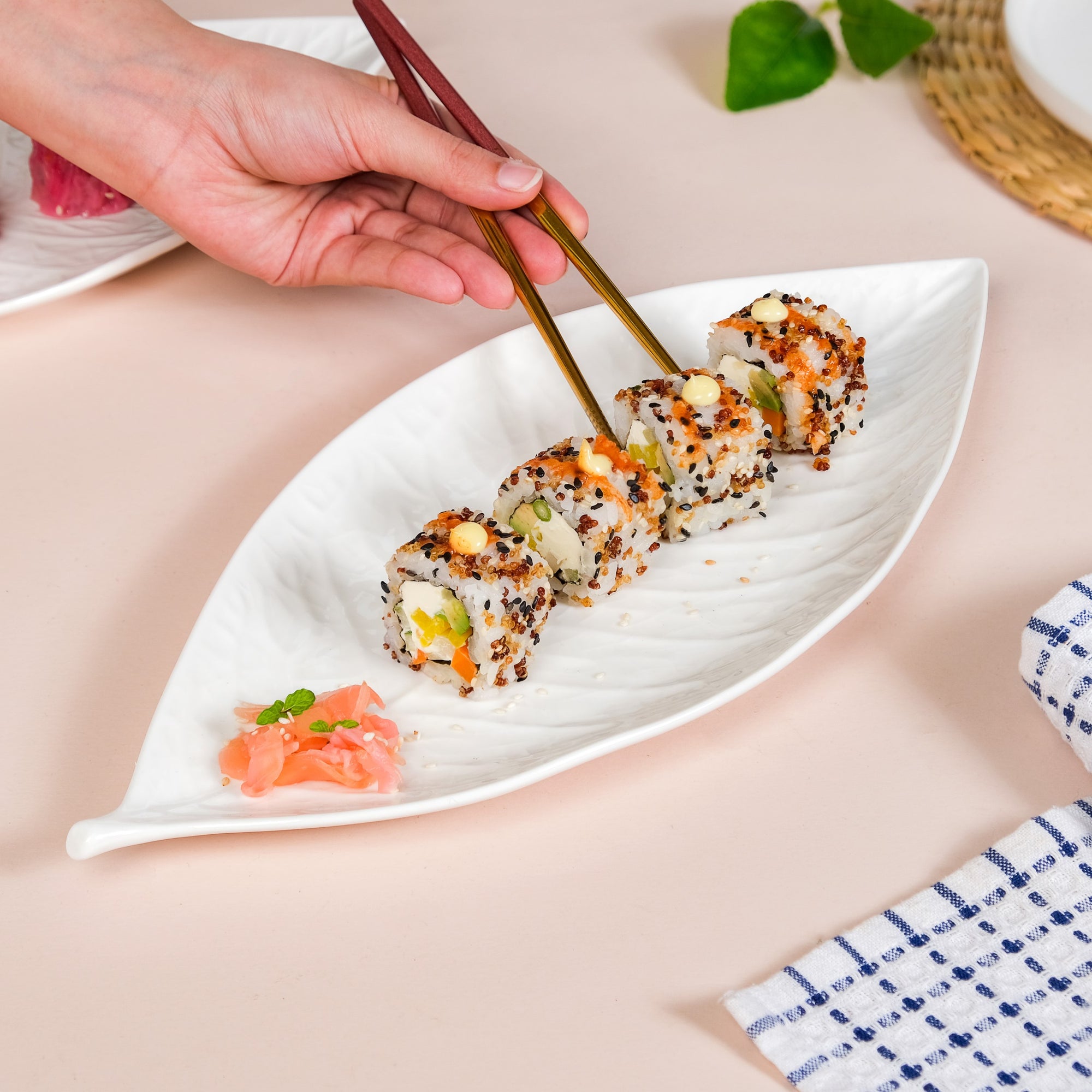 Design: Shaped like a delicate bay leaf, this platter features intricate textured leaf vein designs that bring a touch of nature’s elegance to your table setting. Its sophisticated form adds a refined charm to any meal.