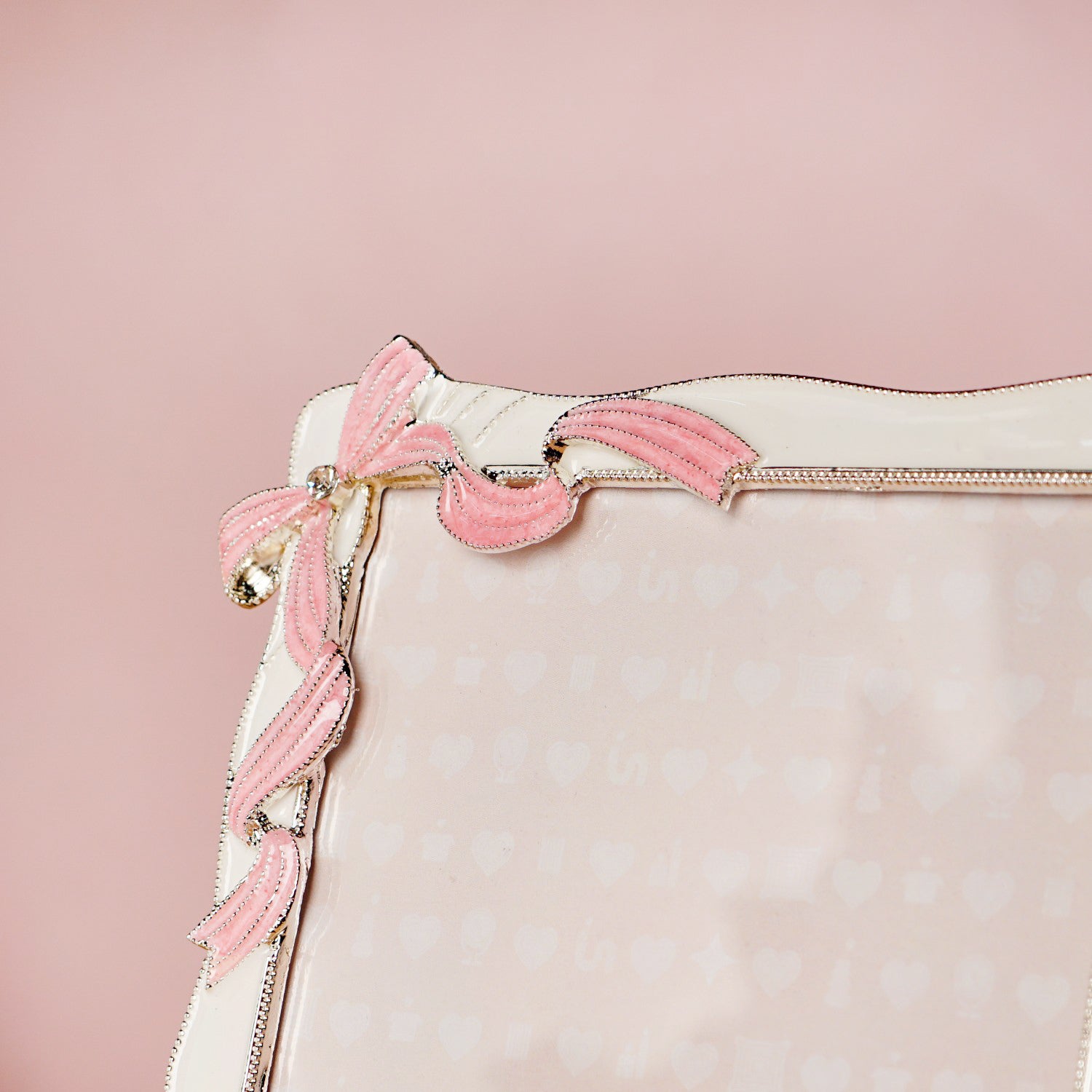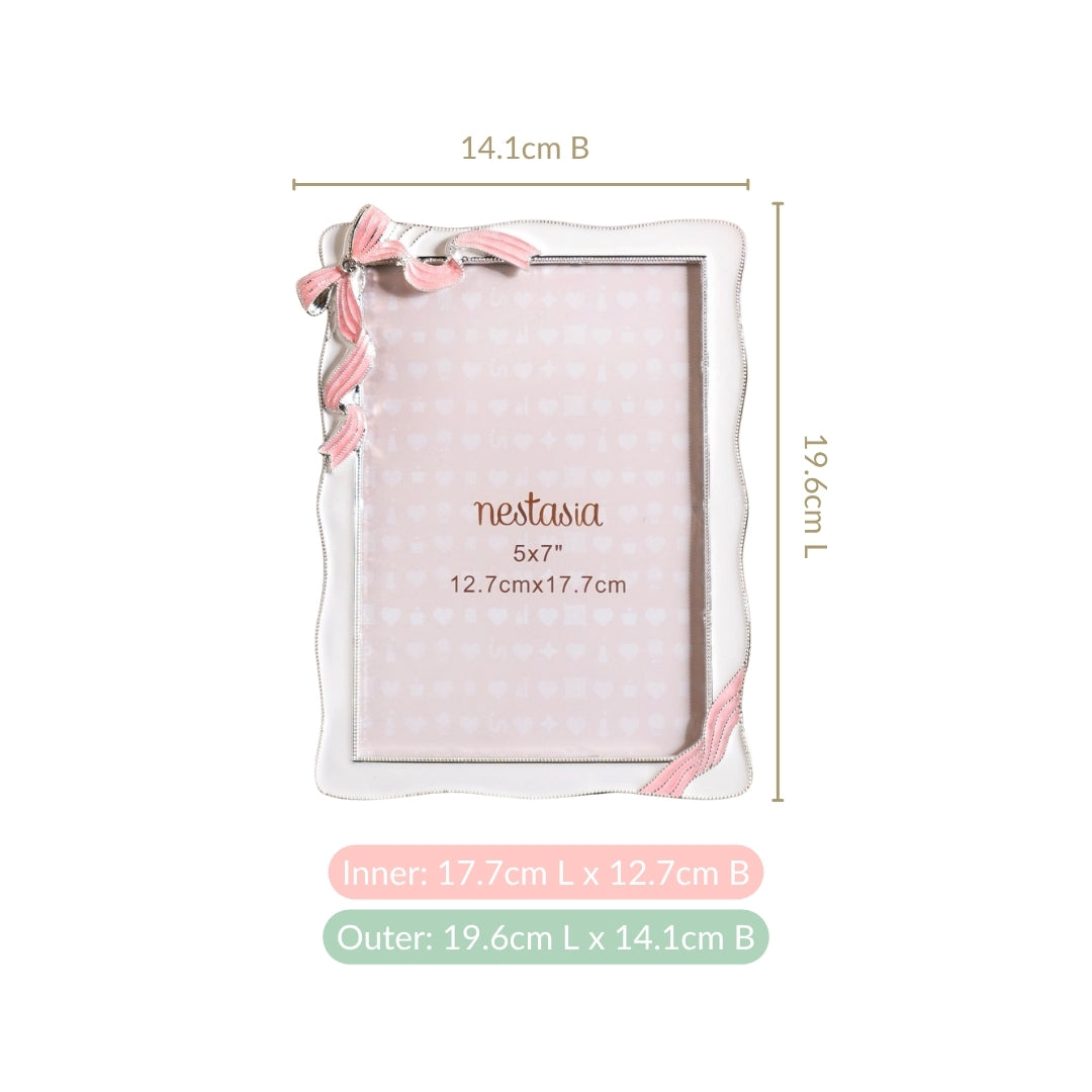 Design: This frame presents a truly charming aesthetic, featuring a sturdy frame with silver wavy edges and a delightful pink bow and ribbon embellishment. The elegant details and sleek rectangular shape create a captivating border for your photo. Your image is perfectly preserved behind a crystal clear acrylic frame, ensuring optimal clarity and protection while enhancing the frame's overall delicate appeal. This frame is perfect for displaying 5x7" photos.