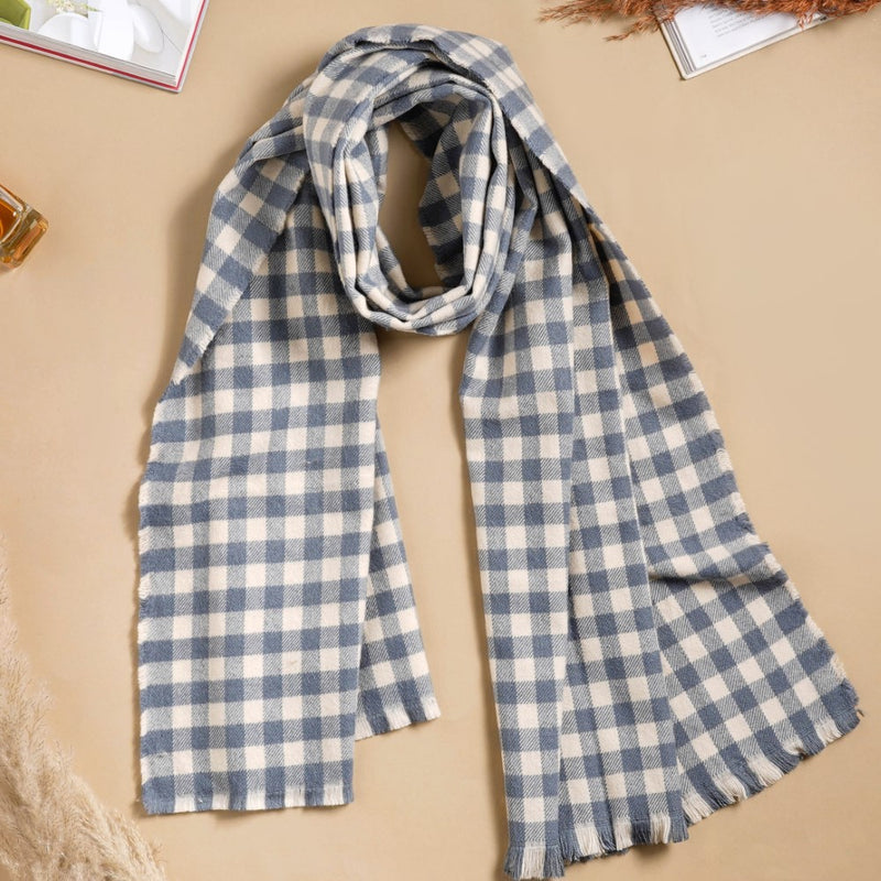 The white blanket scarf features large blue chequered patterns that can go well with casual flannel shirts and jackets. The simple yet attractive chequered patterns of the winter scarf make it ideal for both casual and formal winter outfits. Pair the ladies' scarf with blue or black blazers and overcoats to create a sharp, formal winter look. Along with the fashion quotient, the blanket scarf is highly functional in keeping one warm and cosy during chilly winter days.