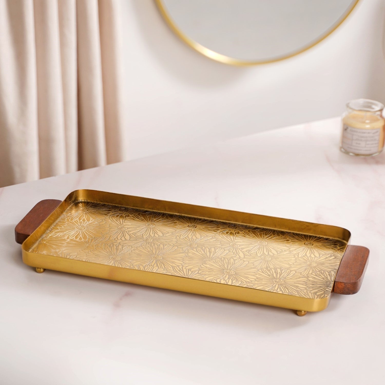 Design: Finished in gold, this metal tray features an etched daisy design, adding a touch of artistry to its clean, sleek surface. The mango wood handles offer a warm contrast, providing both style and ease of use. Additionally, the tray features metal legs, giving it added stability and creating a gap between the surface and the tray to protect your table from heat.