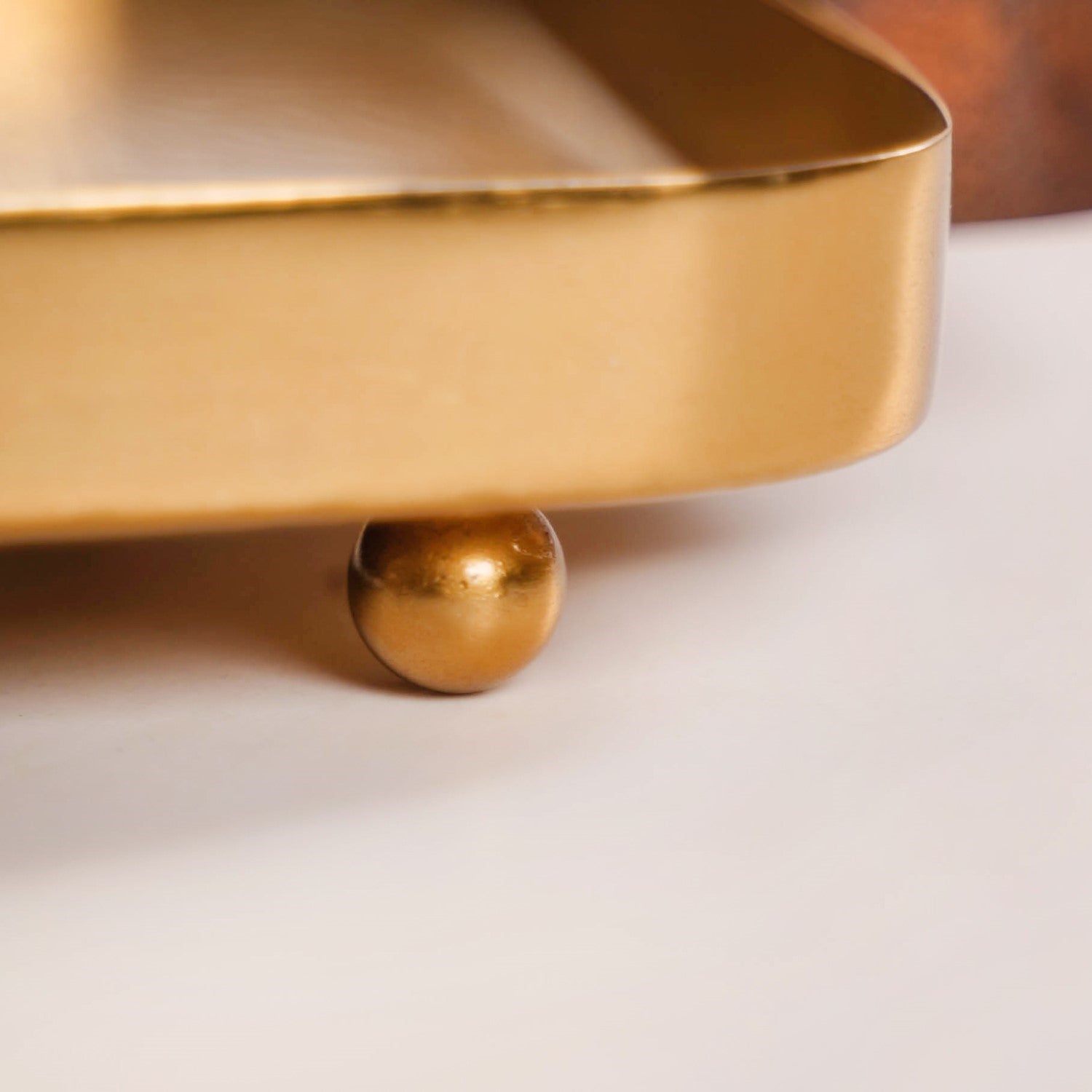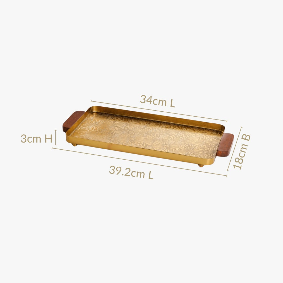 Benefits: Crafted from high-quality iron and sustainably sourced mango wood, this serving tray offers both durability and elegance. The iron provides long-lasting strength, resisting dents, scratches, and corrosion while maintaining its beautiful gold finish. Mango wood is not only lightweight and easy to handle but also a highly sustainable material, known for its resistance to wear and its eco-friendly nature. The combination of these materials ensures that this metal tray stands up to everyday use without losing its charm.