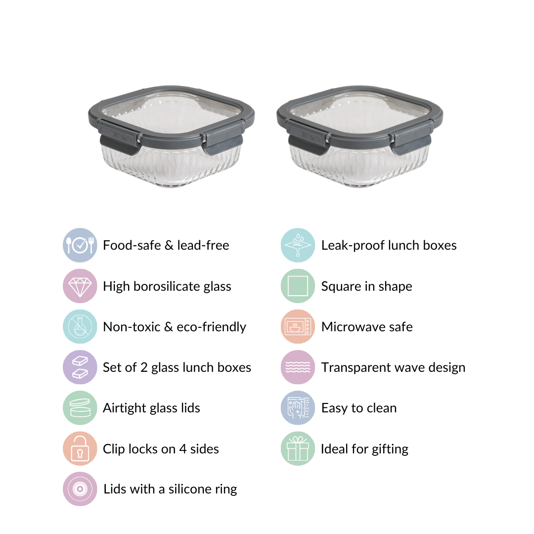Food-safe & lead-free High borosilicate glass Non-toxic & eco-friendly Set of 2 glass lunch boxes Airtight glass lids Clip locks on 4 sides Lids with a silicone ring or gasket Leak-proof lunch boxes Square in shape Microwave & stove-safe Transparent wave design Easy to clean Ideal for gifting